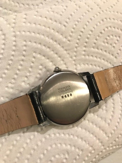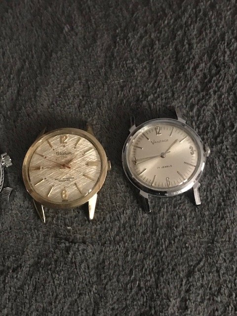 Finally on the right we have a real clean '50's men's size Vantage by Hamilton. Manual winder that runs great and presents very impressively with a perfect dial and hands, and nice clean case with no big scratches or dings. This and the previous Waltham both run on the larger size which is unusual for their vintage.