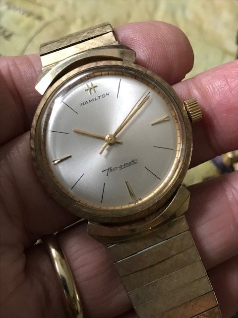 Anyways on the upper left we have a Vintage Hamilton Thin-o-matic with snazzy deco lug treatment that runs as good as it looks. Never polished and looks much better in person than in my crappy pictures. Nice large men's size and has an inscription on the back side. Absolutely no wear to the gold filled case and for sure will brighten up with a quick rub with a jeweler's polishing cloth. Way cool florentine textured bezel really makes this baby stand out and mint clean dial.
