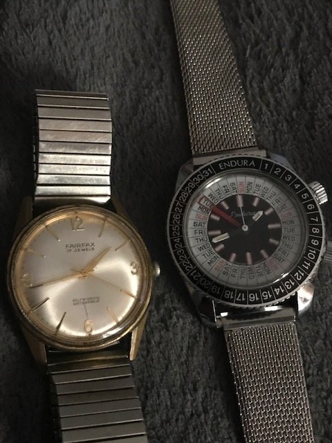 Next to the Fairfax is an Endura twin-crown manual wind beauty with rotating bezel. She presents practically unused and super sharp. Runs some days and others not. Don't use it to time critical events unless you want to play serviceman and oil her up first.