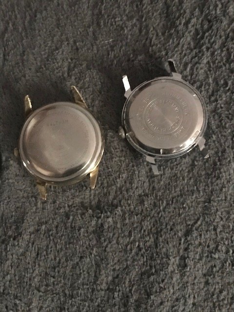 on the left we have a Fairfax 17 jewel swiss made automatic honeybunch with screw down back and nice clean dial and hands. Runs good too. Fairfax...when only the best will do.
