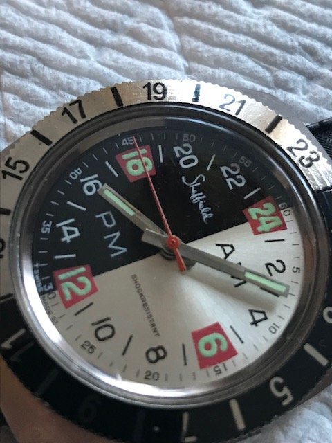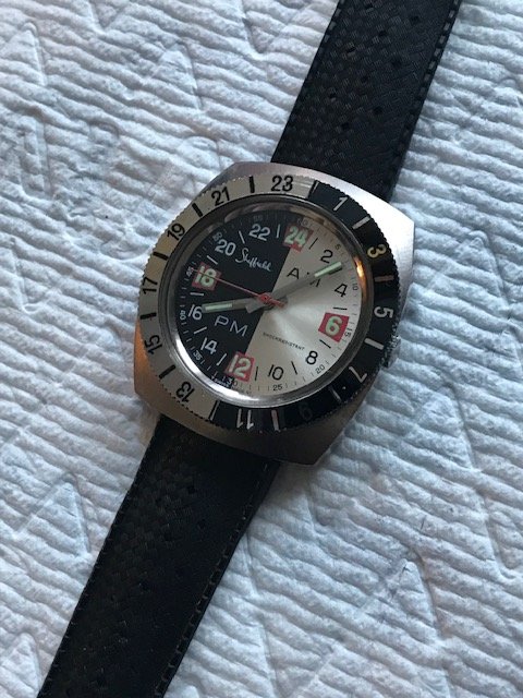 Next from the dive shop proprietor is this big funky looking manual wind 24 hour watch that is also a blast from the past and in almost unworn condition. Not exactly a high end brand but the thing has a very cool look, is jumbo size and runs well. Has a rubber 22 mm "Tropic" strap which is also in practically unworn condition and the rubber is as supple as the day it was made. Be the talk of the town with this exotic beauty on your wrist!