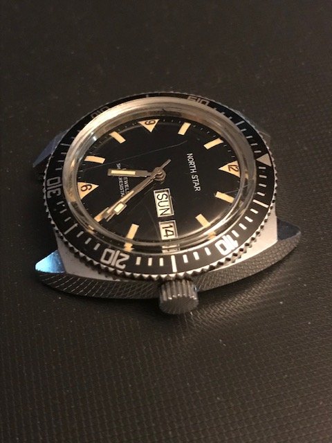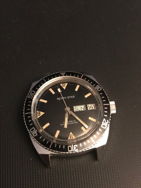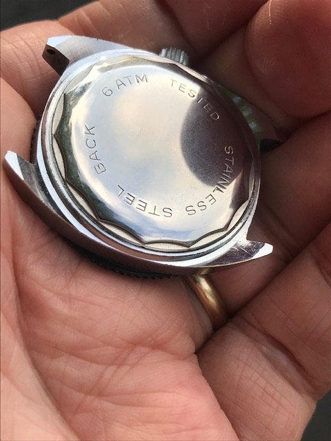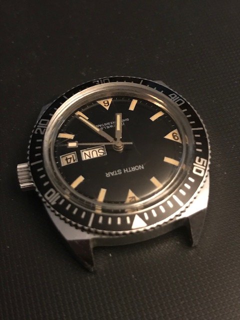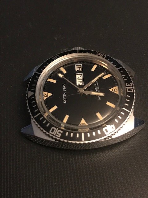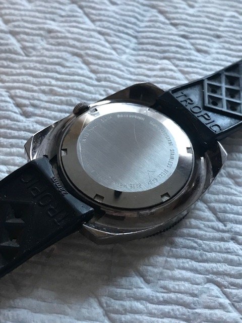 So first up and all the way from Moalboal Philippines is this pristine unmolested '60's manual wind diver. My wife's sister found this in one of the old time dive shops along the road to the shore. The proprietor of the shop said it has been in one of the cabinets there for decades and forgot all about it along with the next watch I will describe. From what we can see the watch was not worn much at all and chances are never opened. The acrylic crystal has light scratches that will certainly buff right off and the rotating bezel is near mint. Dial and hands are pristine and any imperfections are on the crystal. The watch fires right up with the first twist of the crown and runs great, keeps good time too. looks to be around 36mm without crown. Says "France" on the bottom of the dial but surely has a decent 17 Jewel Swiss movement in it. I haven't tried to open any of these watches aside from using my ball rubber opener which doesn't usually work and didn't with these, but I guarantee they are as they came from the factory.