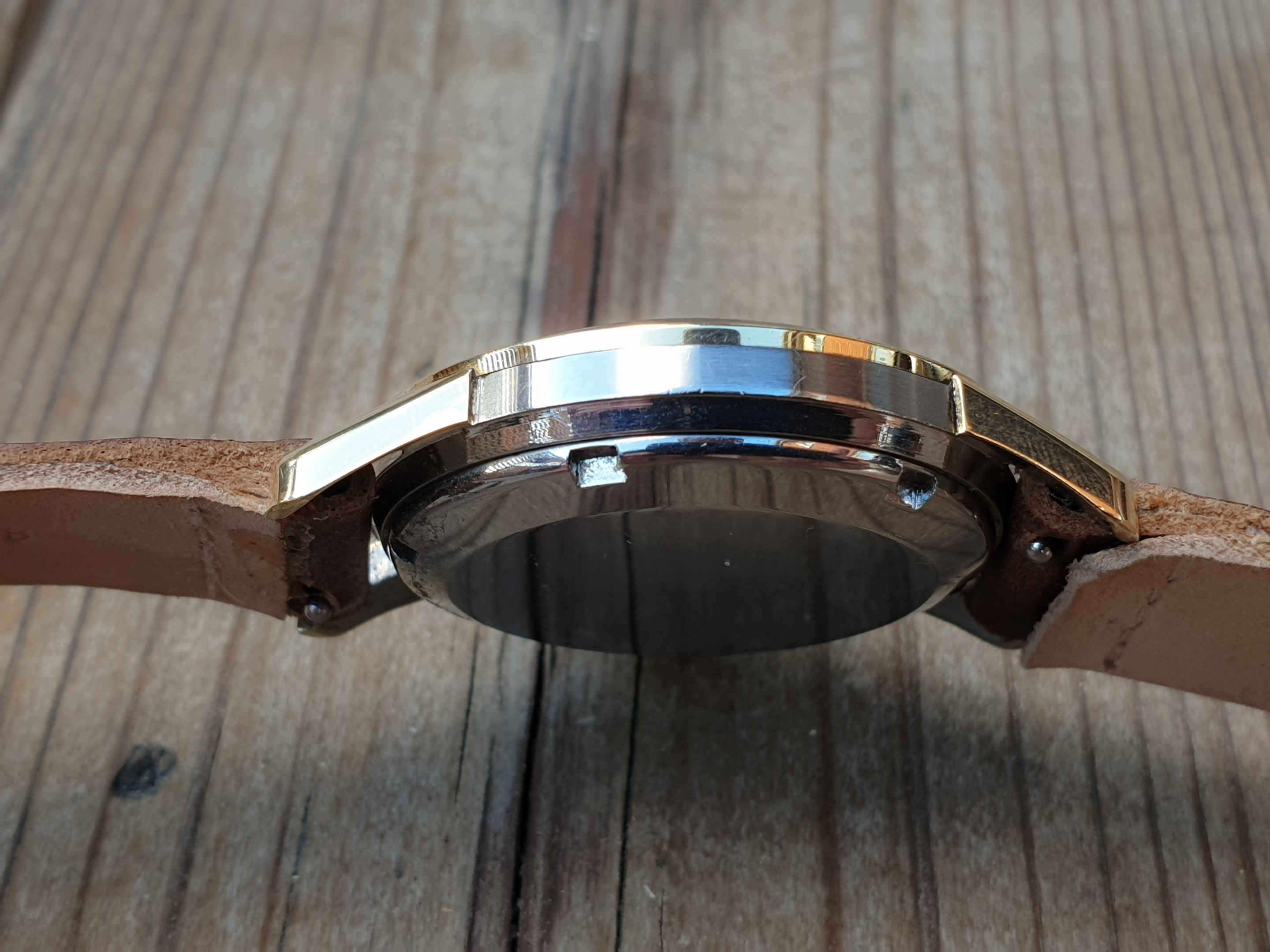 Case: Very nice crisp looking case with thick and wide solid gold bezel on top . Measuring 34.7 mm without the crown. Unpolished.