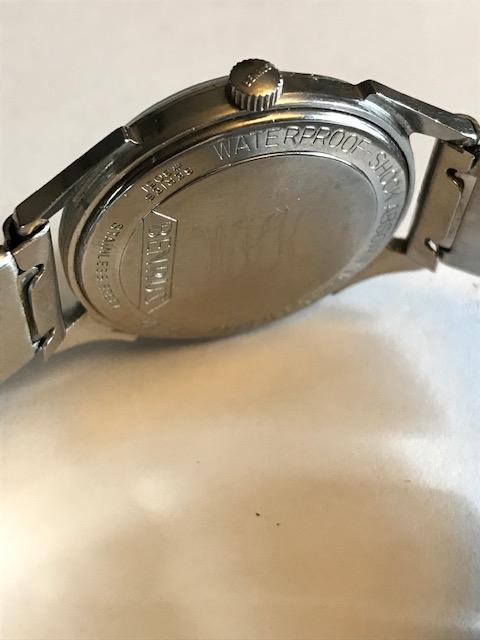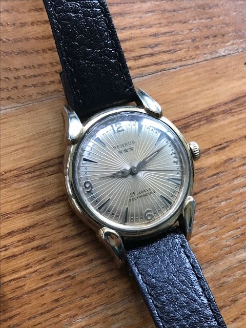 The 4th and last Benrus is this way cool '50's Snazzy men's stainless hot rod with neato deco numerals. Another super good runner with a nice clean dial and has a West German stretchy bracelet on it. Signed original crown and the acrylic crystal has a minor stress crack near 12:00 that's hard to see in all the pictures and not super noticeable on the wrist. Light stylistic engraving on the back "WKK". Obviously was a man of taste and means this WKK fellow.