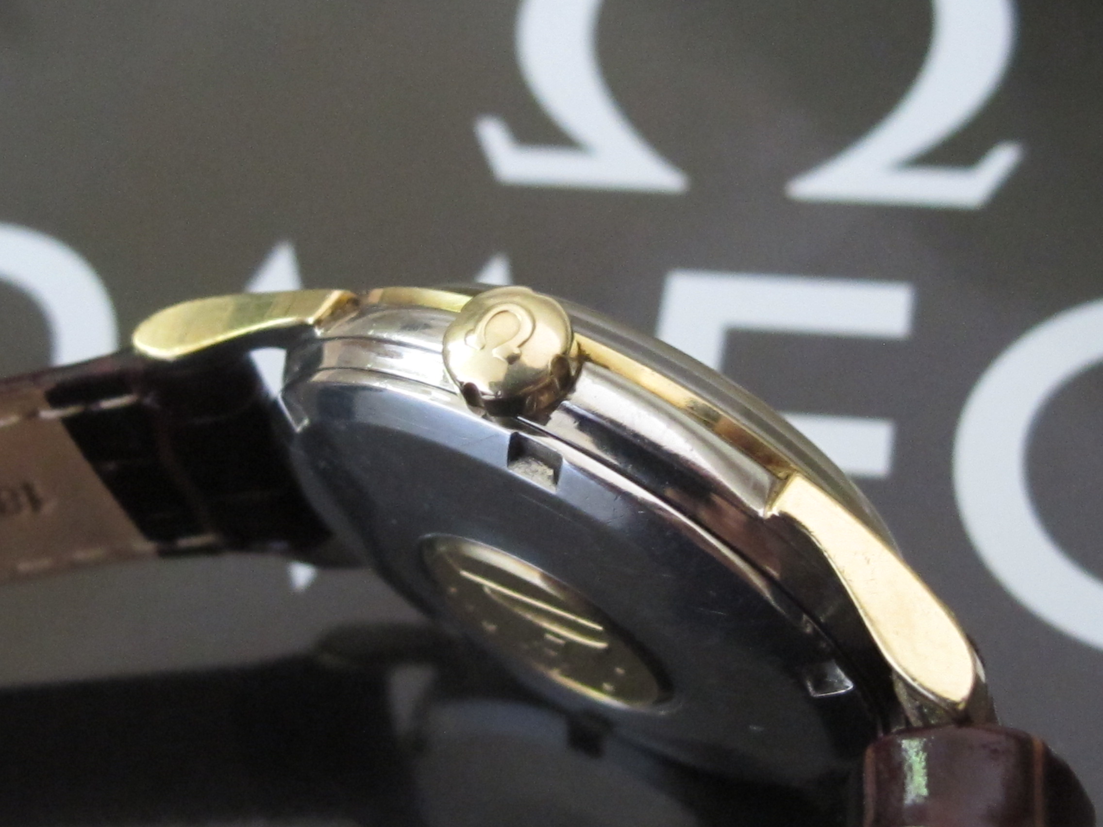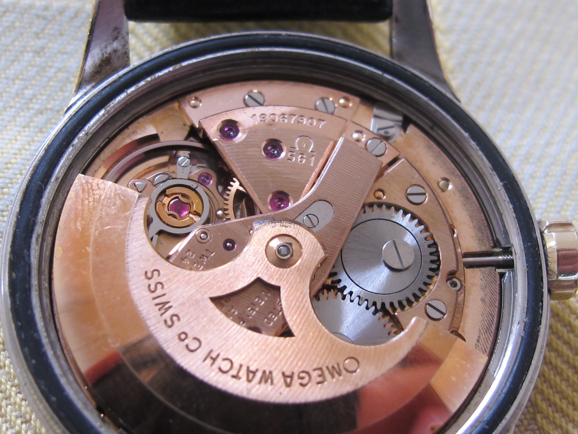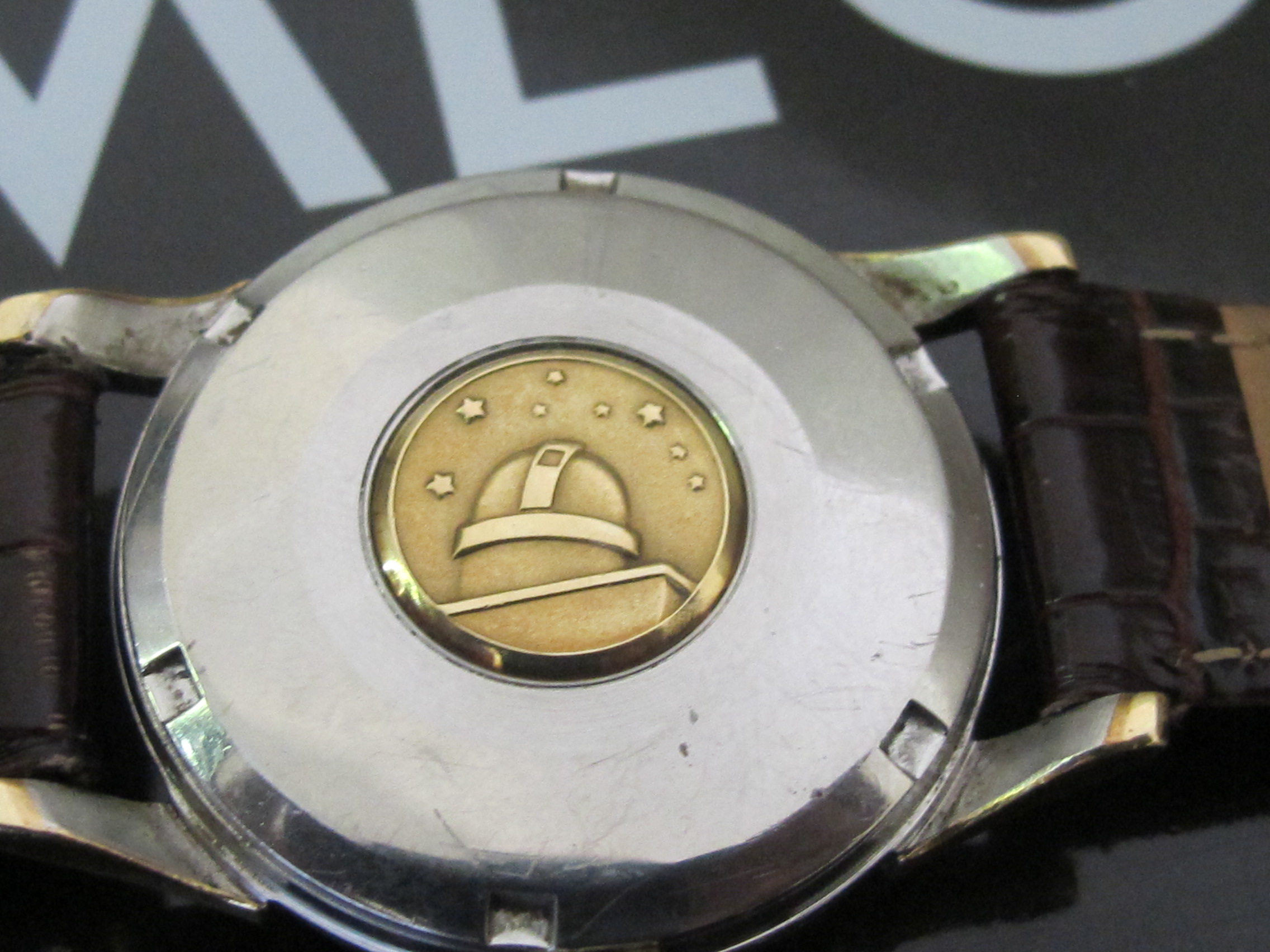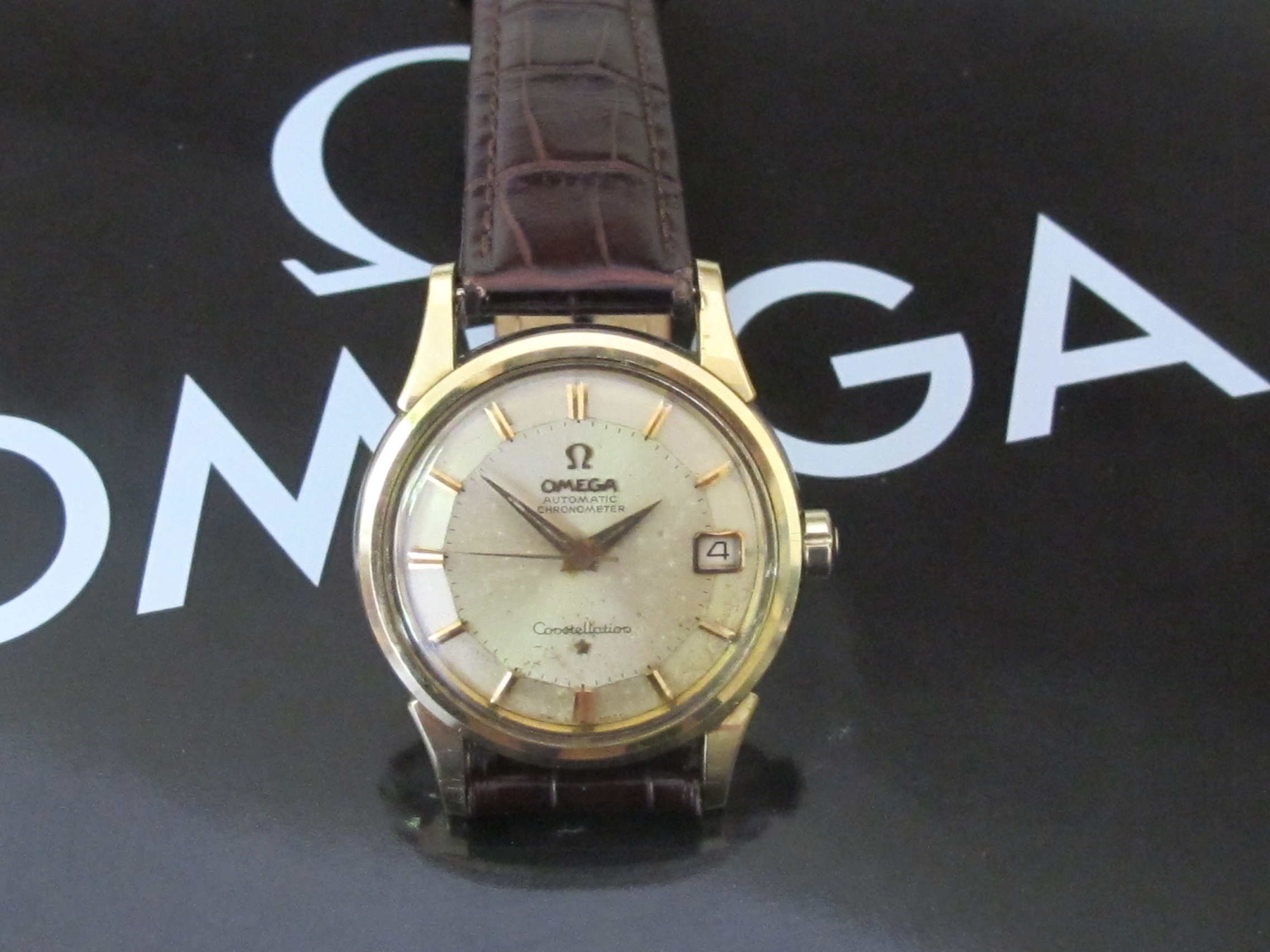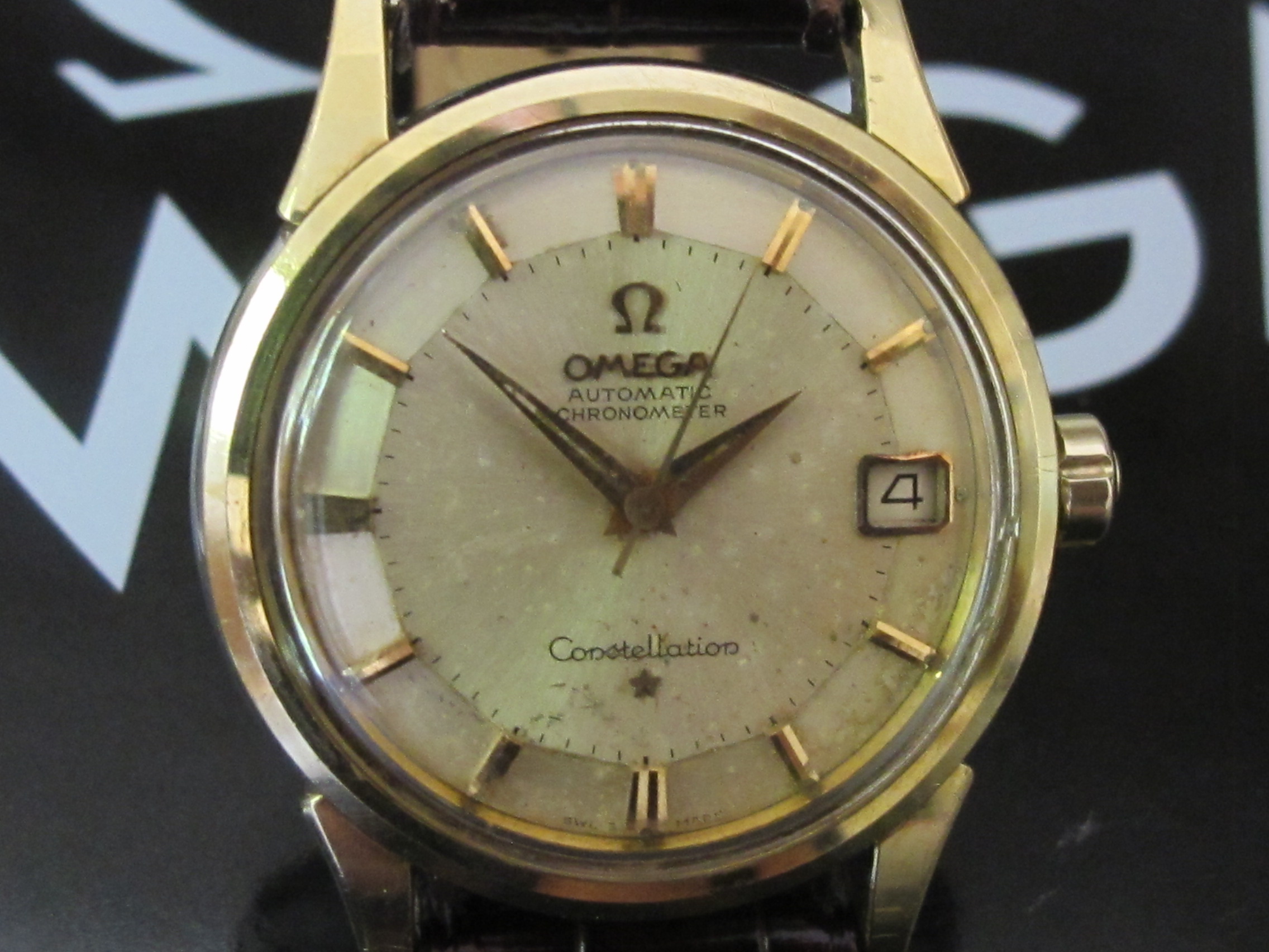 ·This Constellation Pie Pan Ref 14393-61 has an aged dial full of character, and therefore, I hope is fairly priced. It has the 14 K gold capped over stainless steel case with the very nice gold observatory medallion on the stainless steel screw back case. It has the correct crown and comes with a Caliber 561 movement that was serviced about 18 months ago and worn sparingly in rotation with other watches. The aged/blemished/charactered dial, depending on how you look at it, is clearly shown in its glory. It actually looks better to the regular eye.