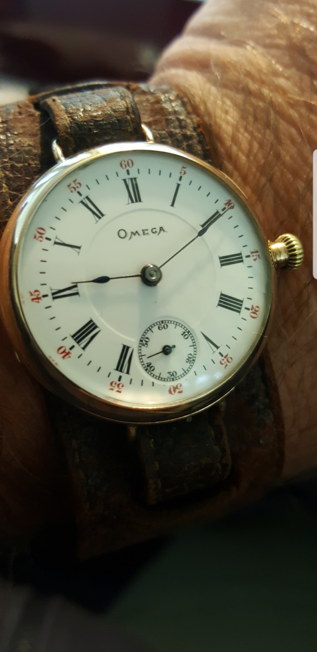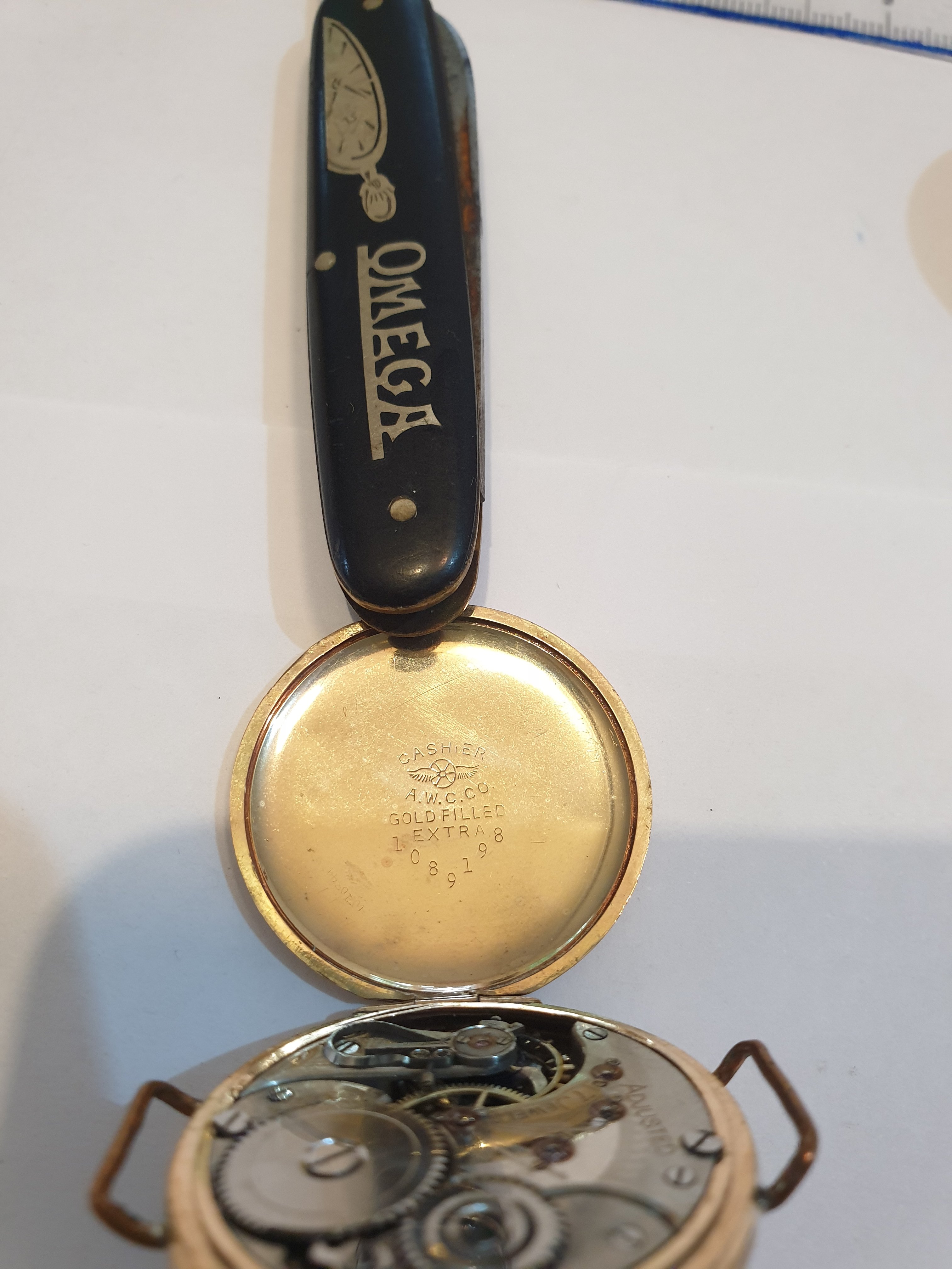 ·I'm reluctantly selling my Omega watch circa 1901 in original A.W.C. Co gold plated case. The micro regulator movement serial is 1938163 dating to around 1901. The sunken dial is absolutely stunning. Case is around 32mm-33mm excluding the crown.