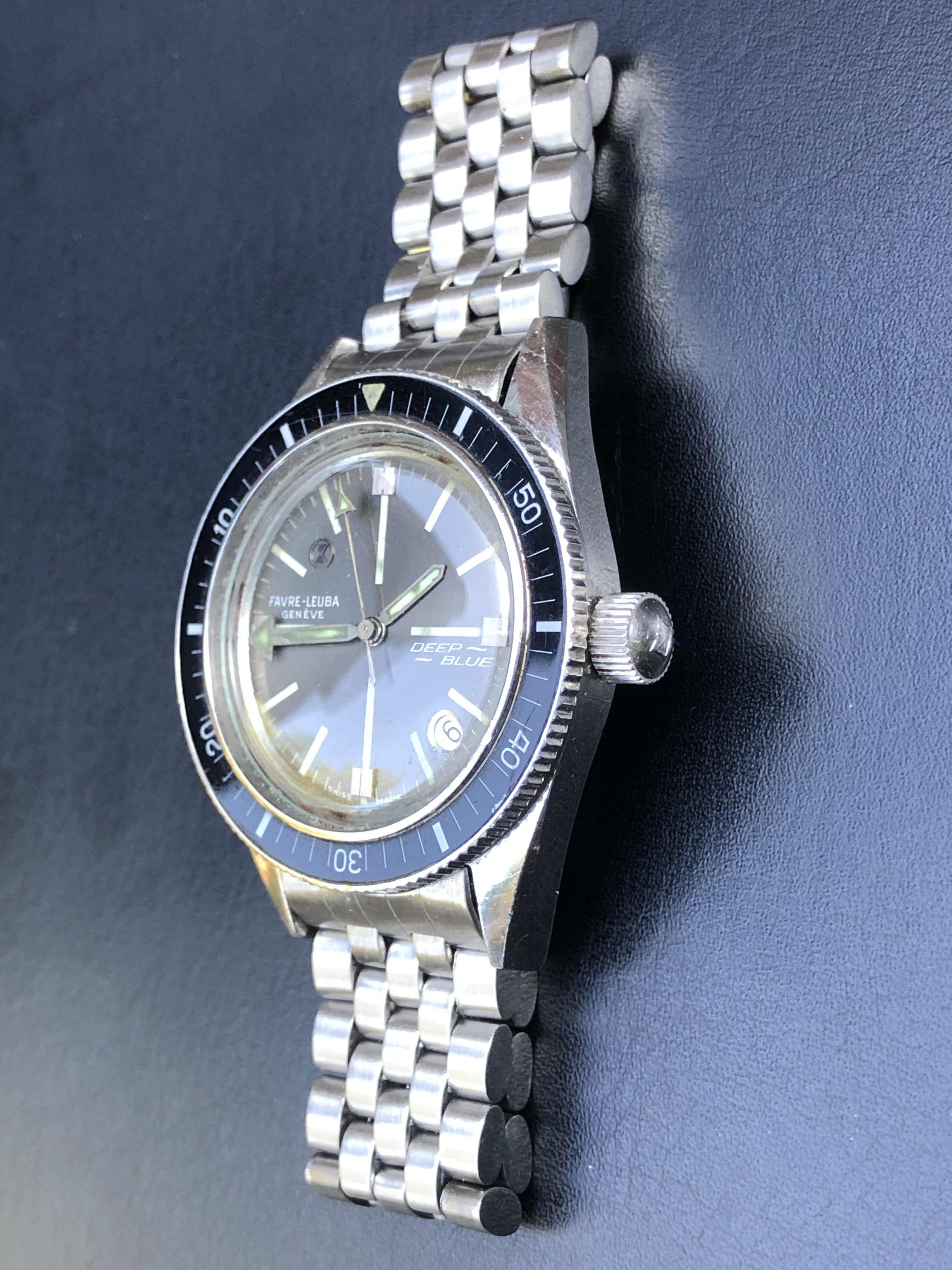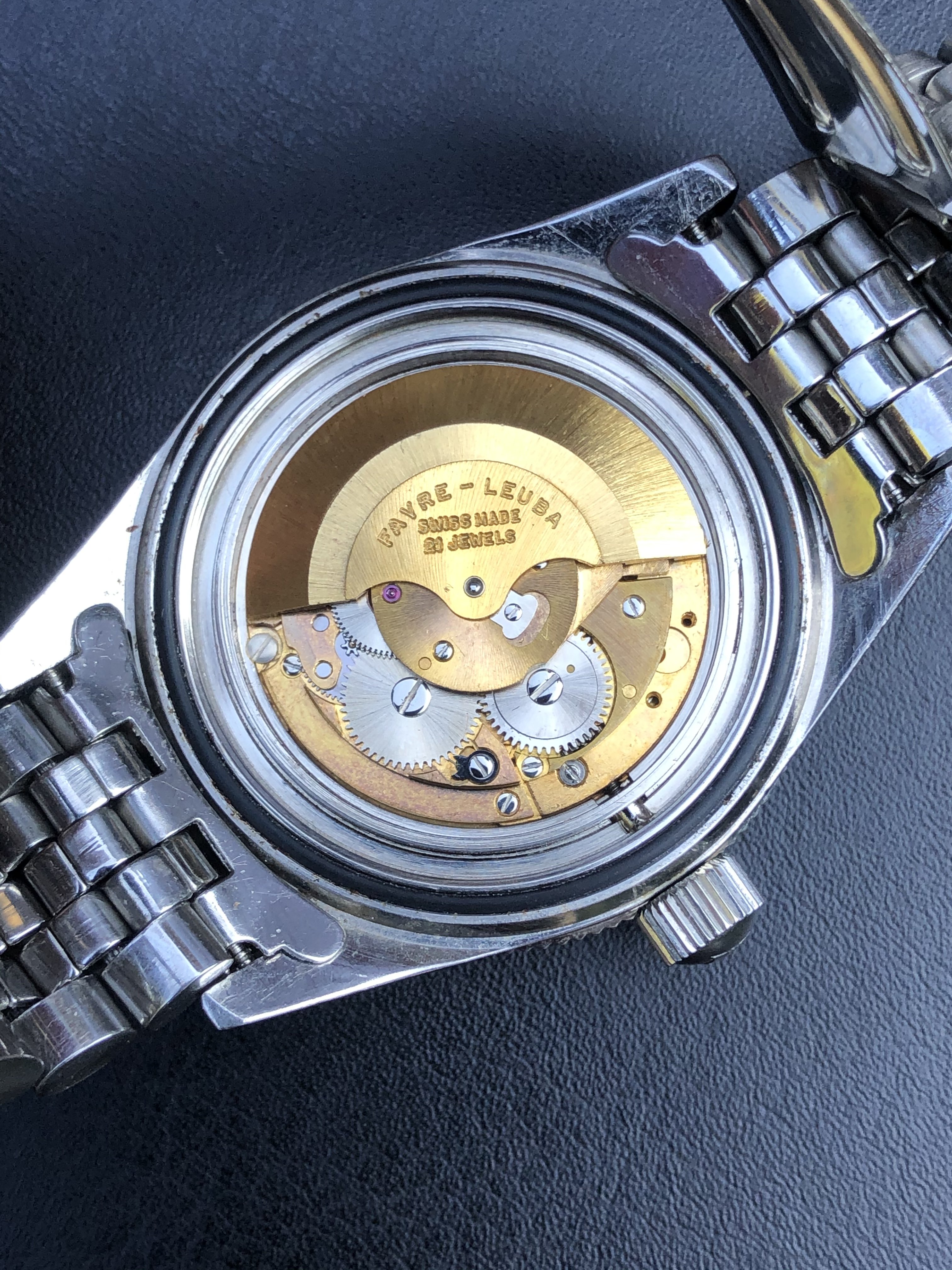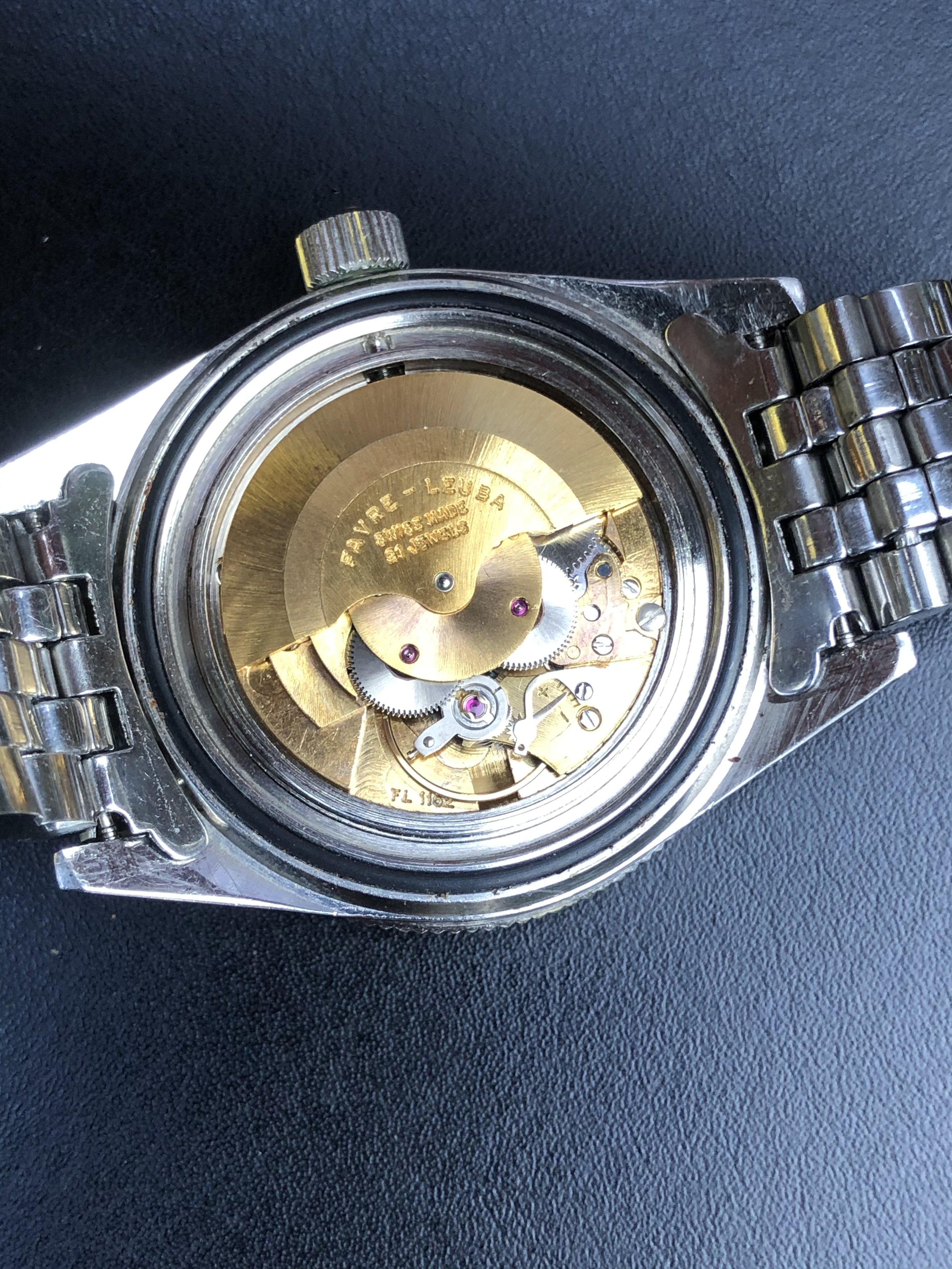 Mounted on a stainless steel Favre-Leuba bracelet. The bracelet is not original to the watch.