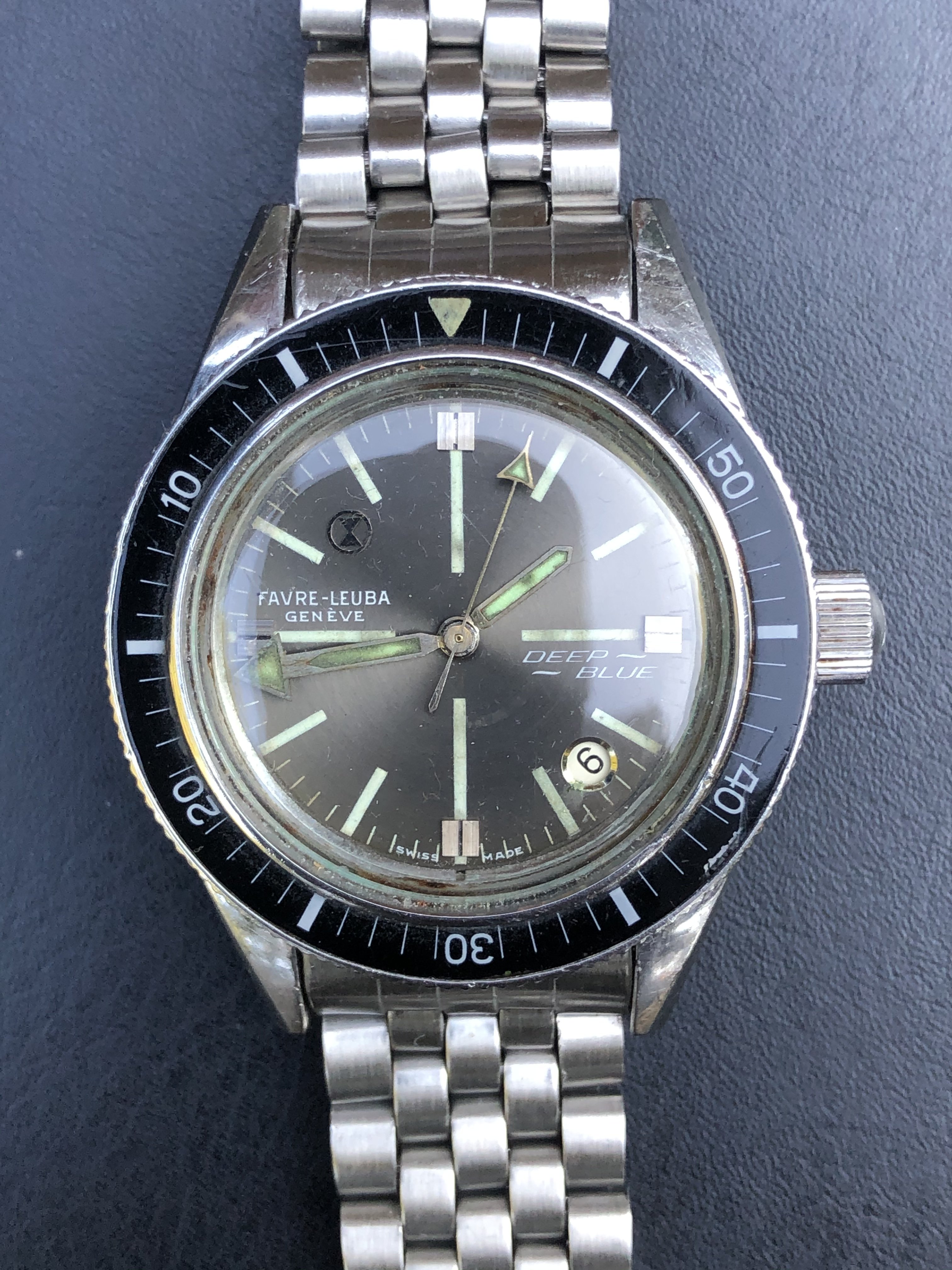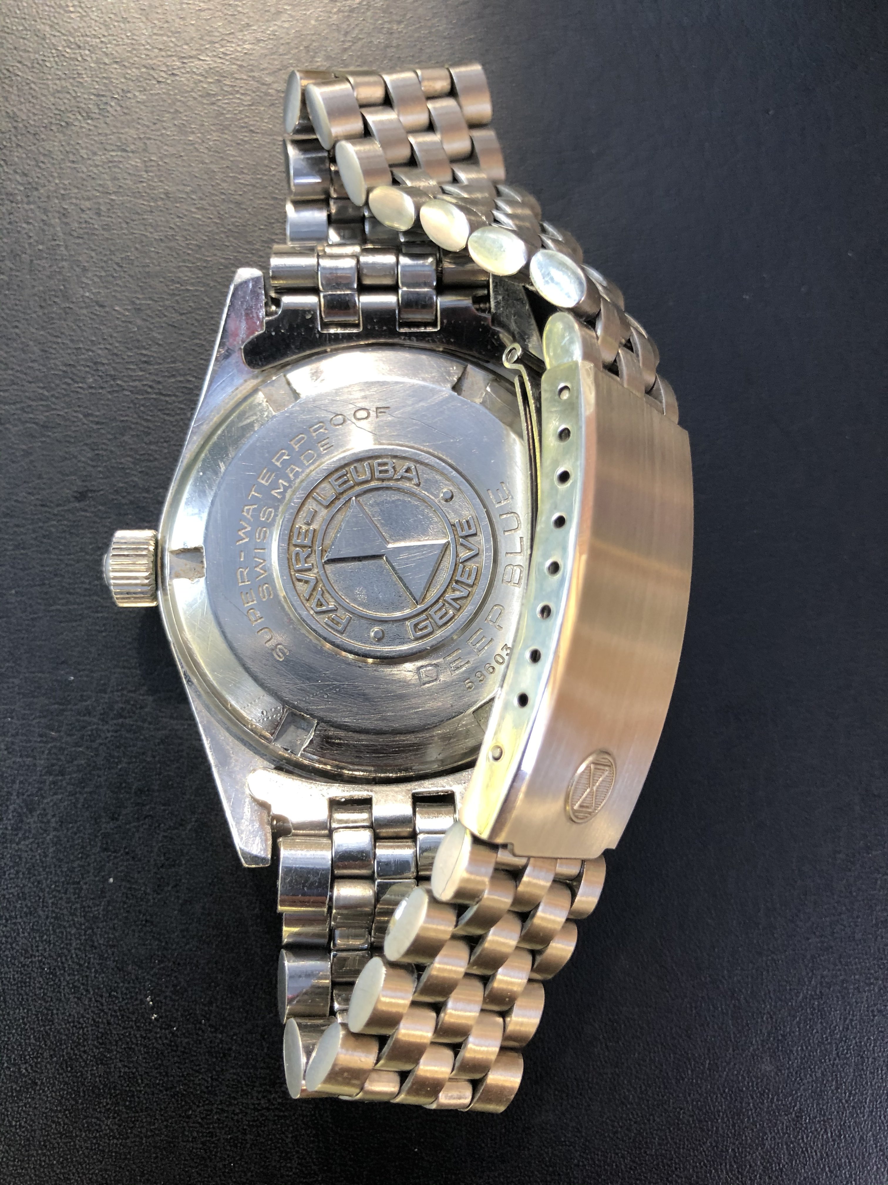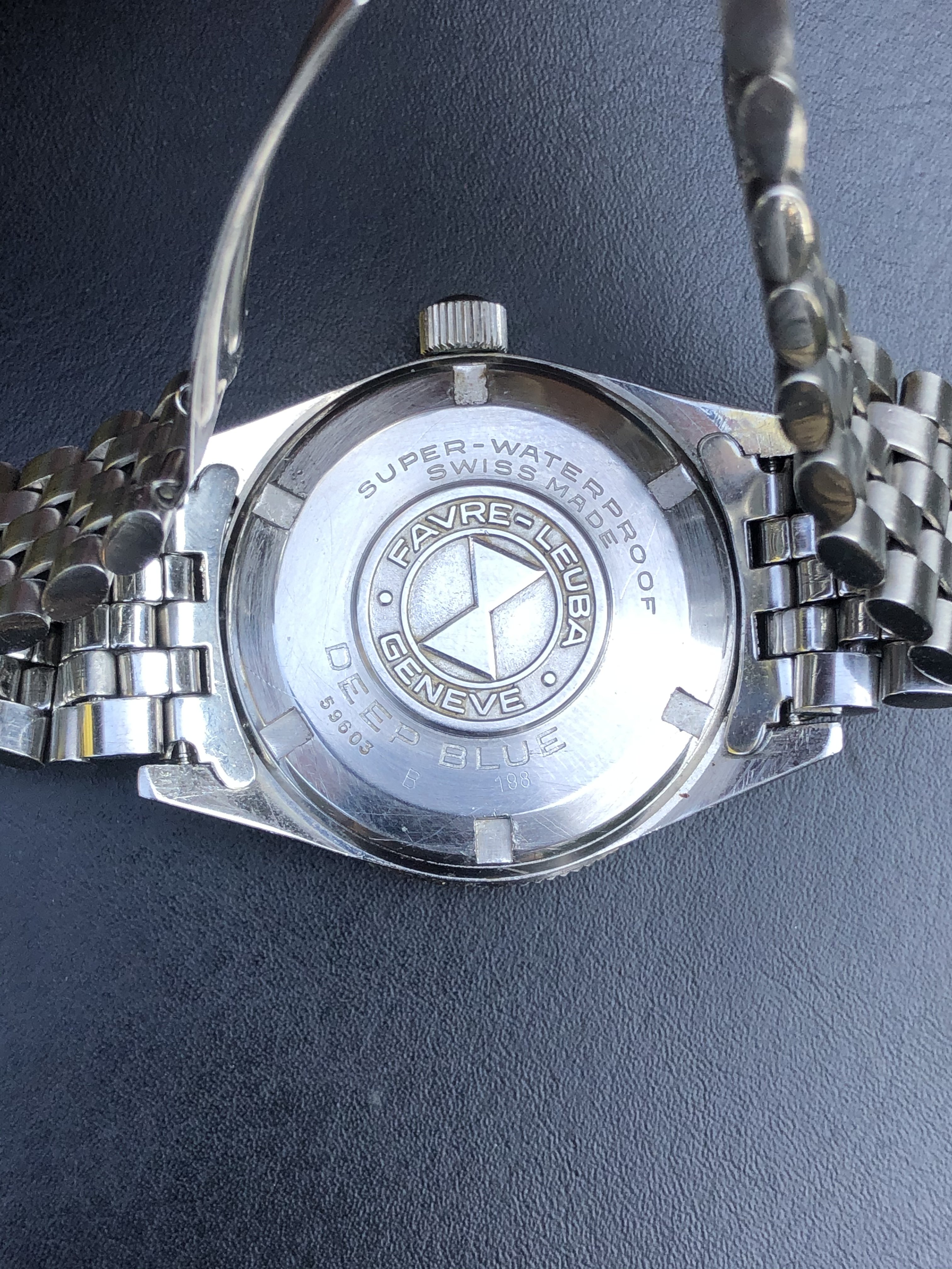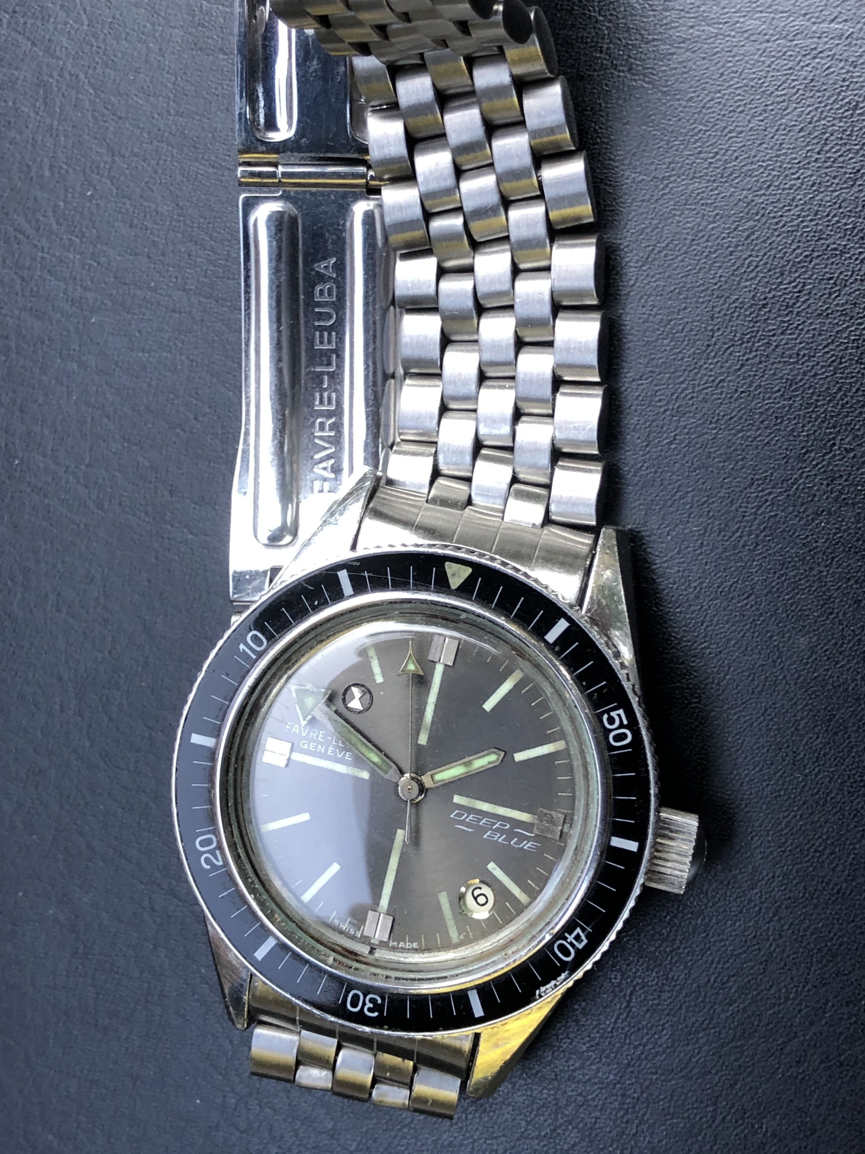Mounted on a stainless steel Favre-Leuba bracelet. The bracelet is not original to the watch.