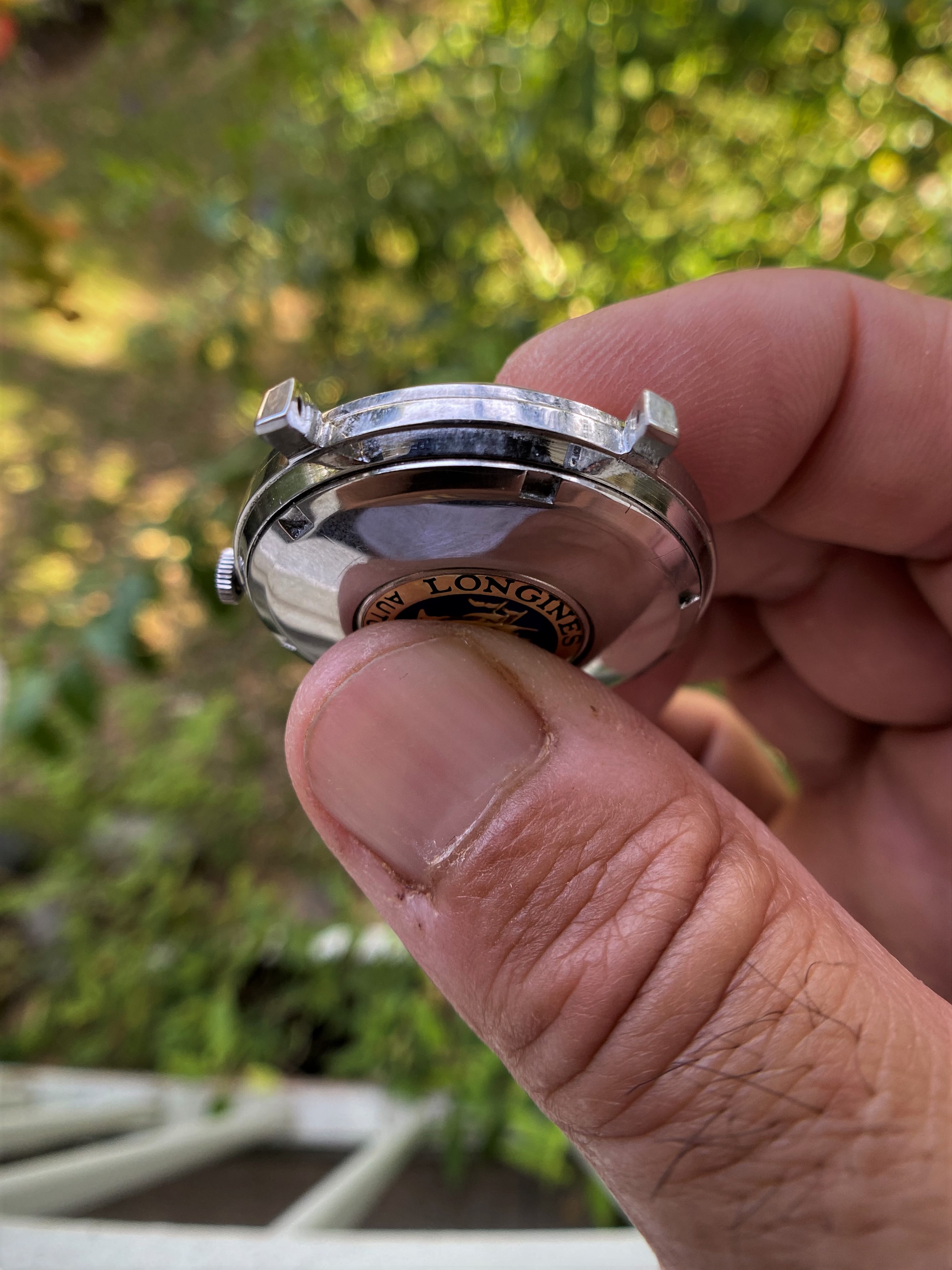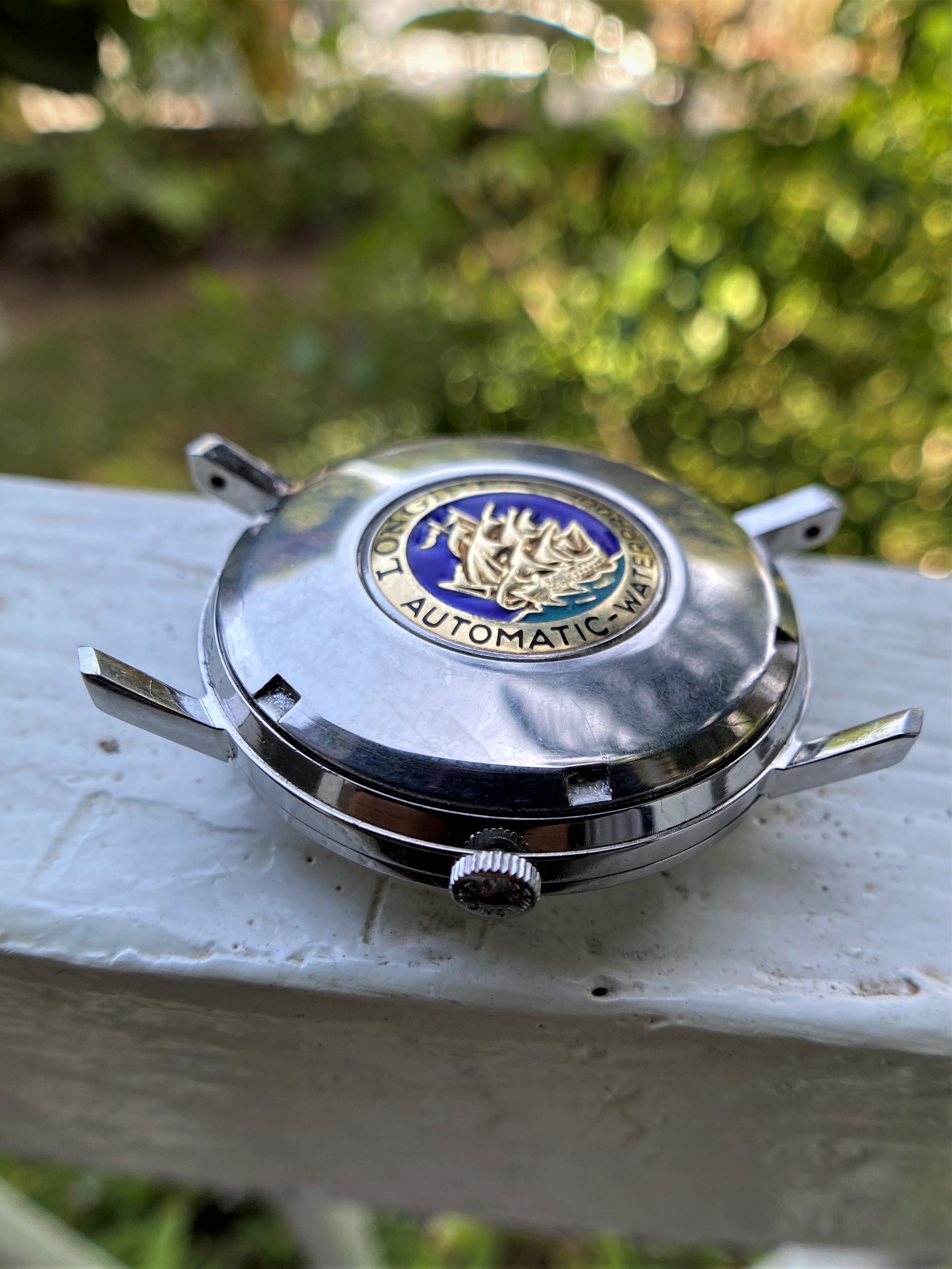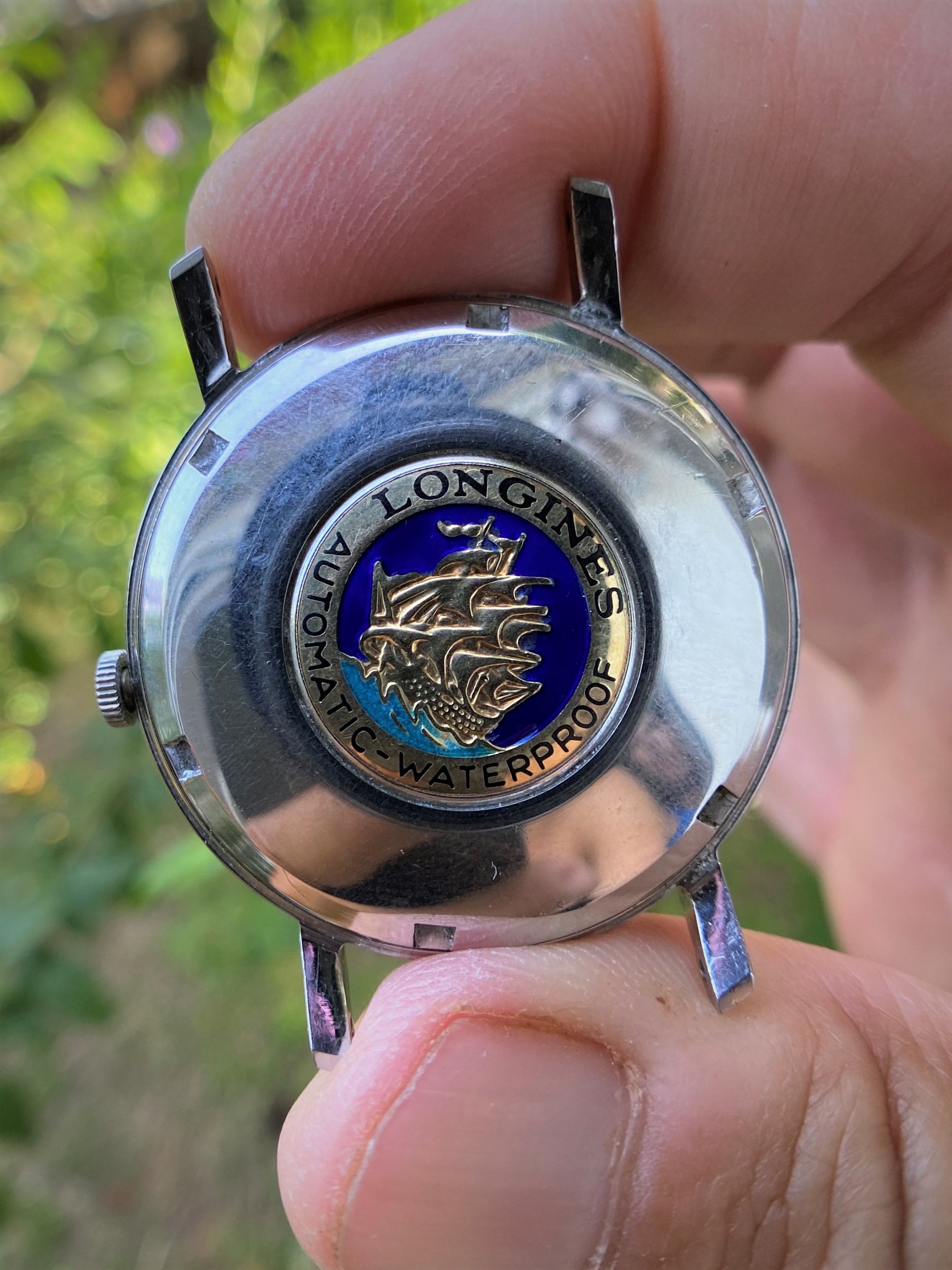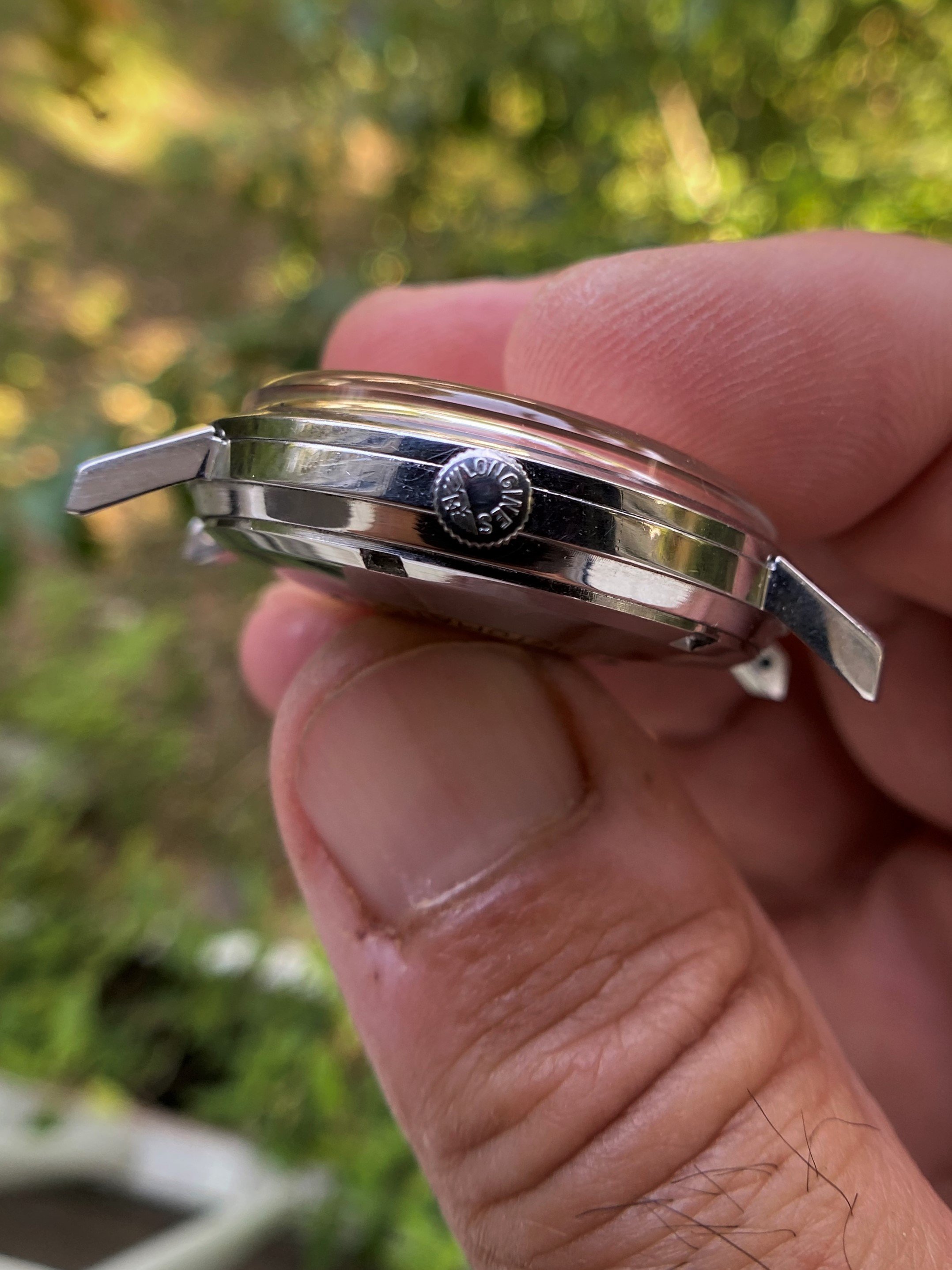 The case is approx. 36mm in diameter, not including the original Longines signed crown. Its swept back lugs raises the case slightly on the wrist emphasizing its size and overall presence. The case has obviously been very well cared for, seems to be an unpolished, still sharp case and lugs.