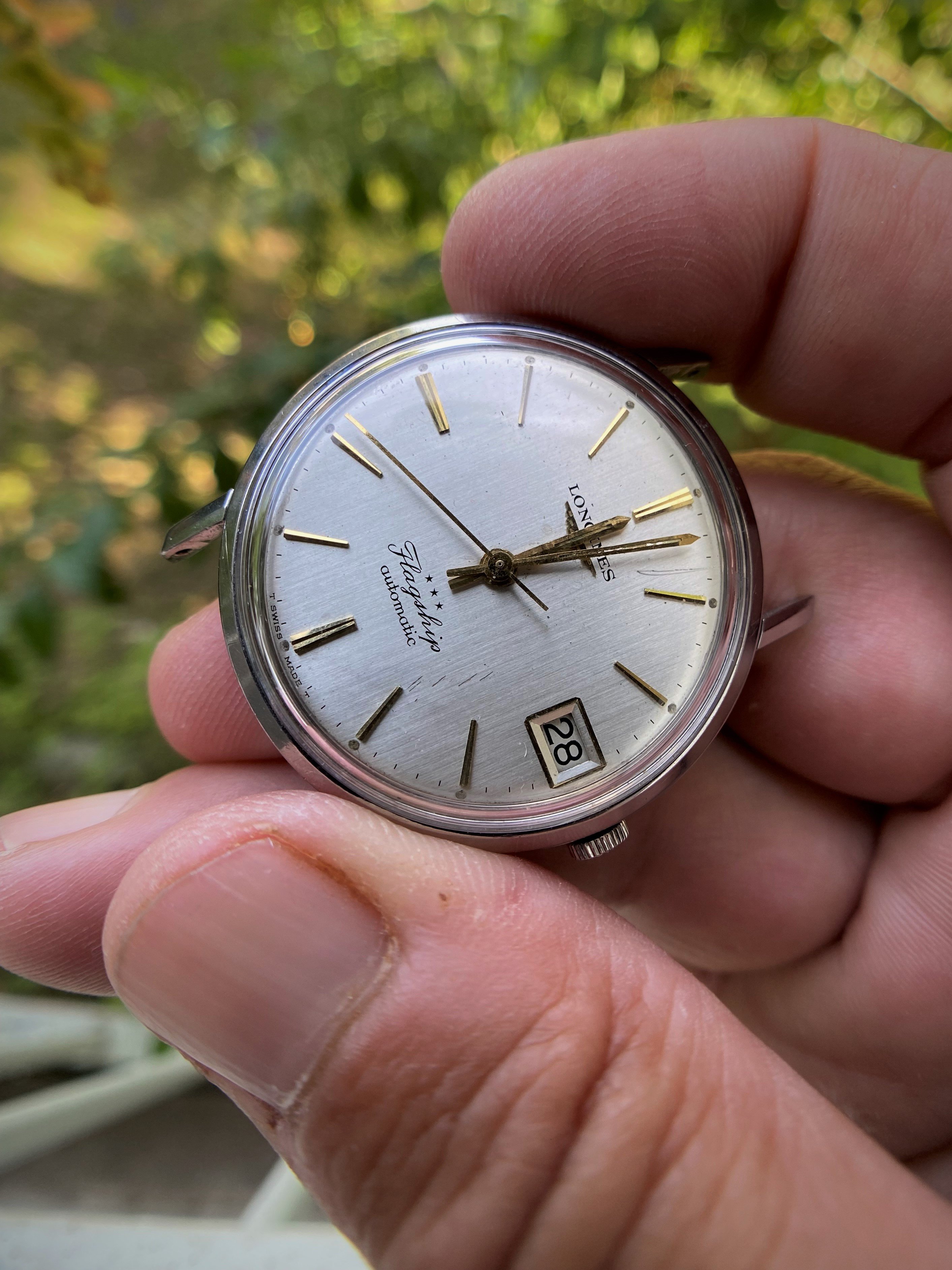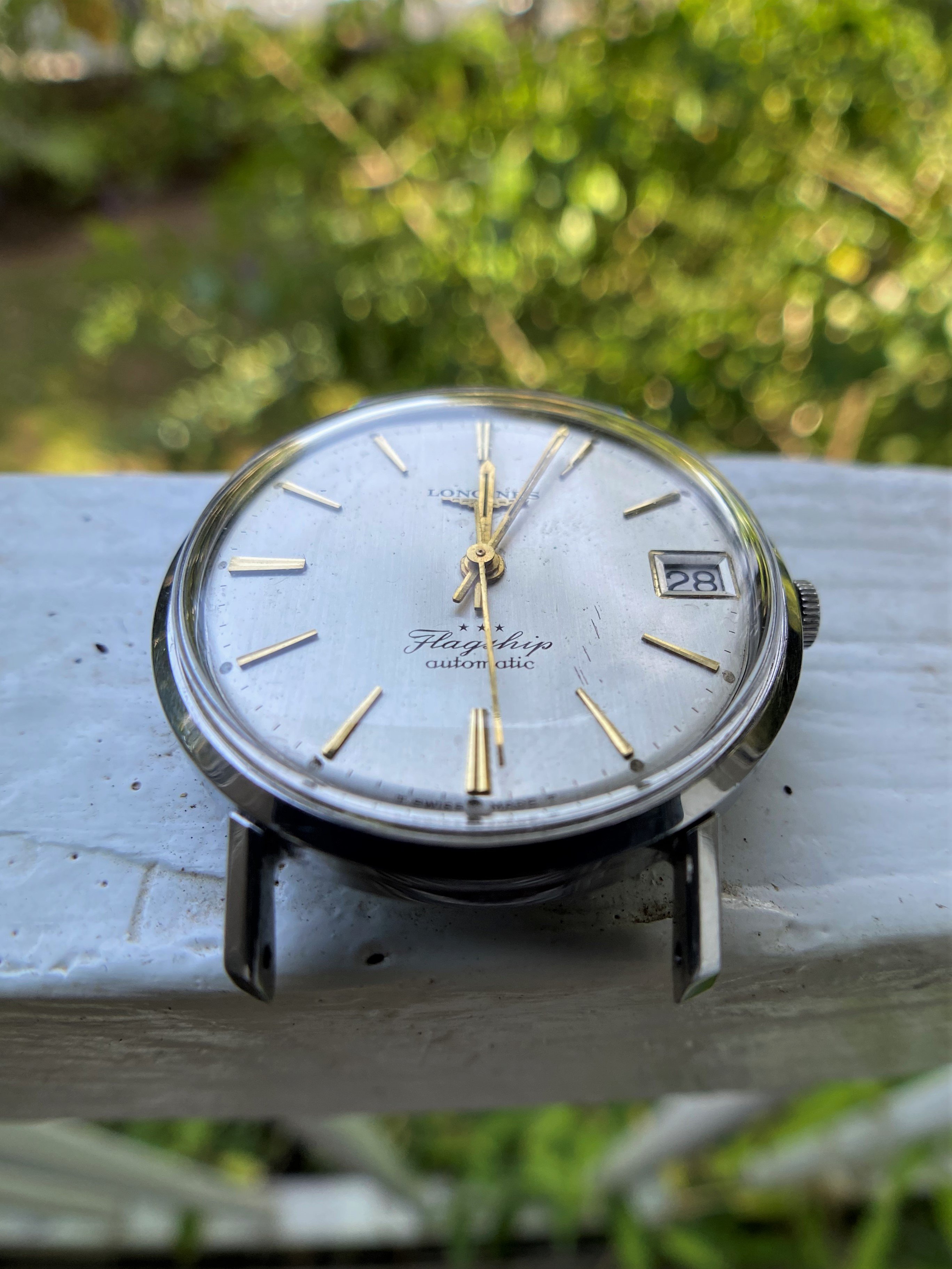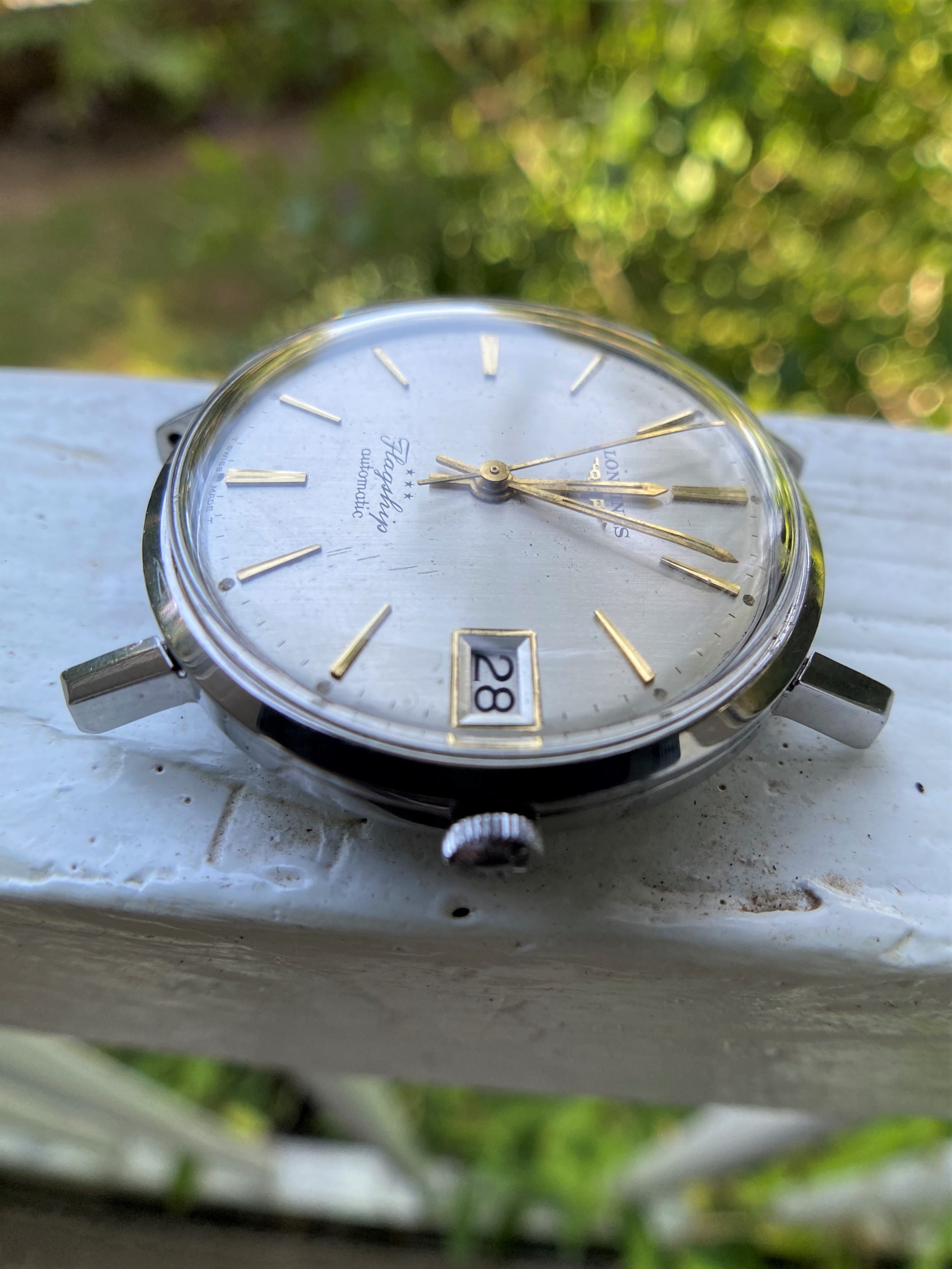 A lovely examples of a Longines Flagship with cream/gold dial and golden indexes. Original dial with some damage- scratches between the 4-5 indexes and a couple of dents between 5-6 and 10-11 (due to an accident while being serviced at my watchmaker).Original Gold hands in very good condition.