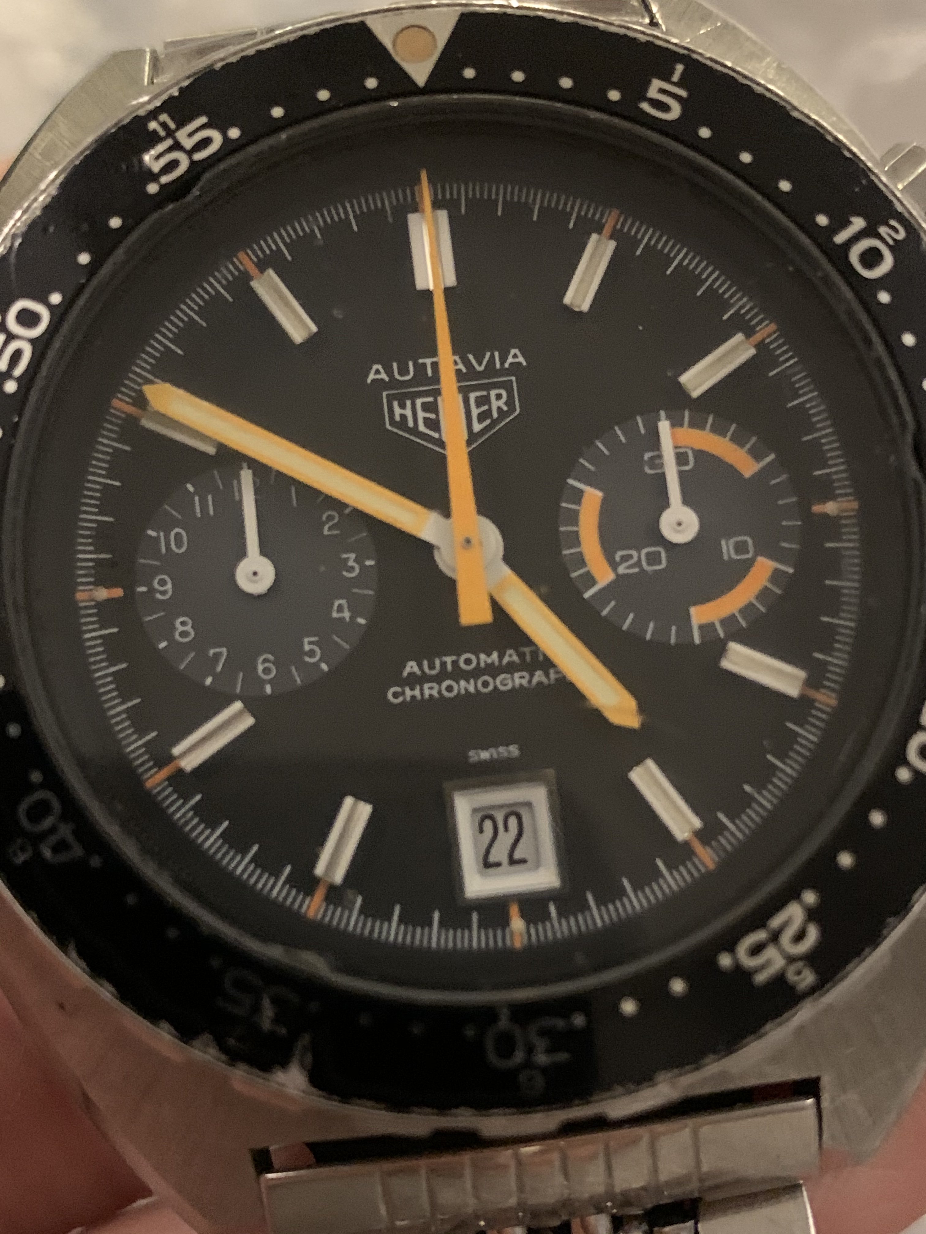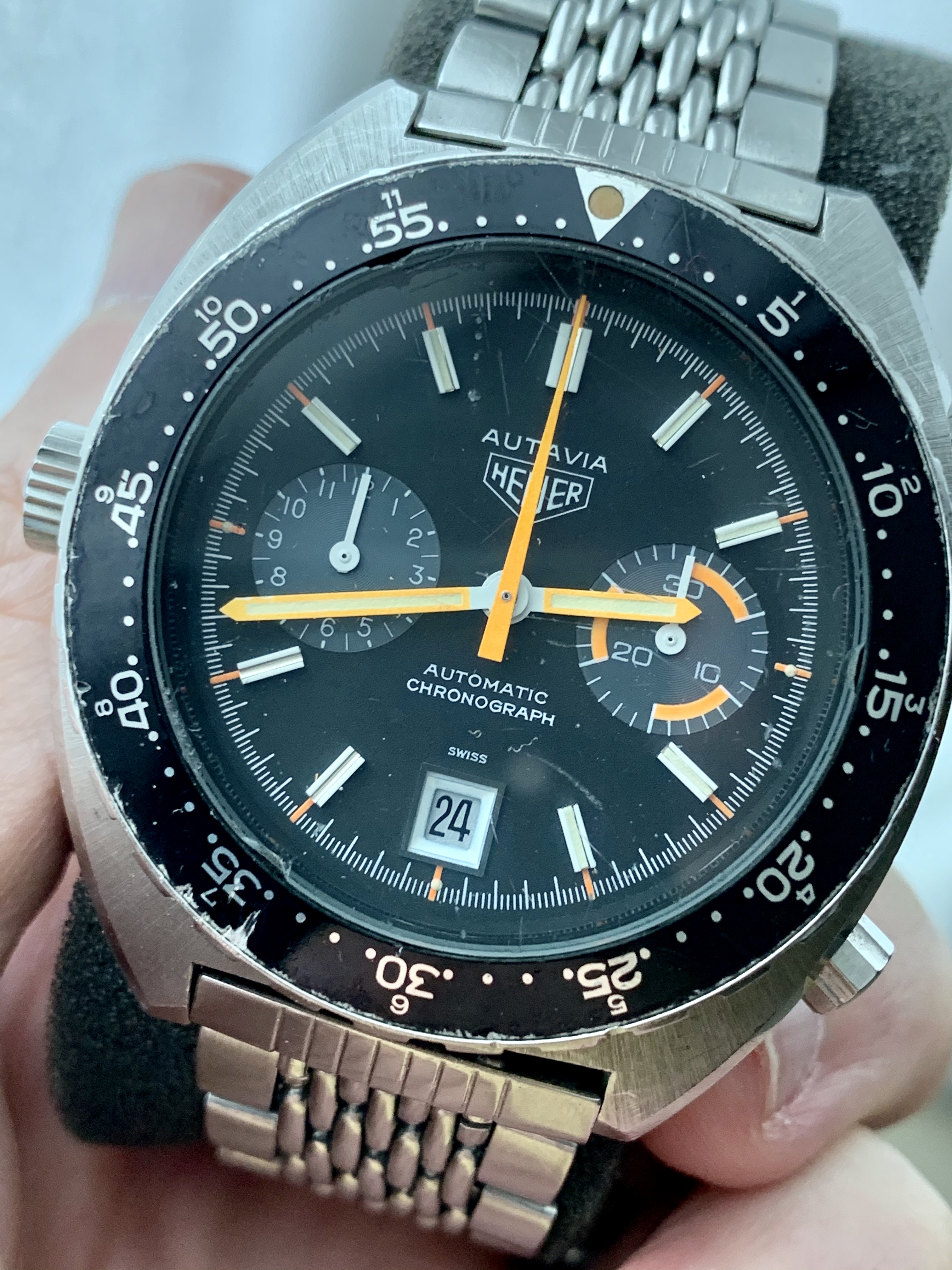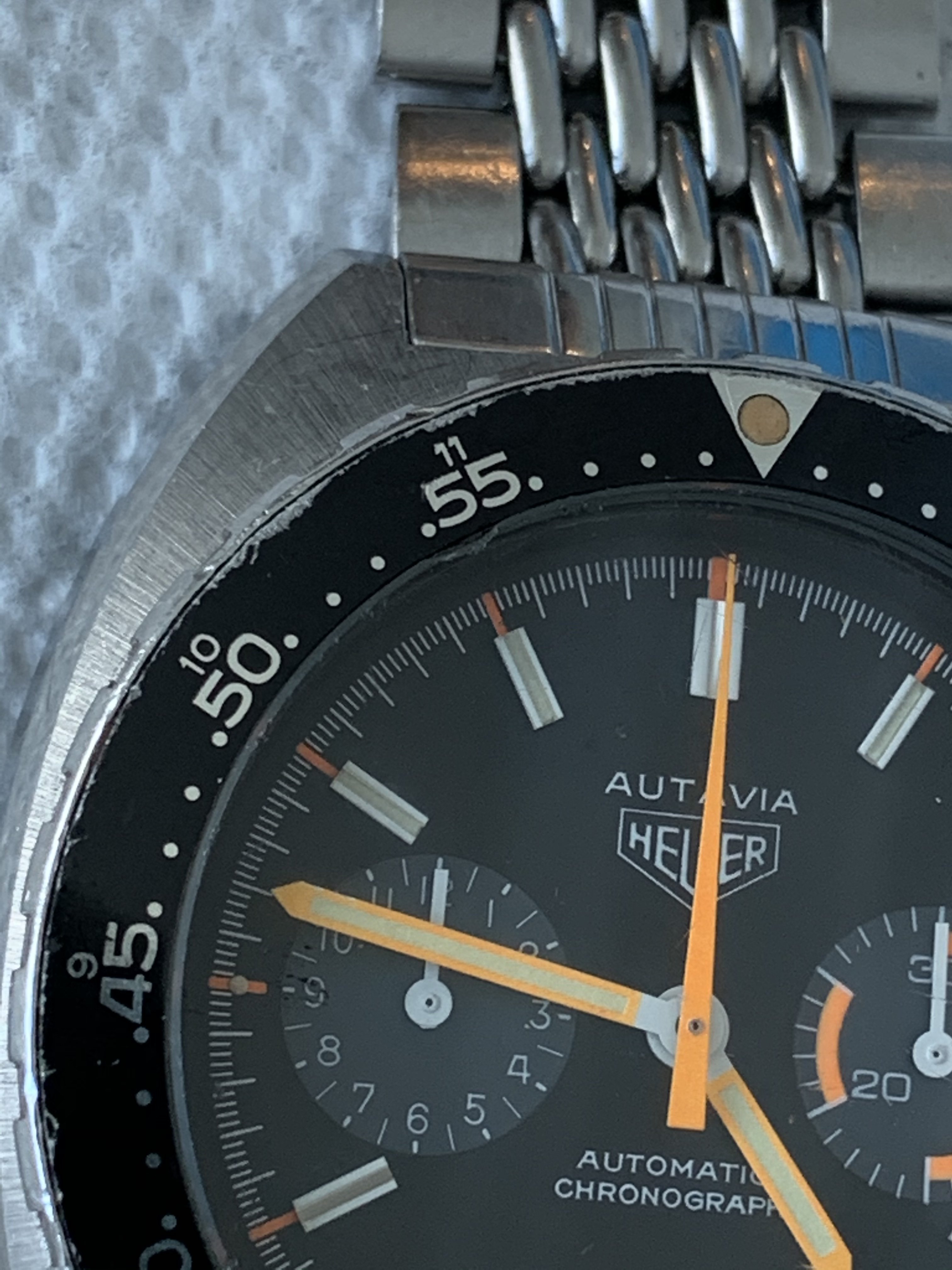 ·I’ve got a Heuer Autavia 11630MH with the caliber 12 movement. When I got the watch the seller said he was the original owner but I have no way to verify that. It does appear to be all original. It has some marks and scratches on the case and bezel insert which I’ve tried to highlight in the pics but the original brushed finish is still very much there. The mineral glass appears original and has some scratches. Nothing crazy but I would probably replace the glass to make the dial really shine.