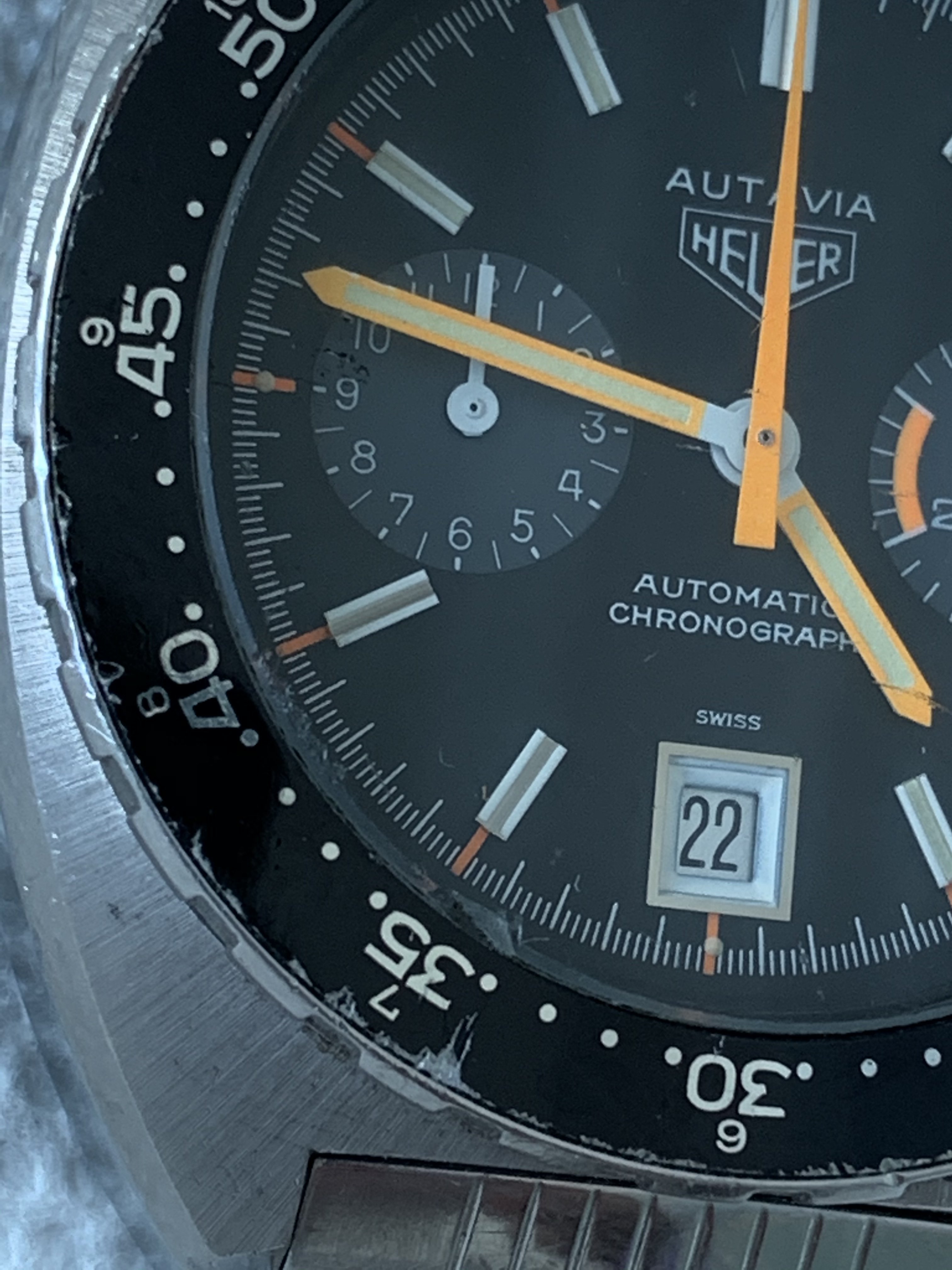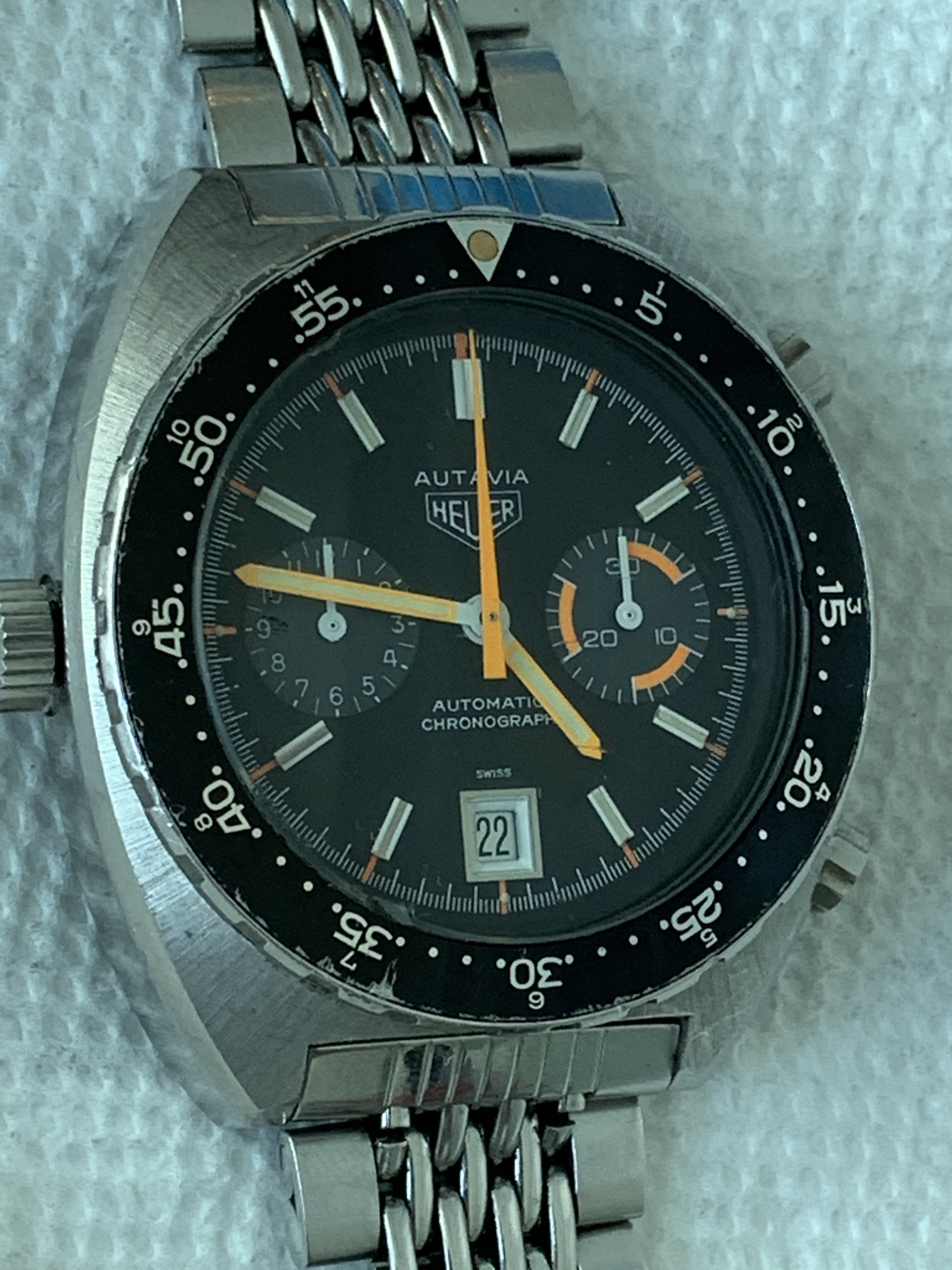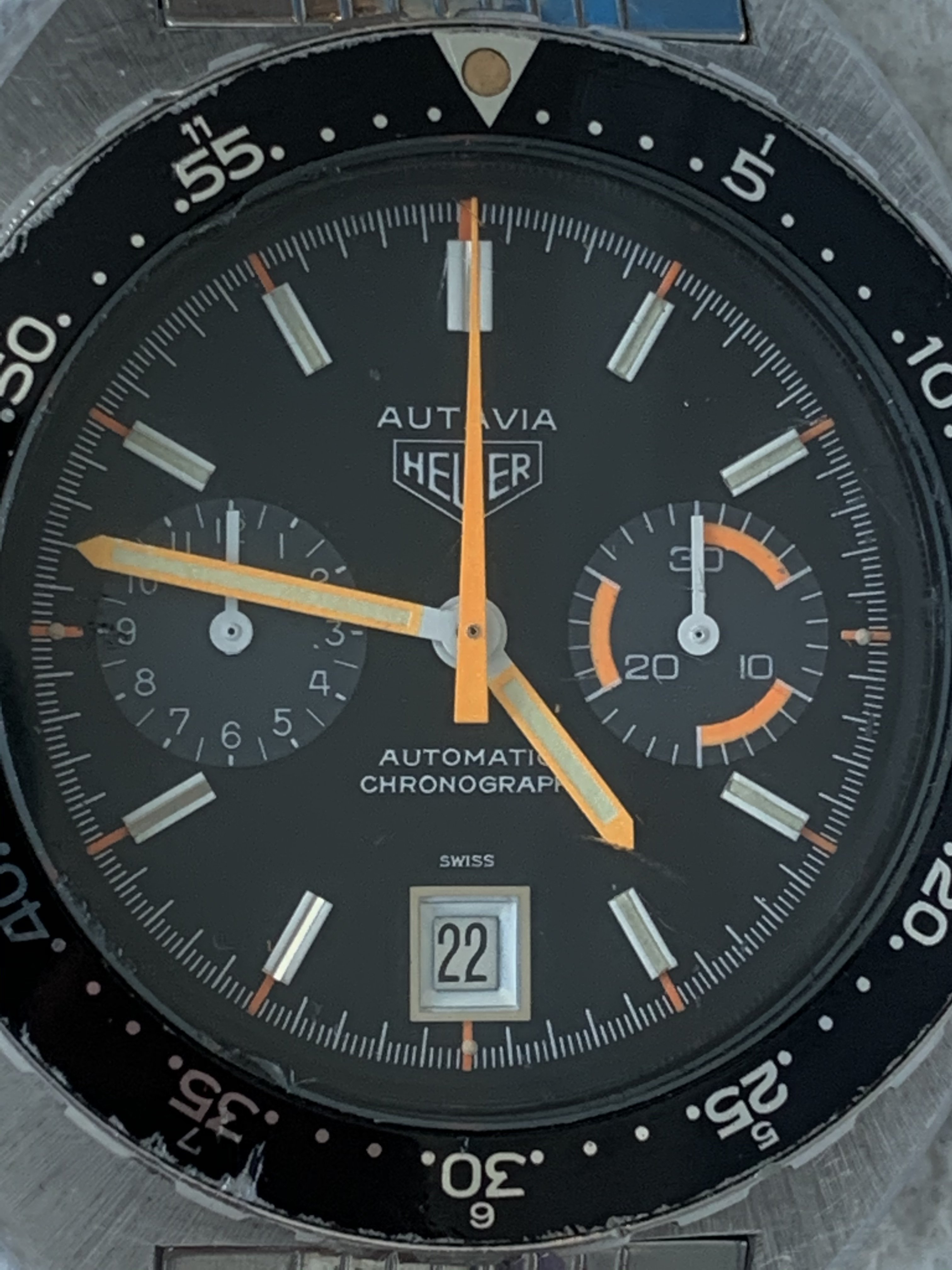·I’ve got a Heuer Autavia 11630MH with the caliber 12 movement. When I got the watch the seller said he was the original owner but I have no way to verify that. It does appear to be all original. It has some marks and scratches on the case and bezel insert which I’ve tried to highlight in the pics but the original brushed finish is still very much there. The mineral glass appears original and has some scratches. Nothing crazy but I would probably replace the glass to make the dial really shine.