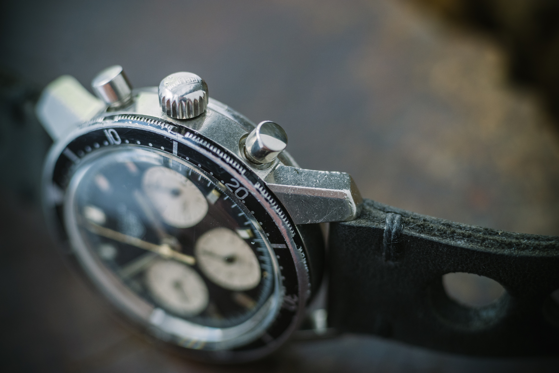路Nice example of the hard to find Heuer Autavia 2446C Chronograph with the fabled Valjoux 72 movement. Watch shows signs of use, but looks great for a 50 year old tool watch. I had a complete sympathetic service and cleaning last year by one of the best Heuer watchmakers in the US. Everything works as it should, keeps good time and chronograph functions start/stop and reset. Due to the age no warranties are given or implied, and the watch is sold as-is.
