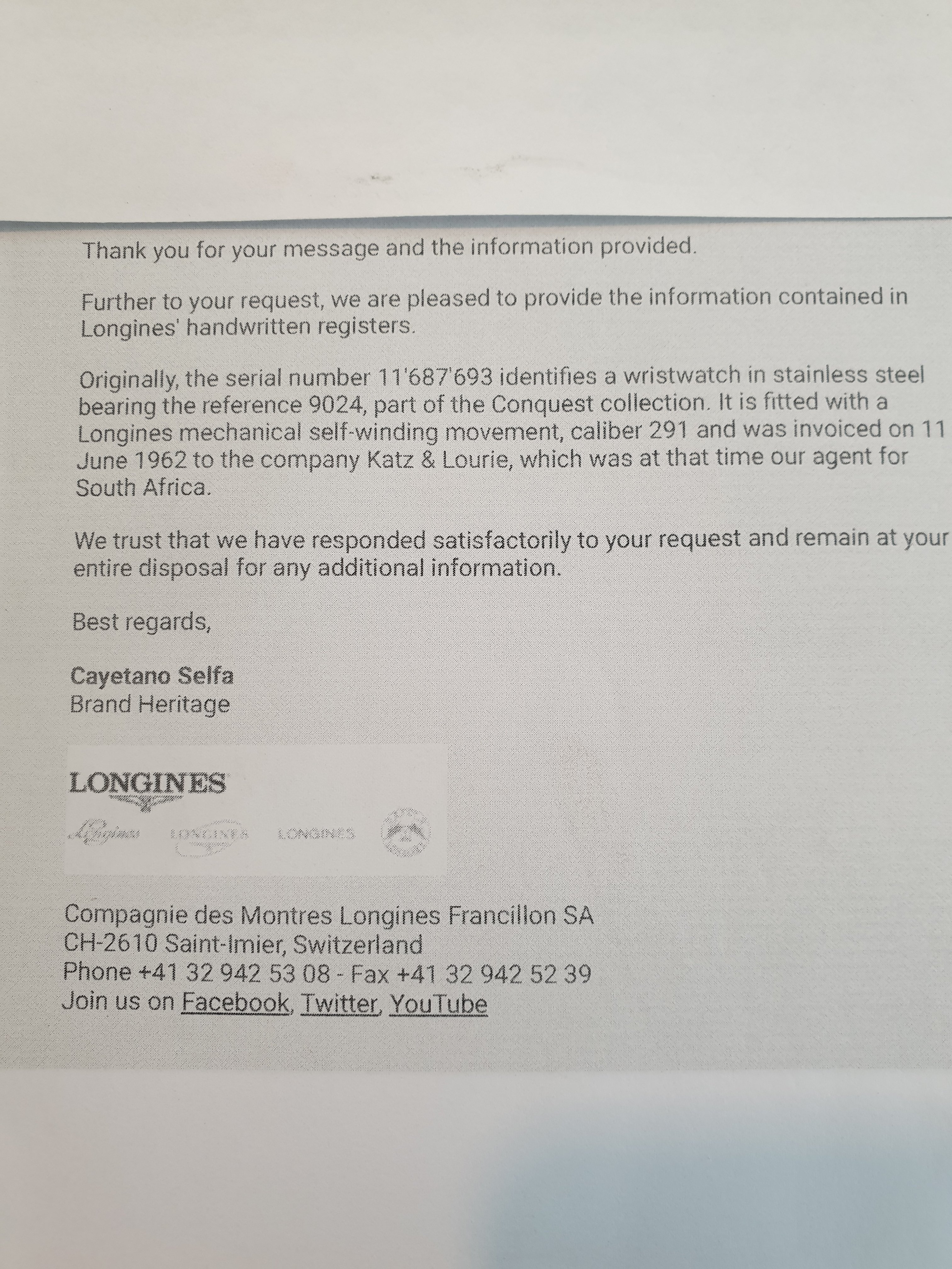 The watch is running perfectly and in great cosmetic condition as per pictures. The crown has been replaced at some stage of its life. The watch has a cal 291 movement which dates to 1962. I have attached a picture of the Longines letter regarding the history of the watch through their Heritage department