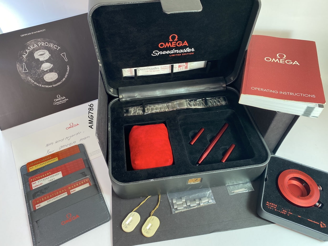 I have a used, unpolished (excellent condition), highly collectible Omega Speedmaster ‘Alaska Project’. Selling for only £18,500 or best offer. Manufactured in 2008, and purchased from an Omega authorised dealer. It comes complete with outer lower card box, Omega leatherette box, user manual, factory warranty cards/ wallet stamped by the official Omega AD, plastic hang tags, x1 white textile velcro strap, x2 bracelets, links, thermal shield + all additional accessories, numbered ‘Alaska Project’ authenticity booklet (which matches case number). The watch is in excellent working condition, with some small signs of wear such as hairline scratches to case, bracelet and Hesalite crystal. The watch has been kept in my tough, watertight, dustproof, pressure equalised PELI 1450 watch case (not inc) in a temperature controlled room and opened once a month to give the movement a full wind.