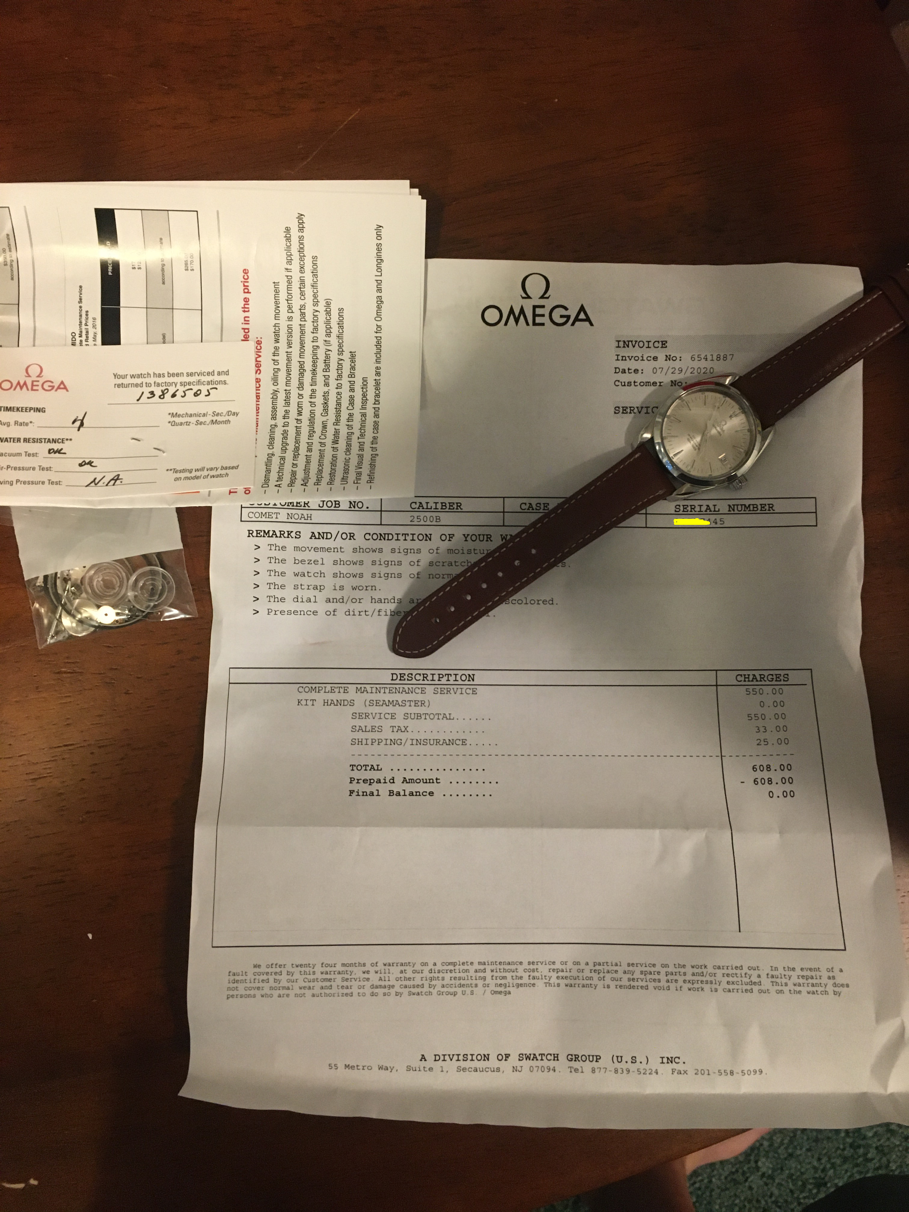 Obviously, I didn’t intend to drop $608 on an official service only to turn around and re-sell the piece for about what I paid, but I’m hoping the tradeoff is that a freshly overhauled watch will appeal enough to move fairly quickly, since it has the service paperwork, it’s running like new, shouldn’t need another service for quite a long time, and you can’t ask for a better authenticity guarantee than an actual visit to Omega! (Not that I ever had concerns about its authenticity.)