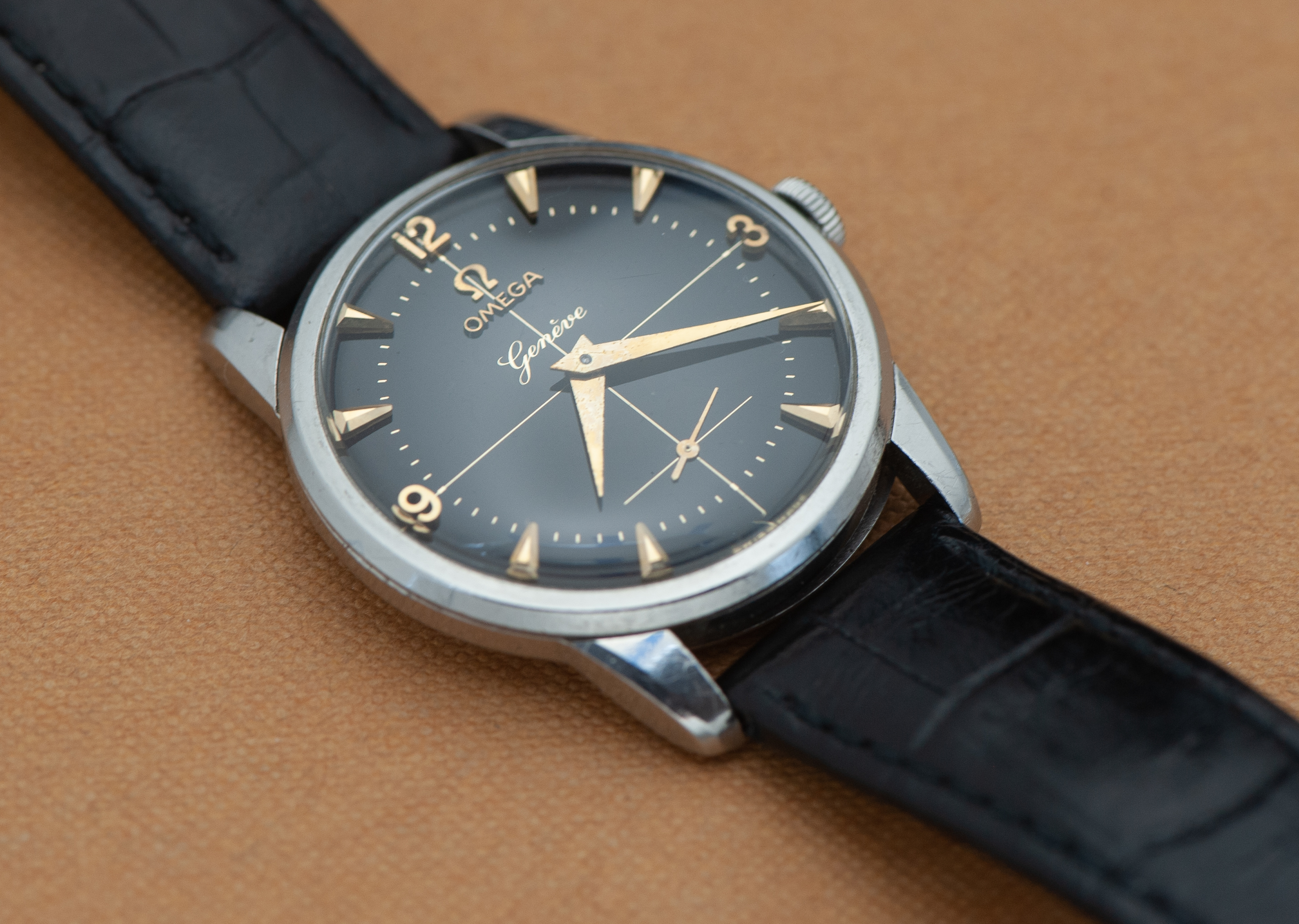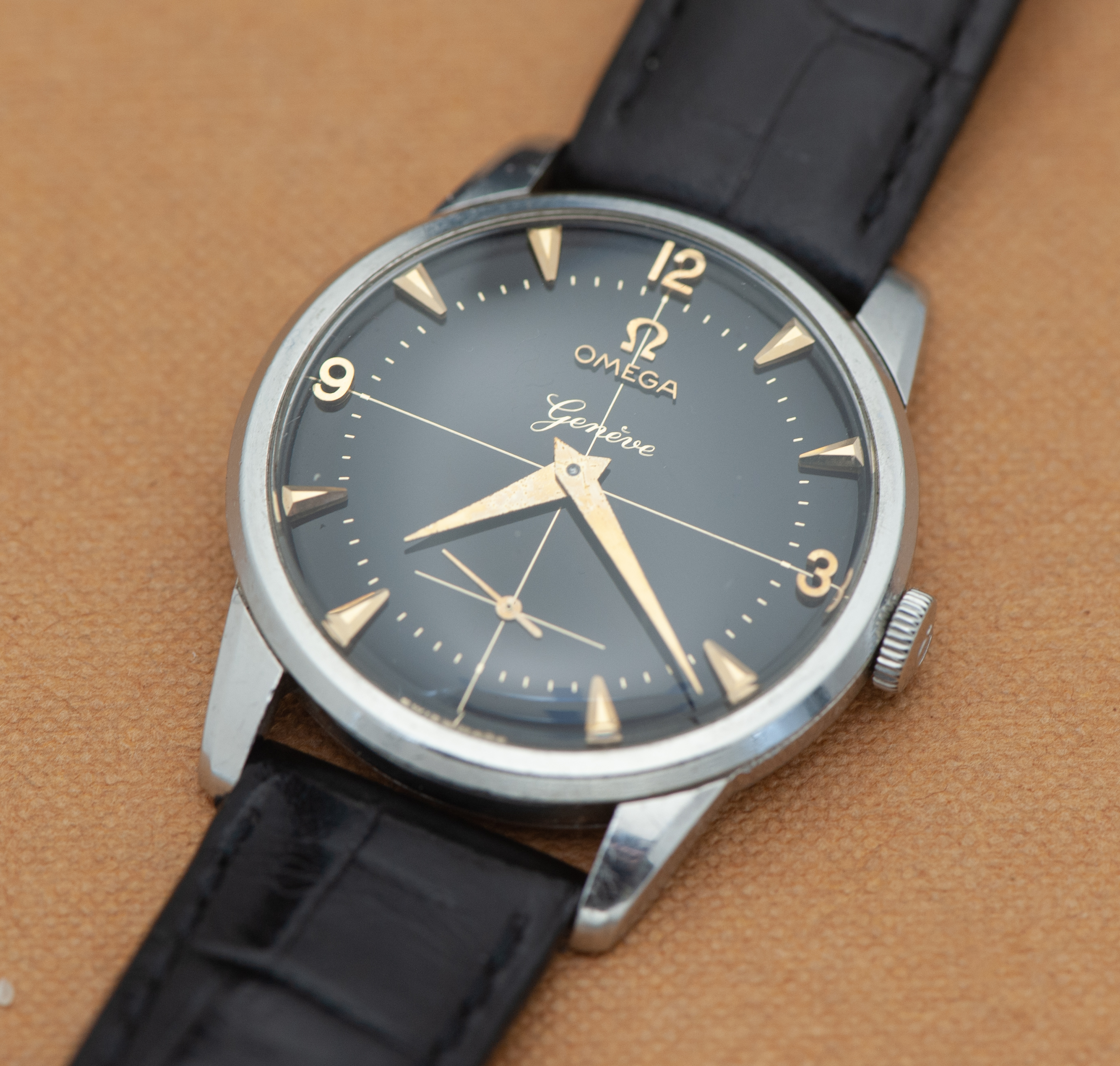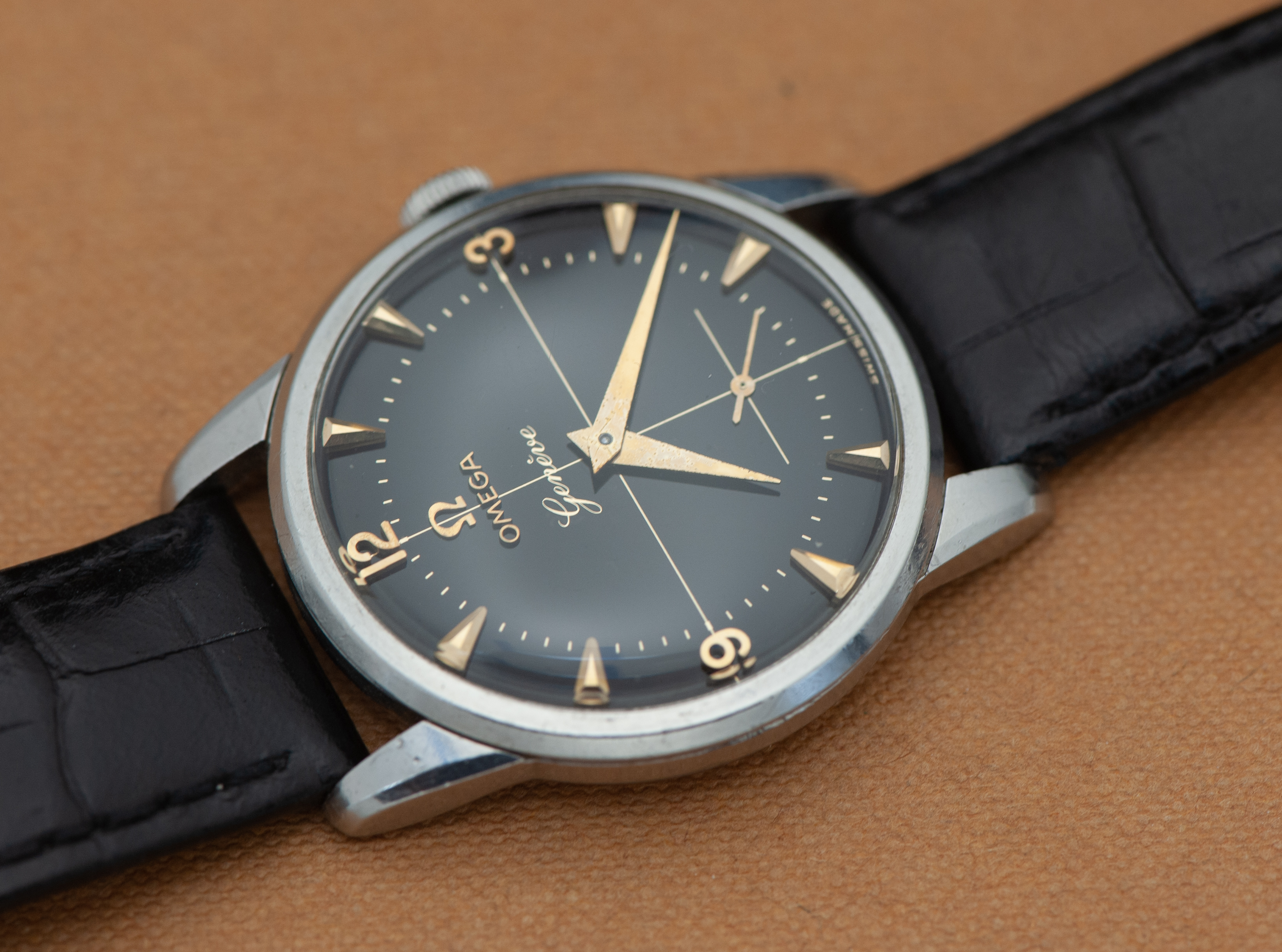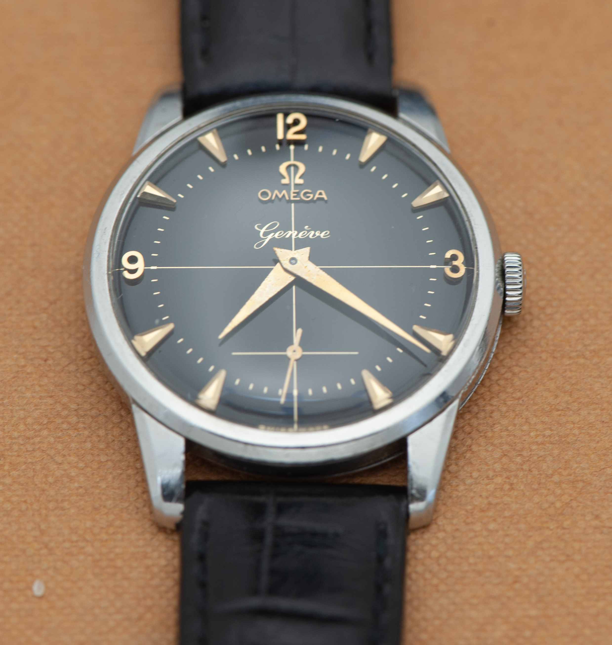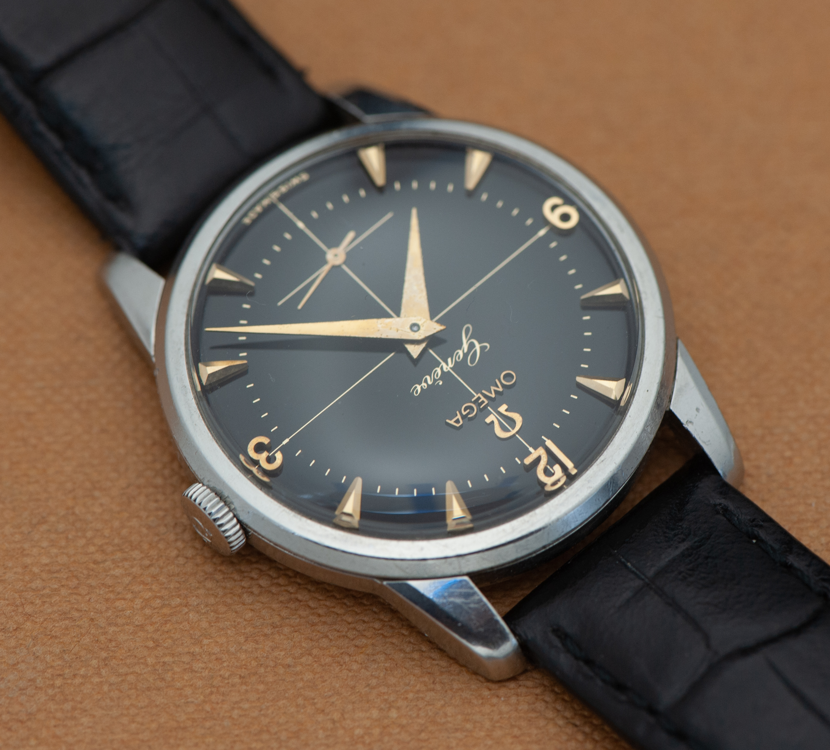 ··Curious about this text thingy below his avatarI decided to let this watch go since it gets no wrist time. Offered is an early Omega Genève in a stainless steel case. This is a ref. 2754, dating to 1954 and is to the best of my knowledge all original. Watch measures 34.5 mm in diameter, excluding the crown. It comes on a black generic leather strap.