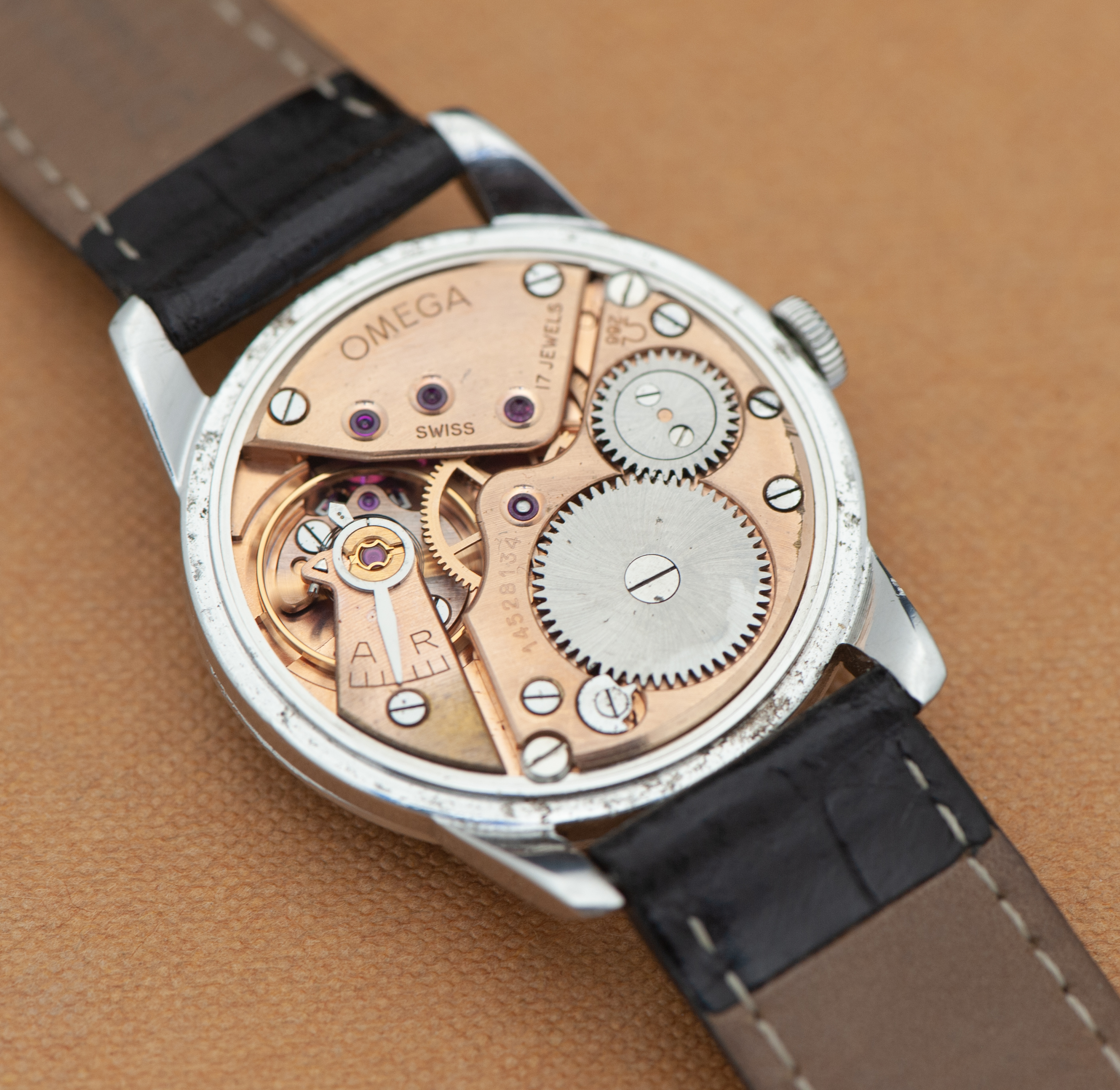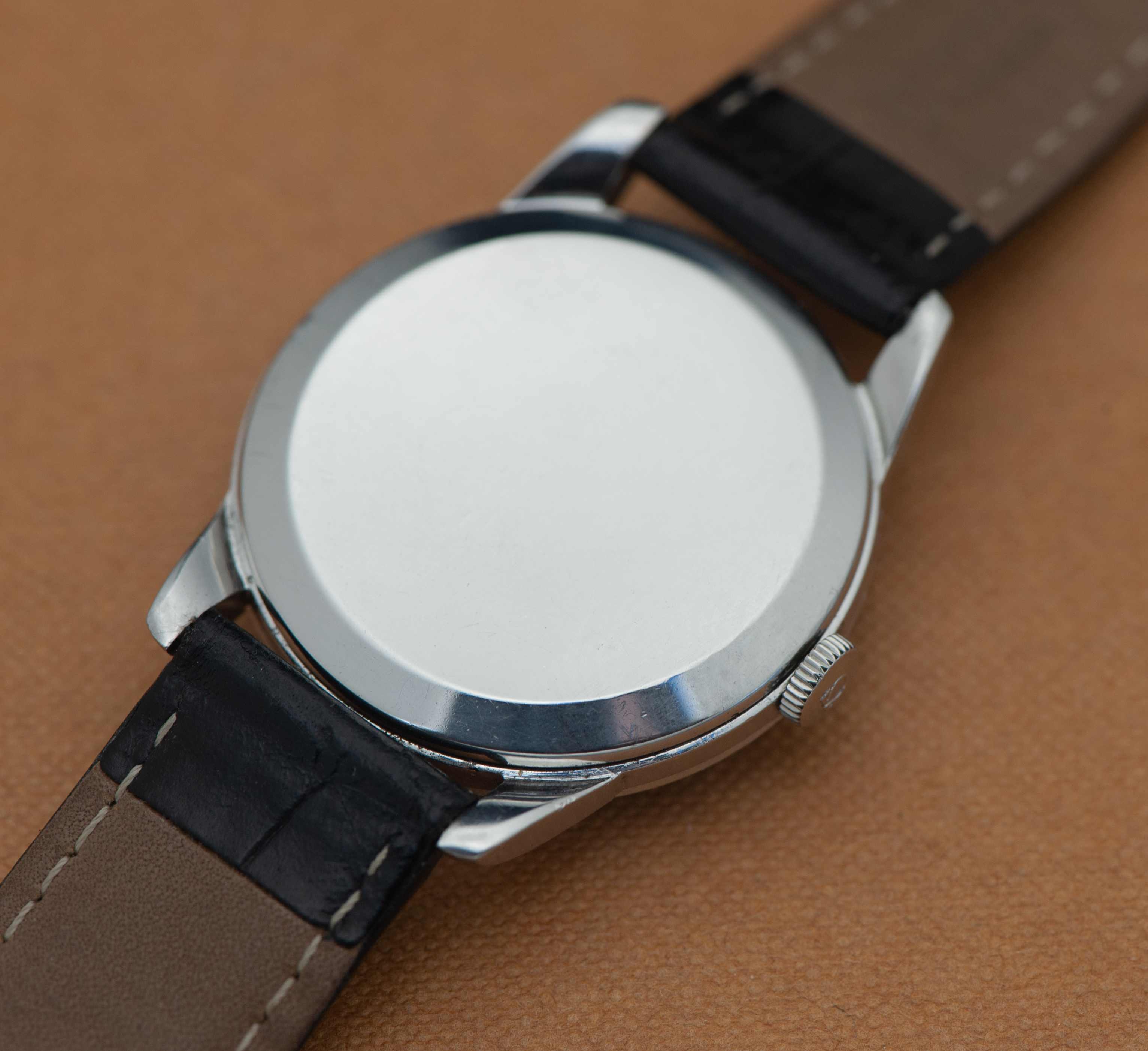 This example is in very good condition. To the best of my knowledge and experience, the case looks like it has not been polished. There are a few light scratches and dings showing under magnification, which can been seen in the photos. The black dial is original and in excellent condition. The hands and markers are in rose gold and in excellent condition. The movement is a cal. 266 and is also in excellent running condition. Watch is working correctly, but has not been serviced or timed recently. I would recommend having it serviced if the plan is to wear the watch regularly.