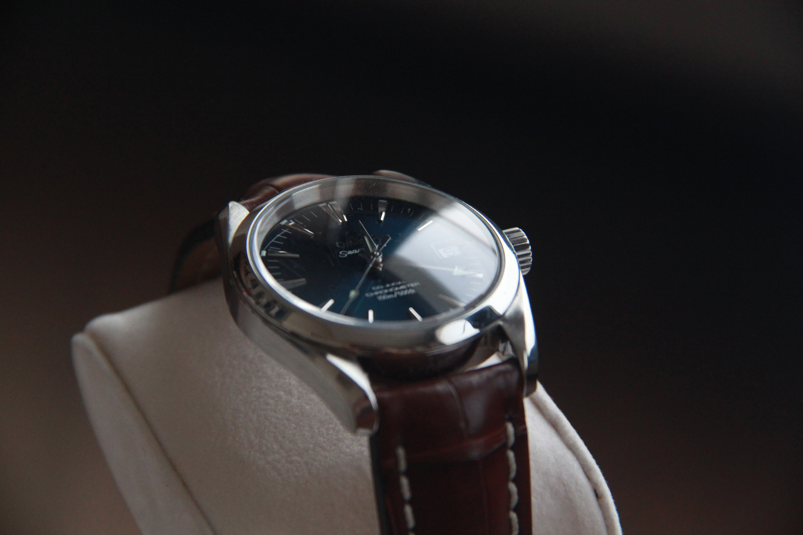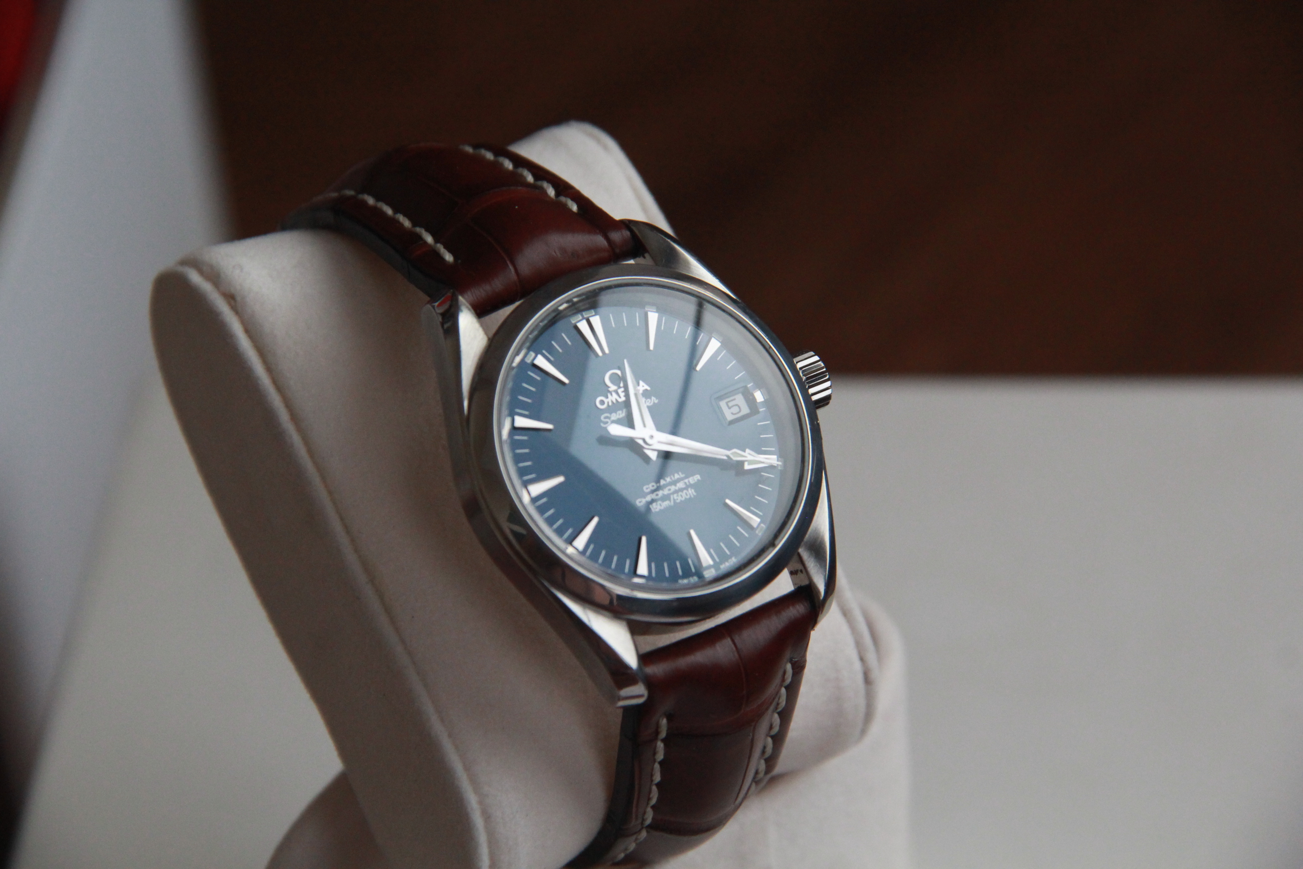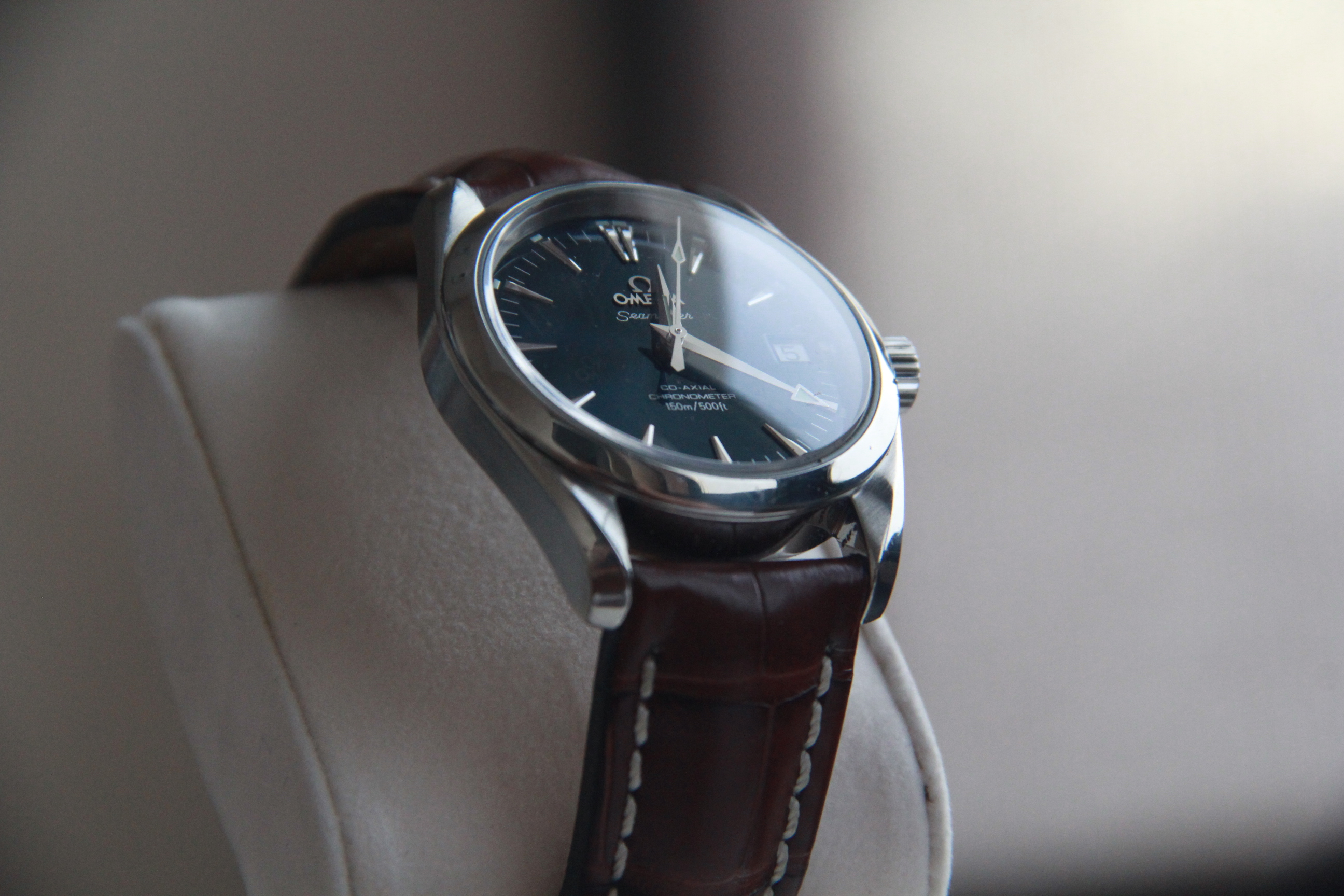 The now discontinued 2500 coaxial Aqua Terras are pretty thin (about 11 mm) compared to the newer 8500 coaxial series, so they are dressier and less heavy on the wrist. The blue sunburst dial is amazing in person (pictures dont do justice), changing color between a vivid blue and almost black depending on lighting conditions. This watch features the latest iteration of the 2500 movement used on this series (C)