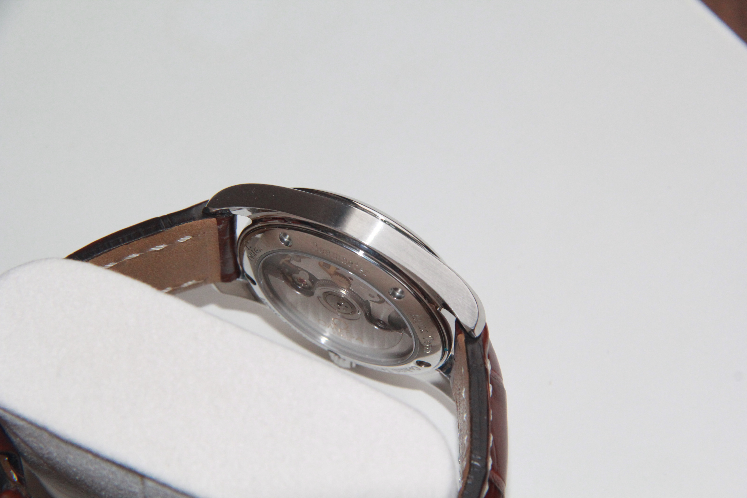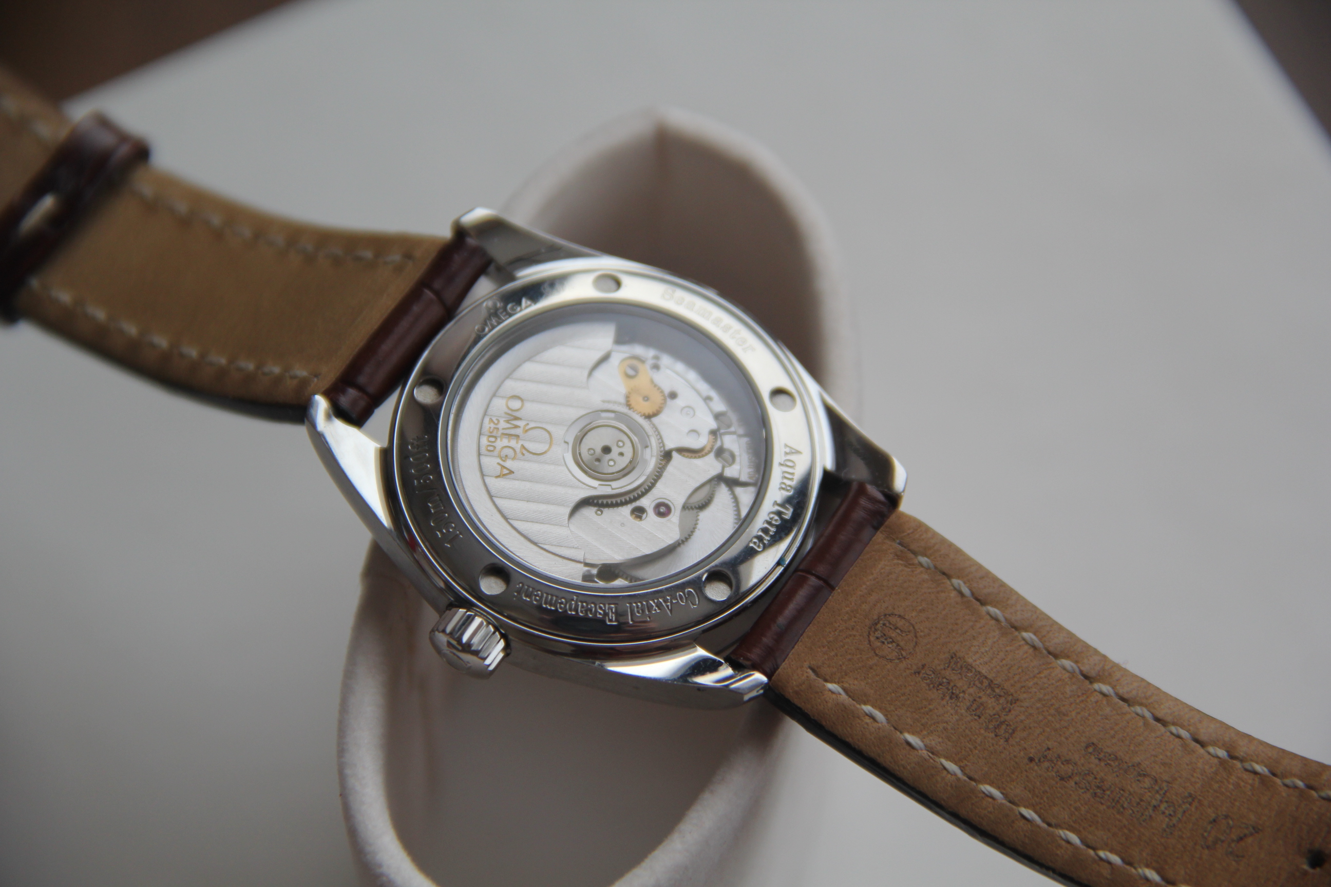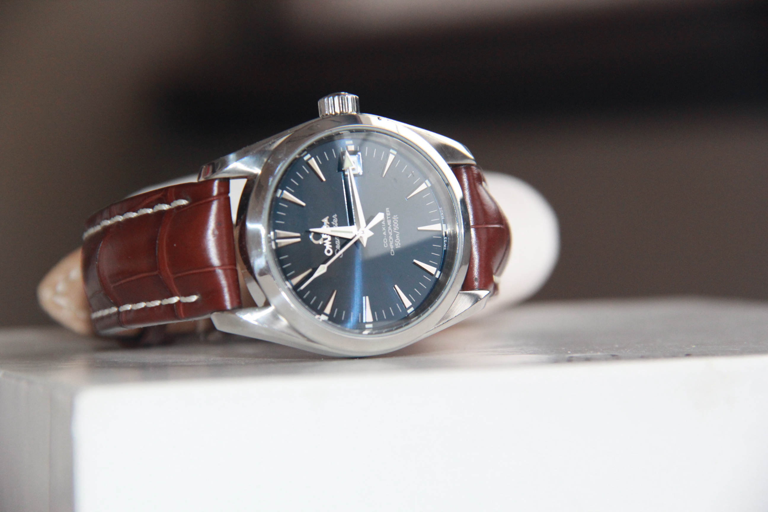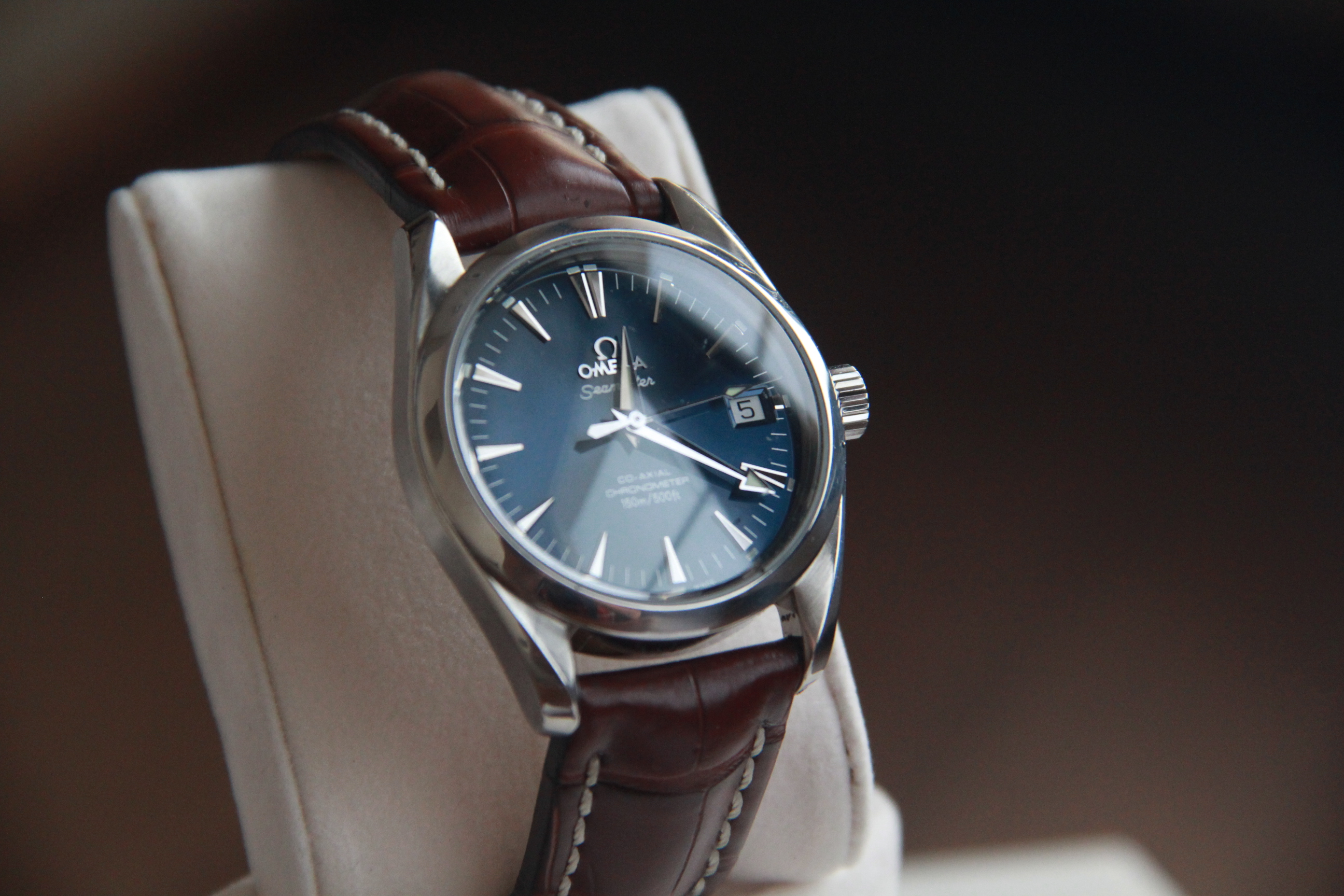 The now discontinued 2500 coaxial Aqua Terras are pretty thin (about 11 mm) compared to the newer 8500 coaxial series, so they are dressier and less heavy on the wrist. The blue sunburst dial is amazing in person (pictures dont do justice), changing color between a vivid blue and almost black depending on lighting conditions. This watch features the latest iteration of the 2500 movement used on this series (C)