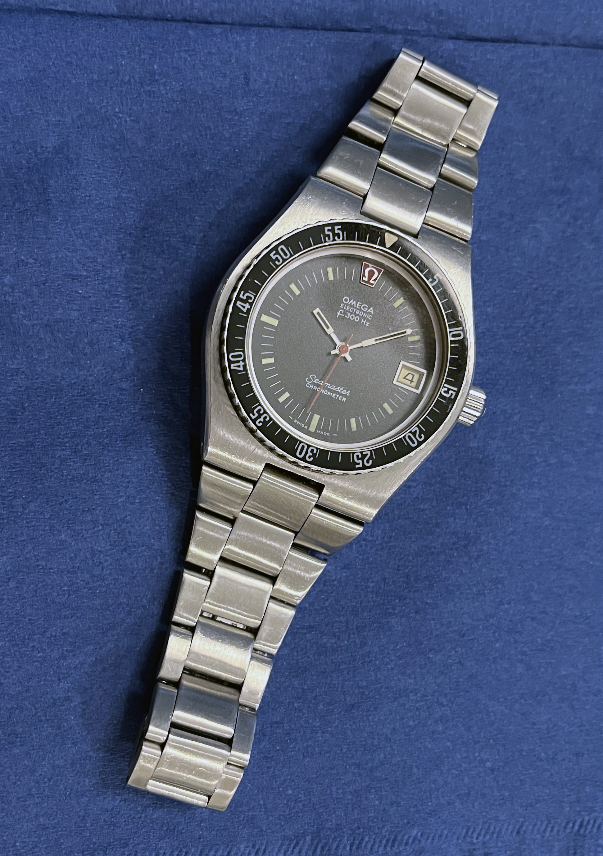 It is an Omega Seamaster Diver F300 Chronometer Ref 198.0005. It houses the cal 1250 tuning fork movement. This is a big watch with the case measuring 41.5mm (excluding the crown), 46mm lug to lug & 12mm thickness. It has a screw in crown that works smoothly. The watch is from the early 1970 and show wear such as nicks and scuffs, as can be seen in the pictures. Having said that, the original bracelet is still pretty tight and the dial is in perfect condition. As far as I can tell everything is original on this watch. It is working flawlessly and recently had a fresh battery installed. I don't have the box or papers.