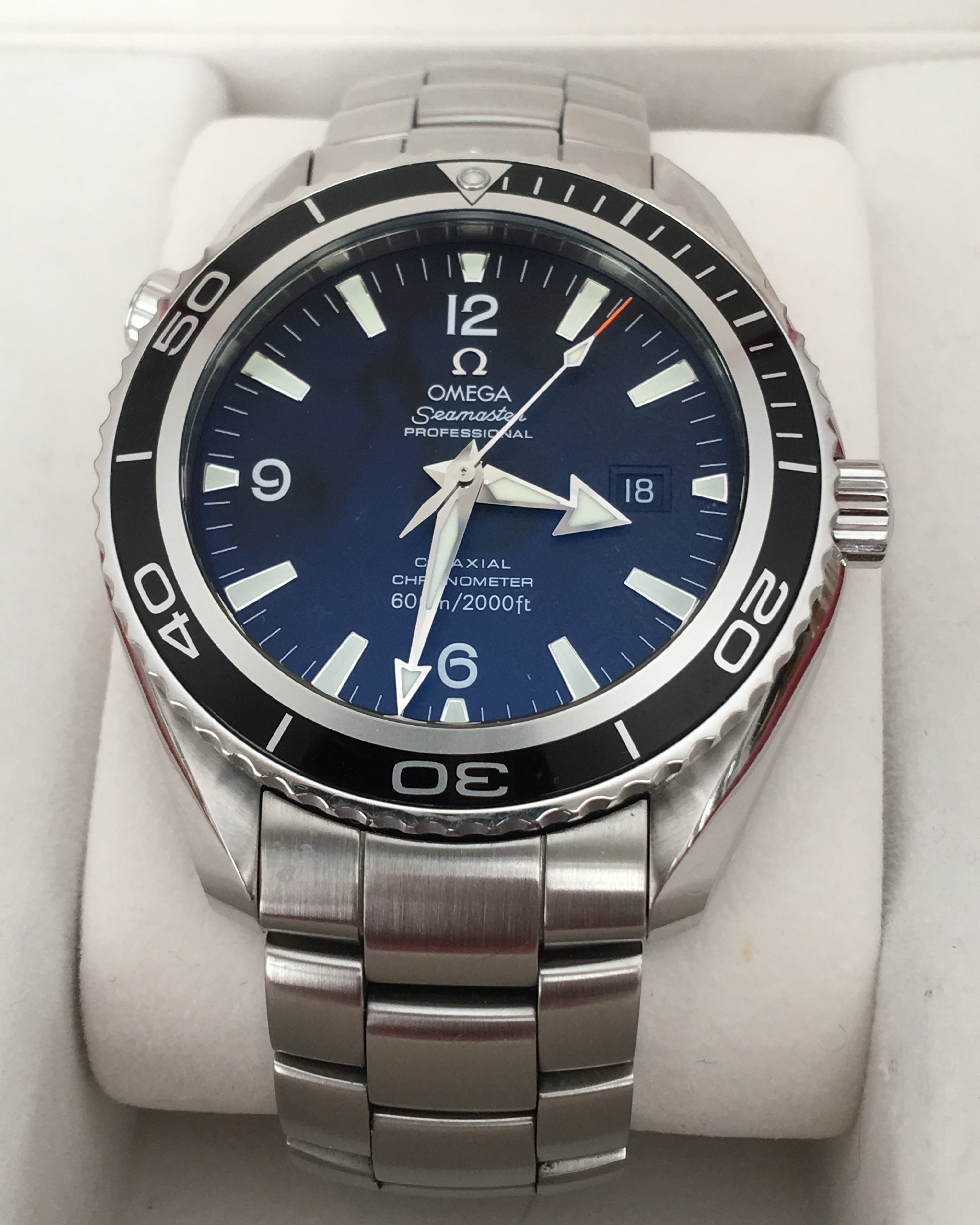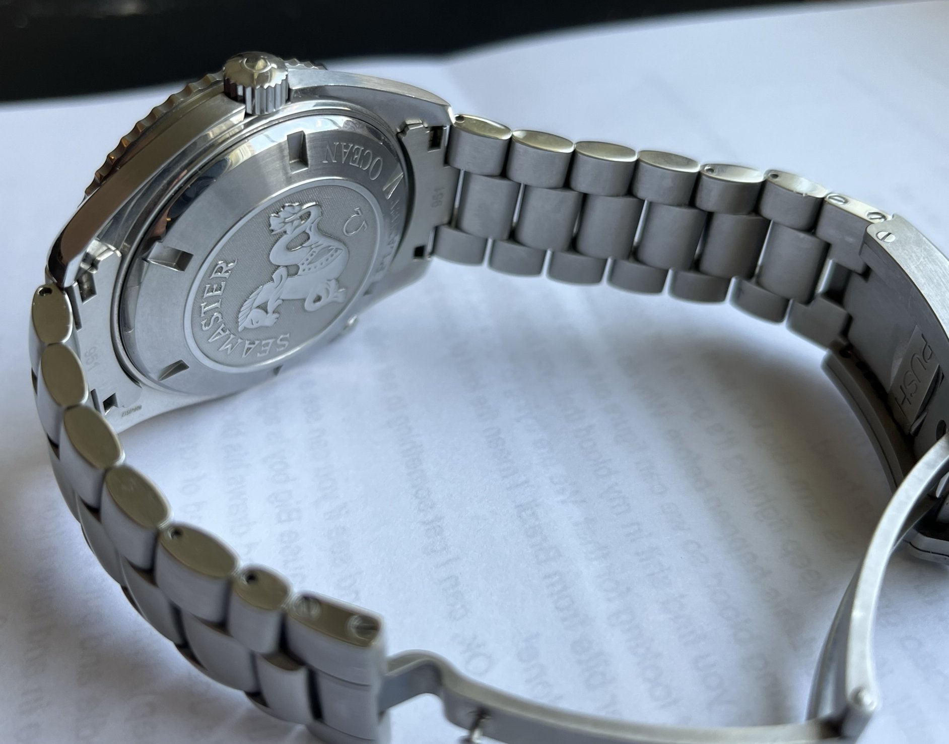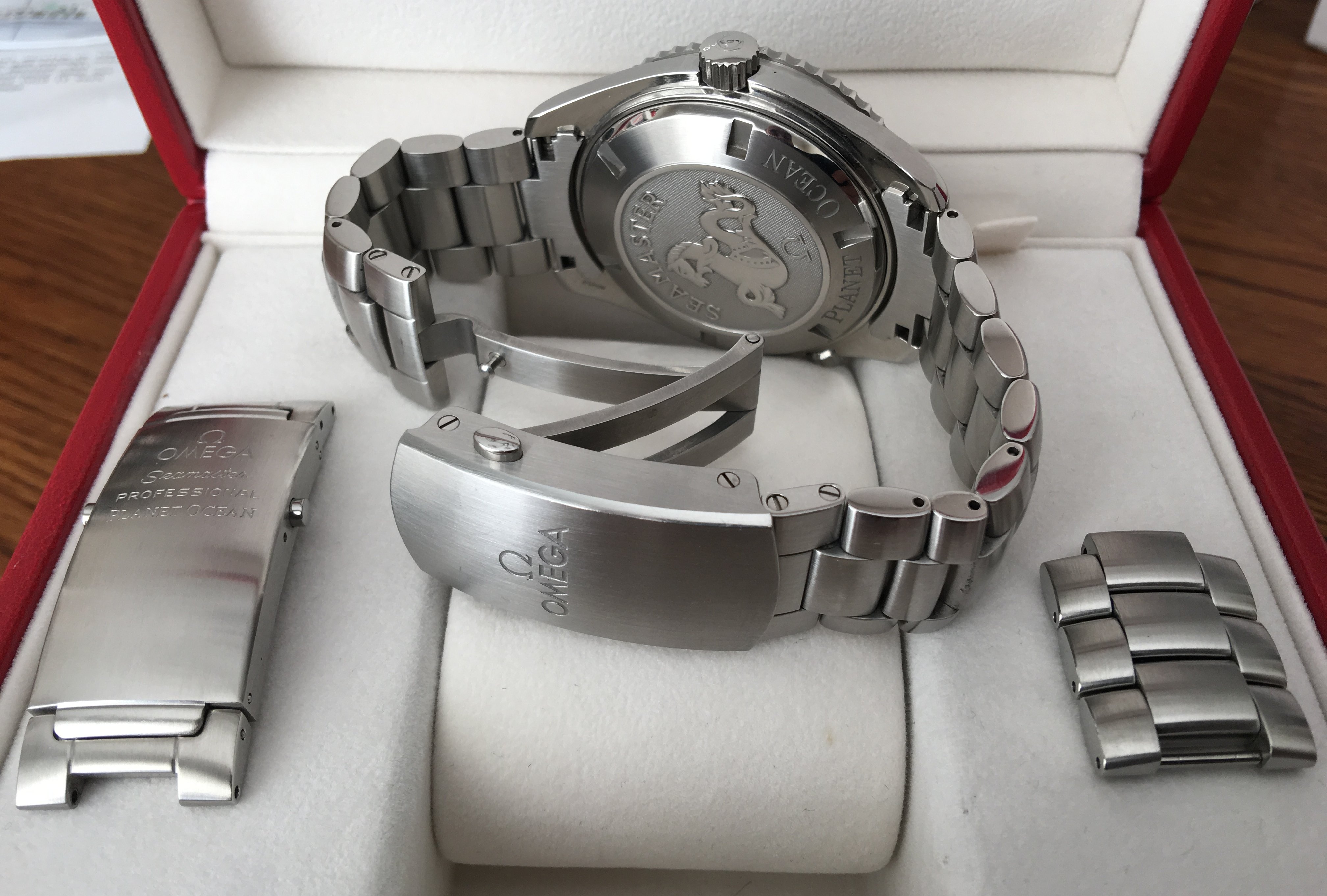 I purchased this brand new from Govberg in July of 2016. It was one of the last new, fully Omega warrantied Planet Oceans so I was thrilled to get it. I immediately purchased the newer Glidelock clasp, plus two links to fit to the watch, which completely transformed how it wore on the wrist. The original clasp went into the box and has stayed there.