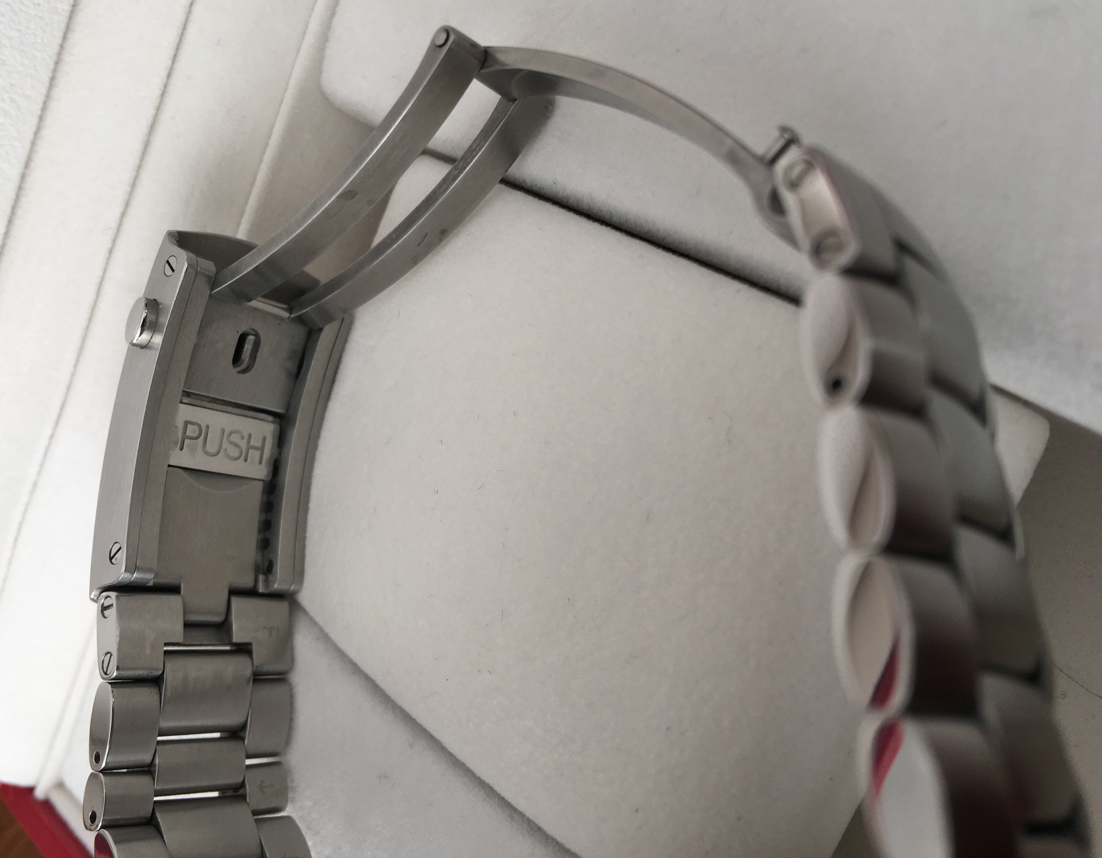 The Glidelock clasp has plenty of desk diver scratches, as you can see from the bottom pic, taken the day this was posted. They are unavoidable with such a thick clasp. The stock clasp is like new. The bracelet itself has very minor wear that is quite difficult to photograph. This watch has in no way ever been abused. It's been my pride and joy.