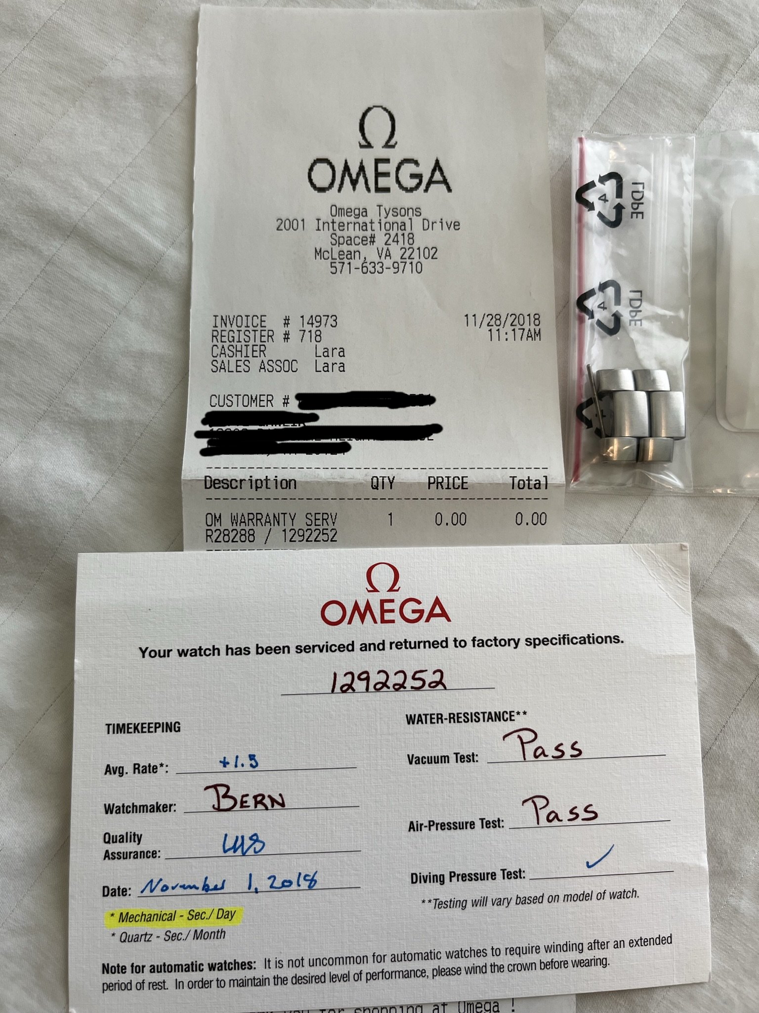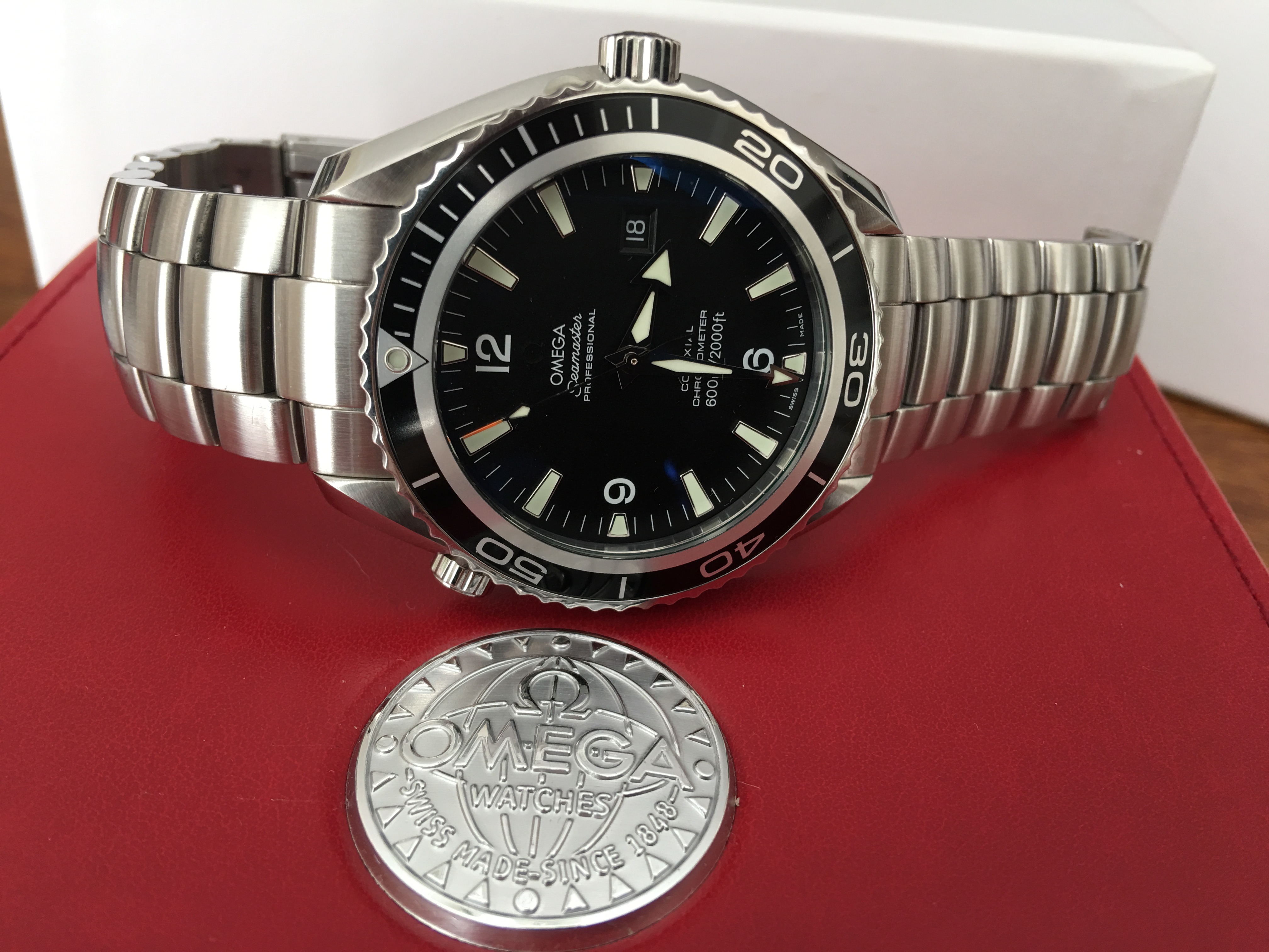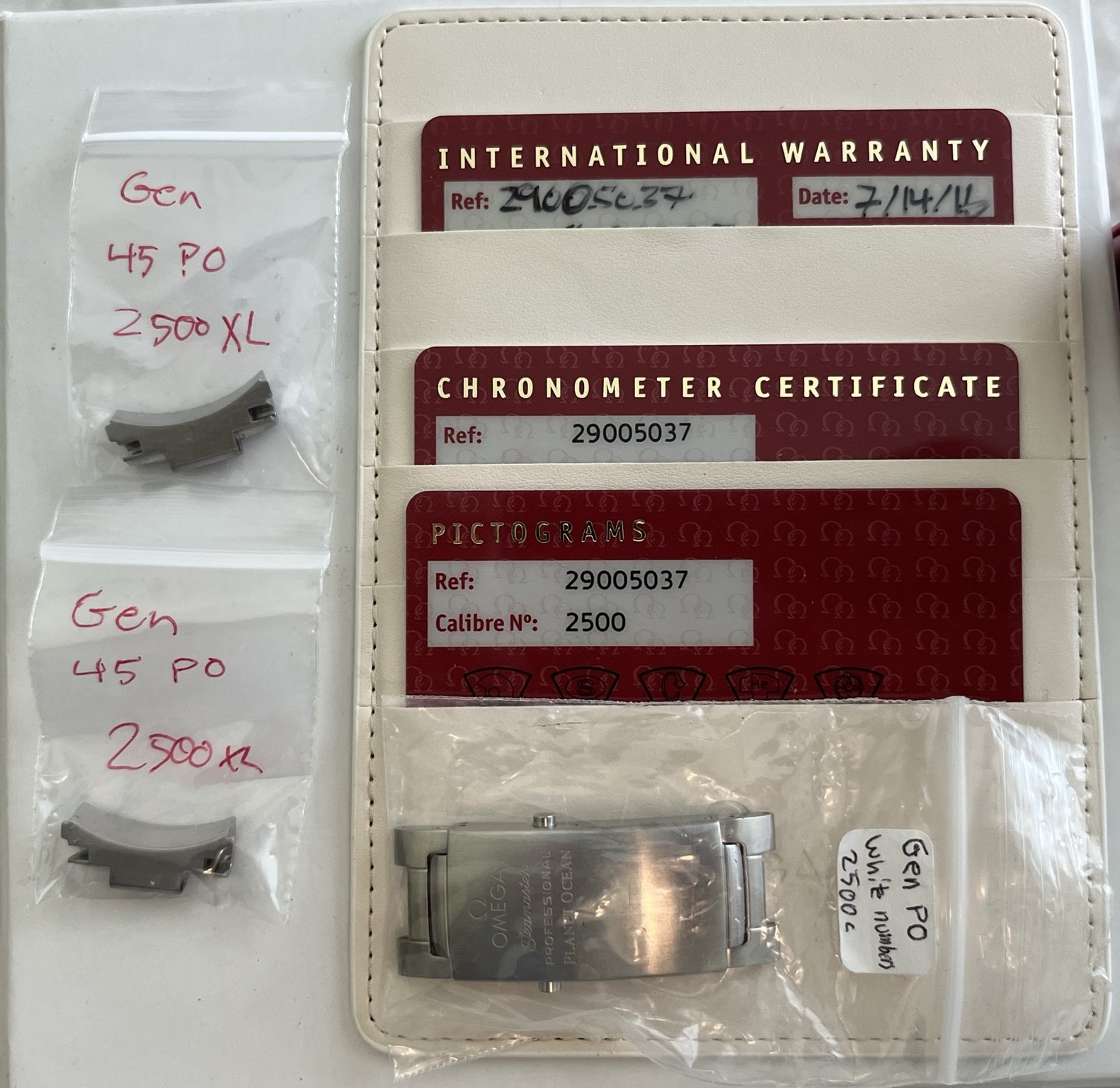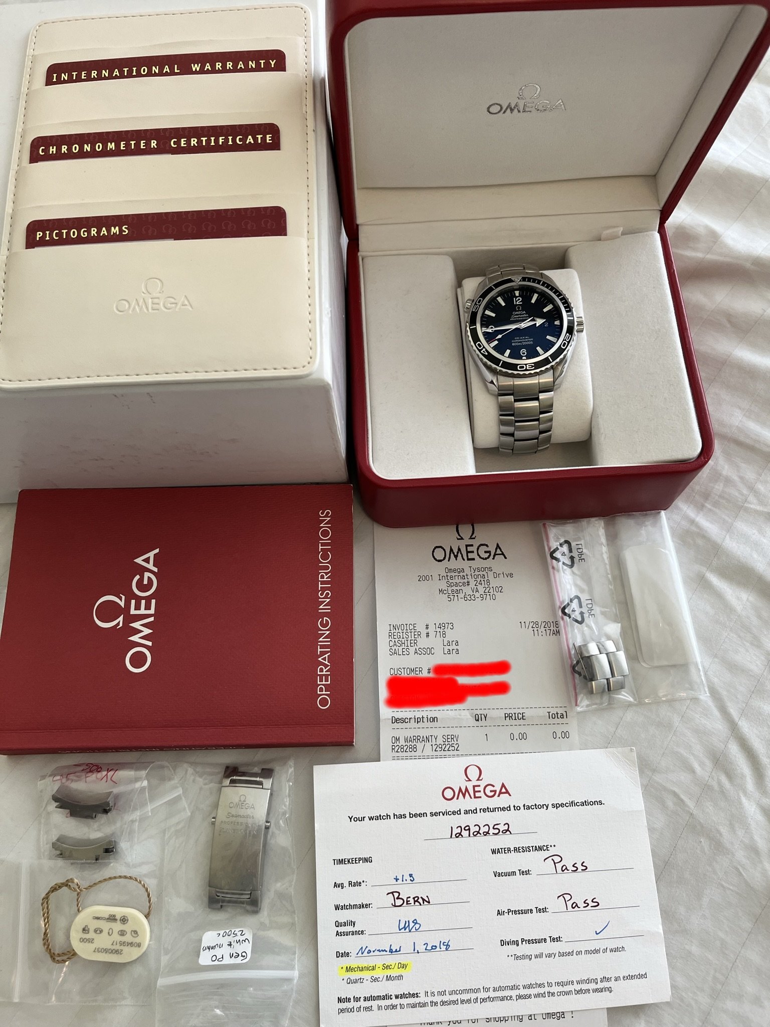 Original Box (red inner and white outer), manual, all three cards, the hang tag, spare links, stock clasp are all included. As are two spare bracelet end-links, plus Omega service papers from November of 2018. I specifically told Service not to refinish the case or bracelet so they are still unmolested.