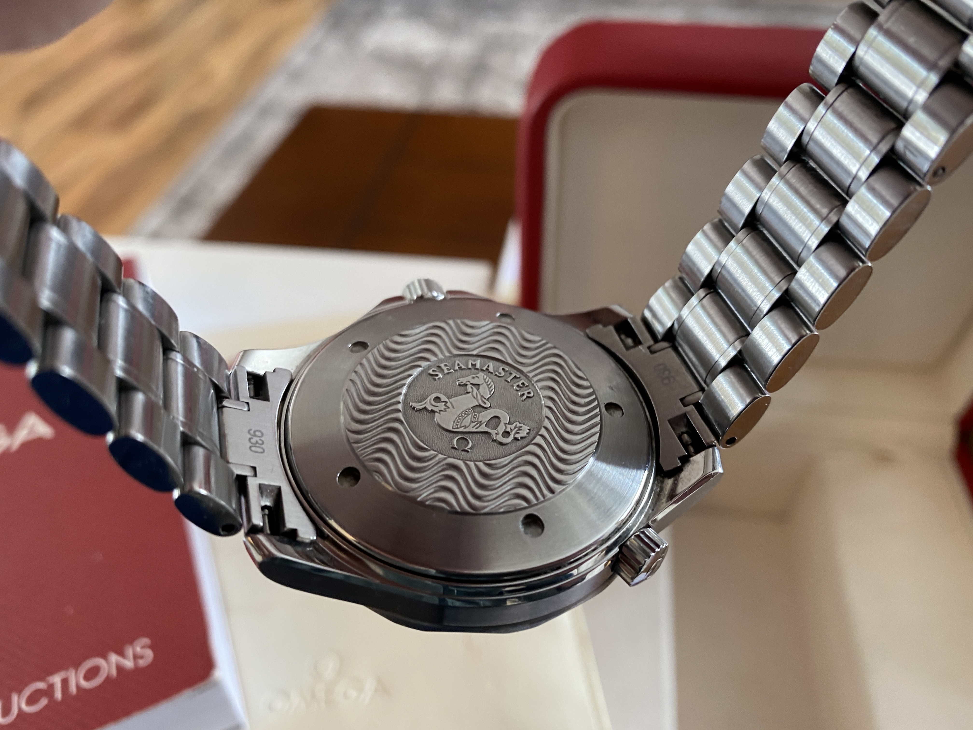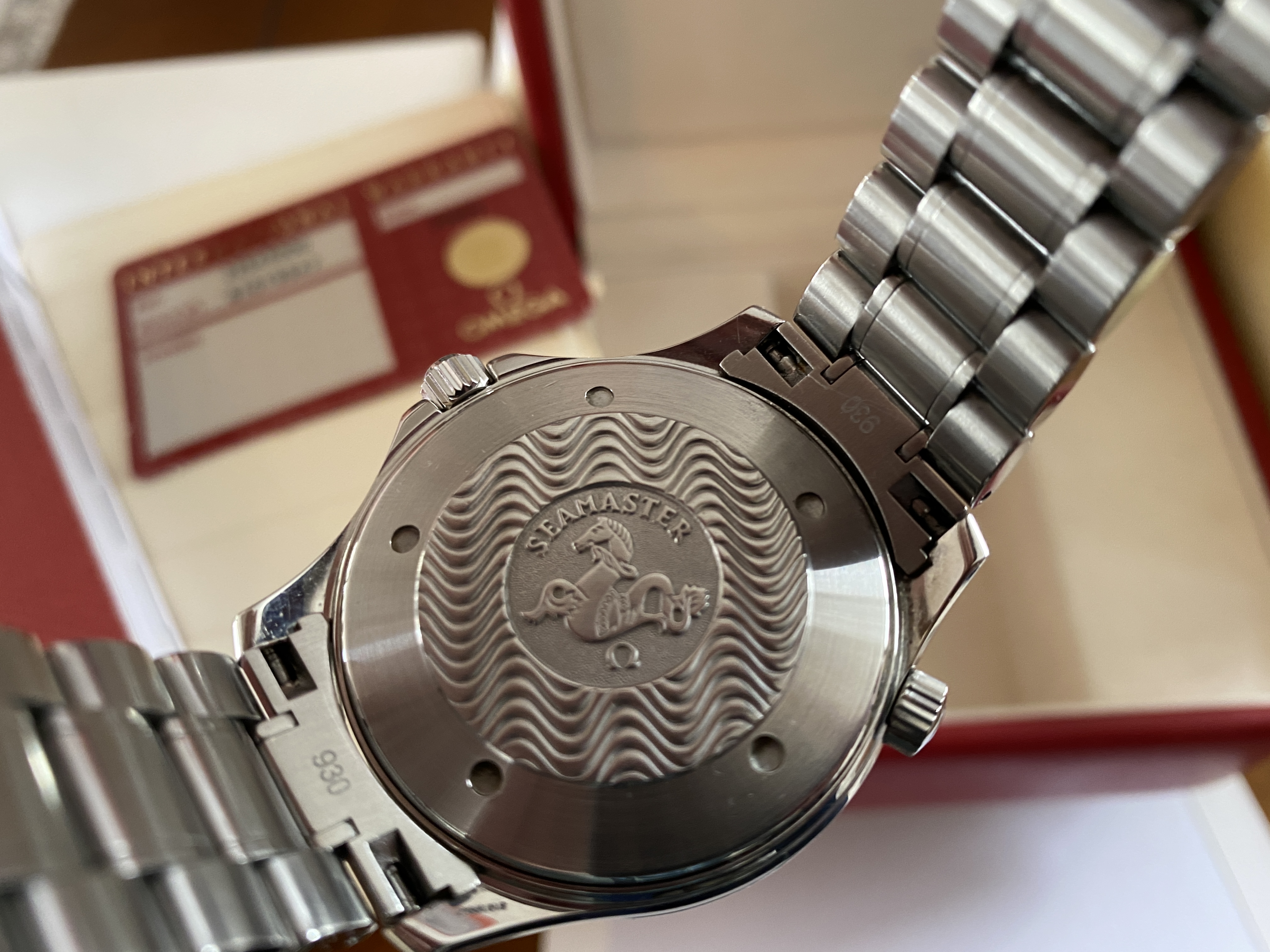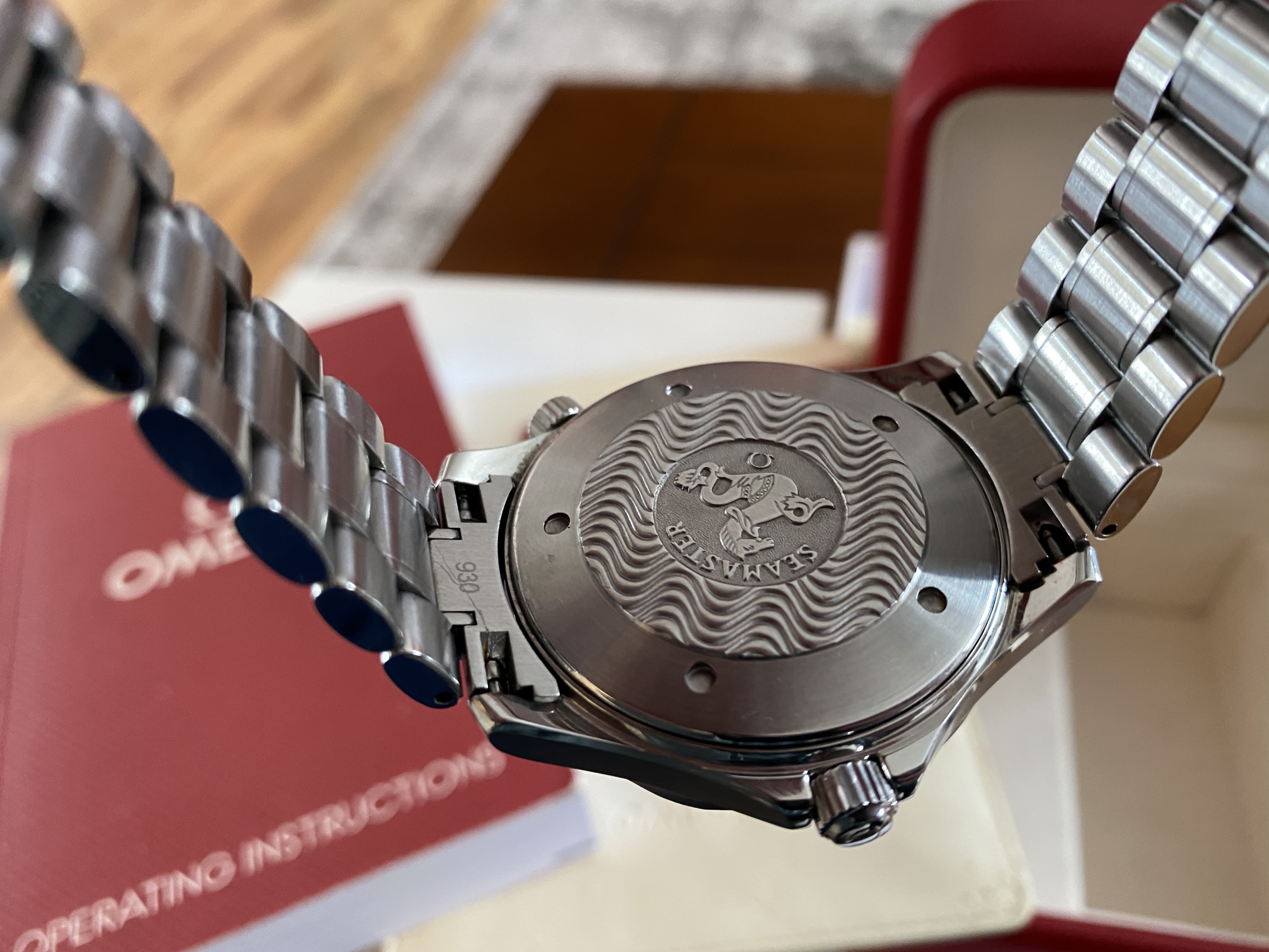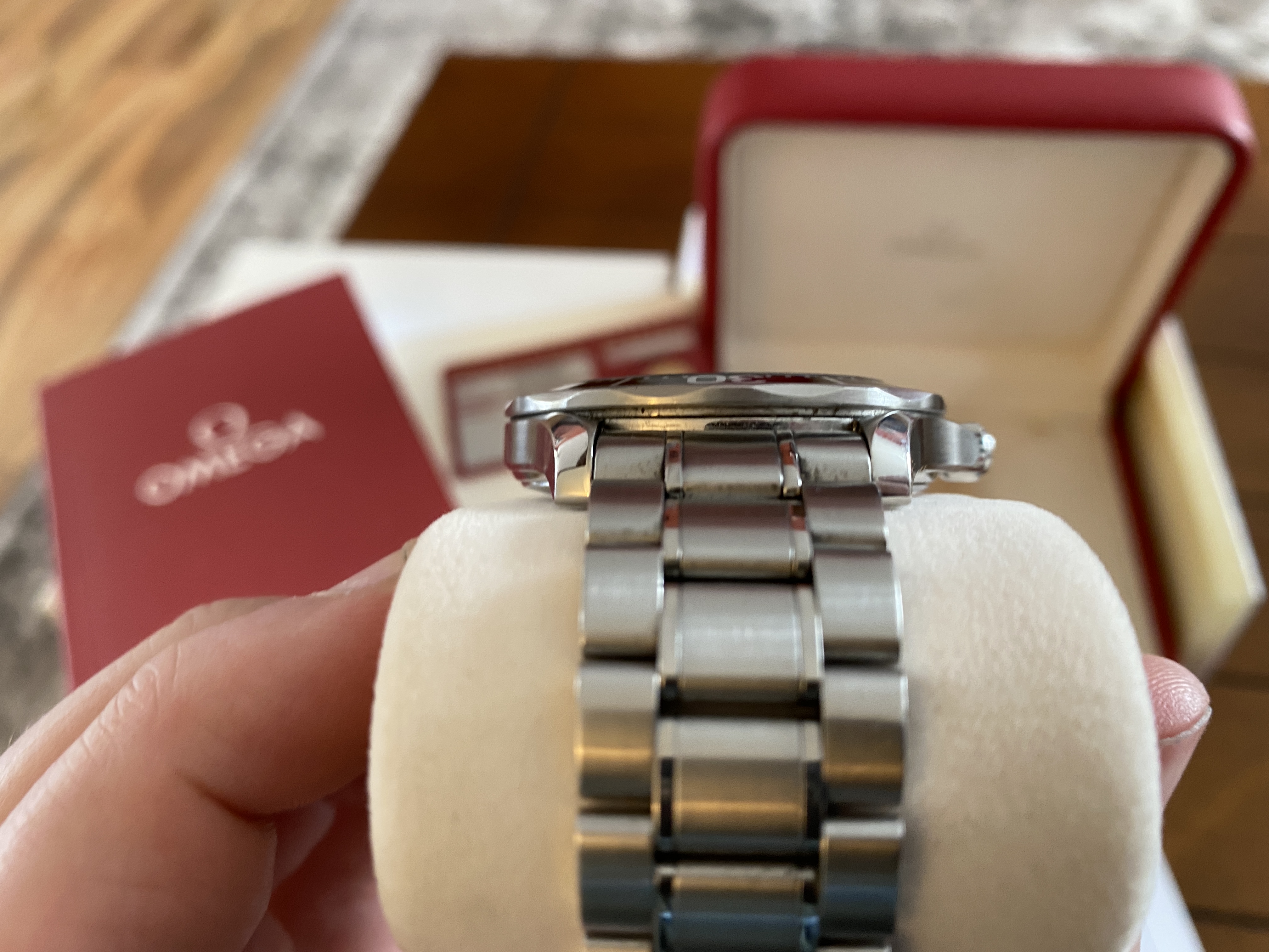 Purchased two years ago and has signs of usual wear. There are no dents. There are no cracks on the sapphire. It is in fantastic condition! Keeps great time at around +8 sec/day. Simple a beautiful piece, well taken care of. OEM White box and red box show signs of age.