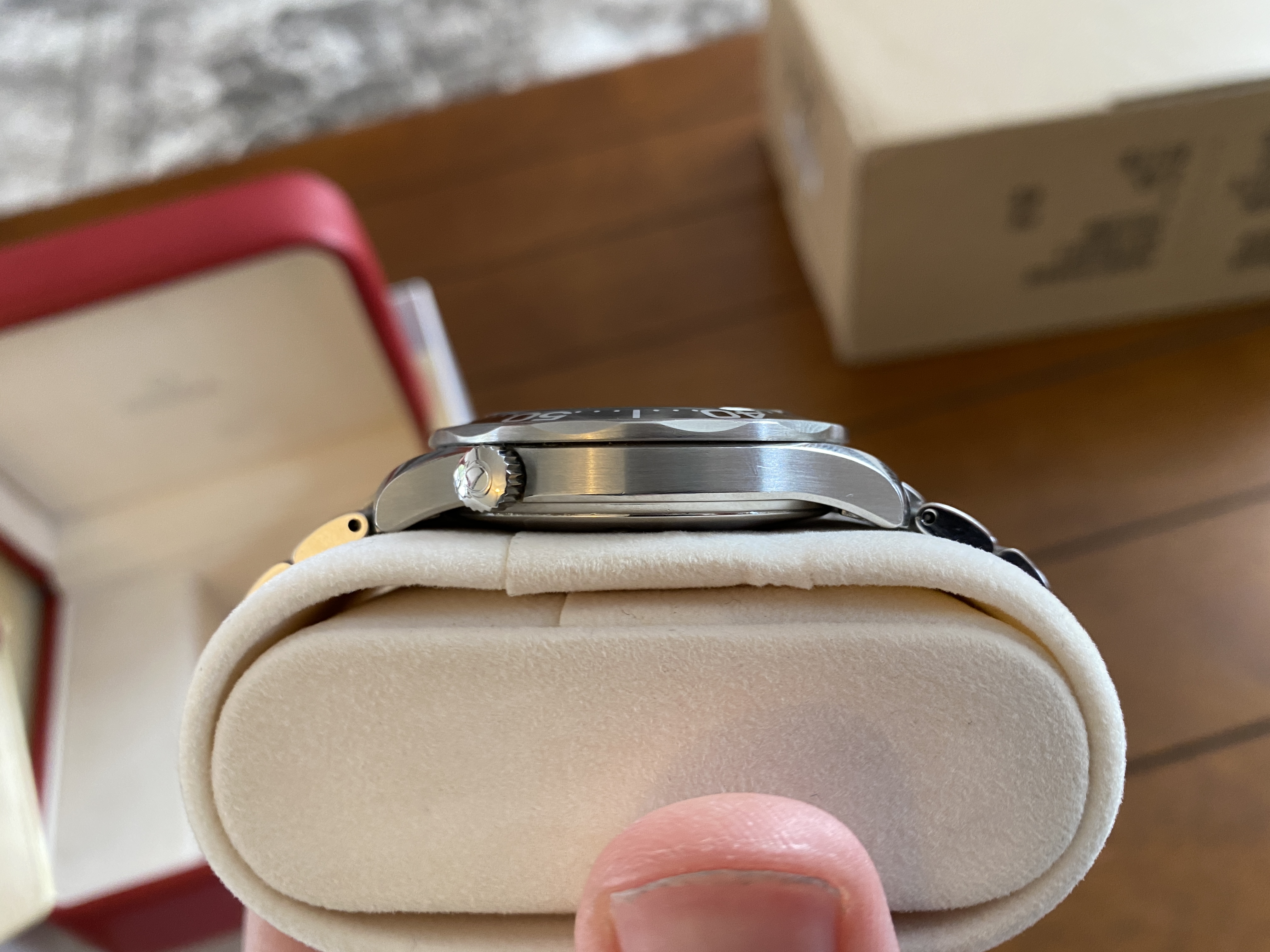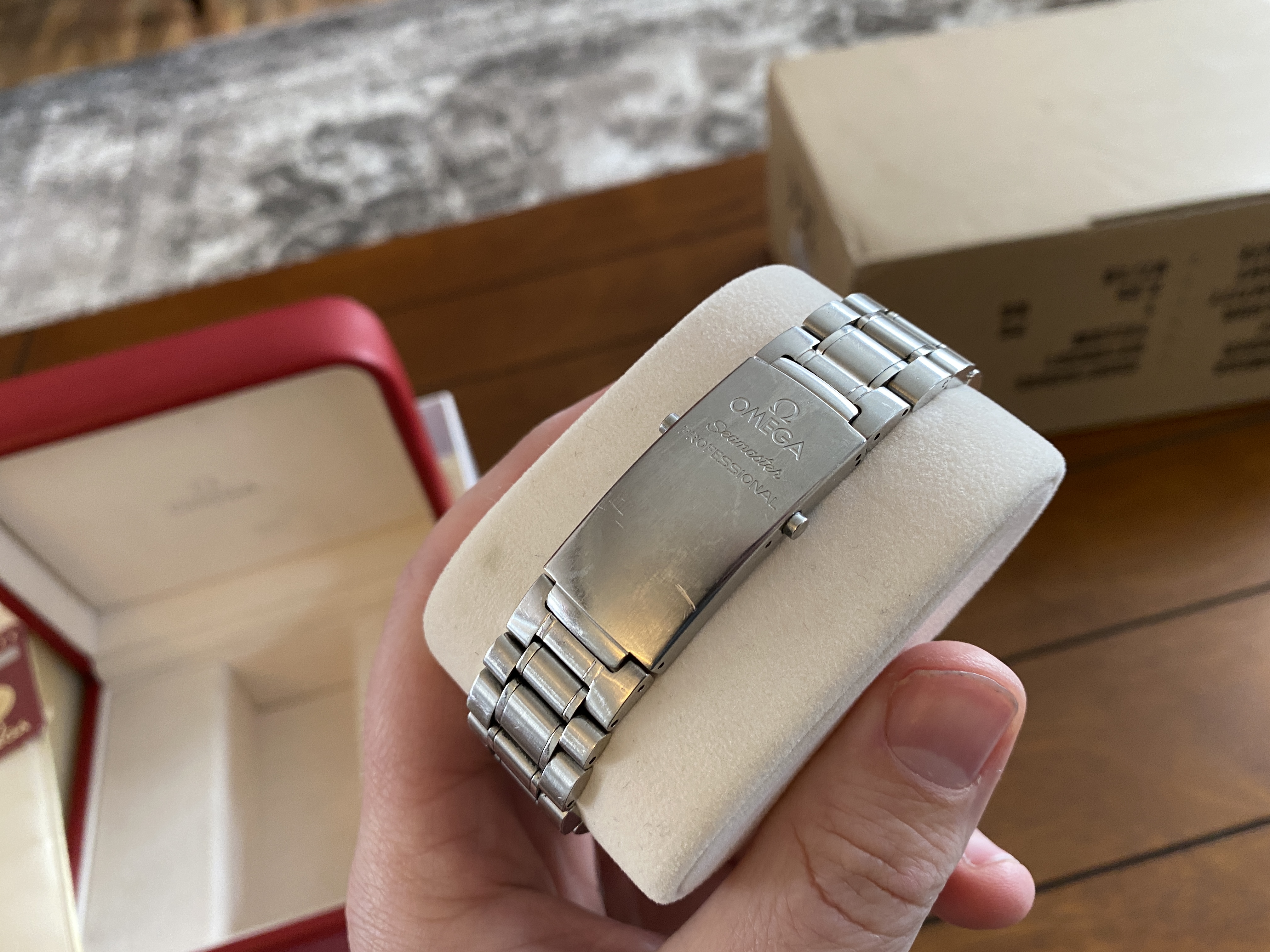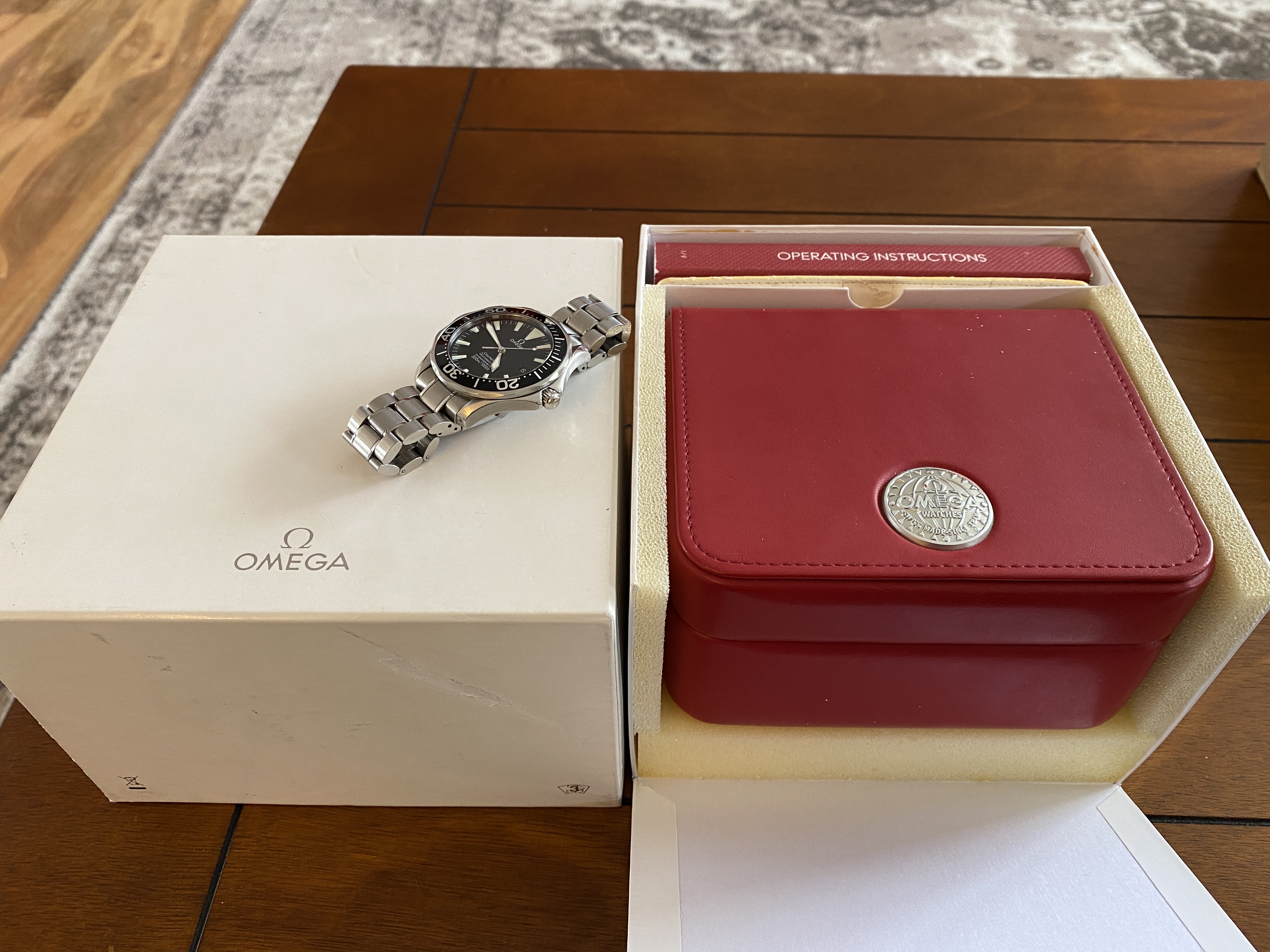 Purchased two years ago and has signs of usual wear. There are no dents. There are no cracks on the sapphire. It is in fantastic condition! Keeps great time at around +8 sec/day. Simple a beautiful piece, well taken care of. OEM White box and red box show signs of age.