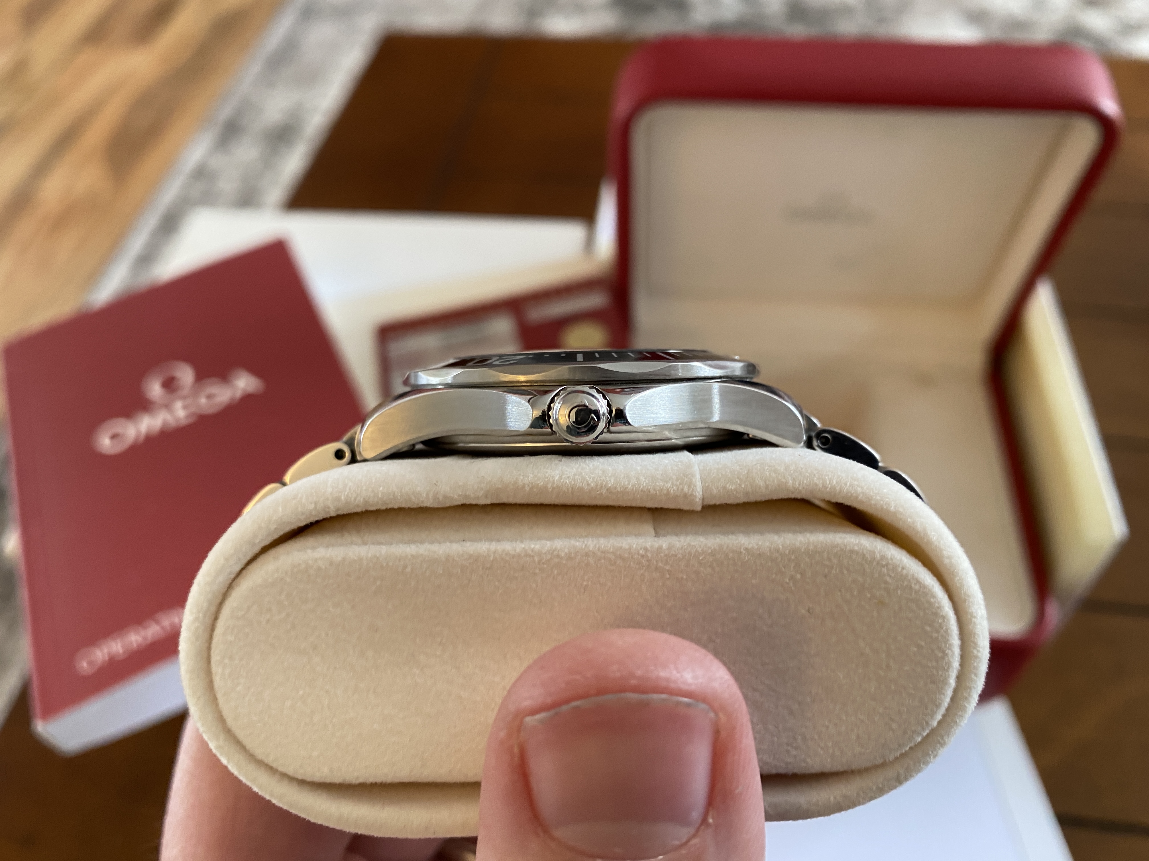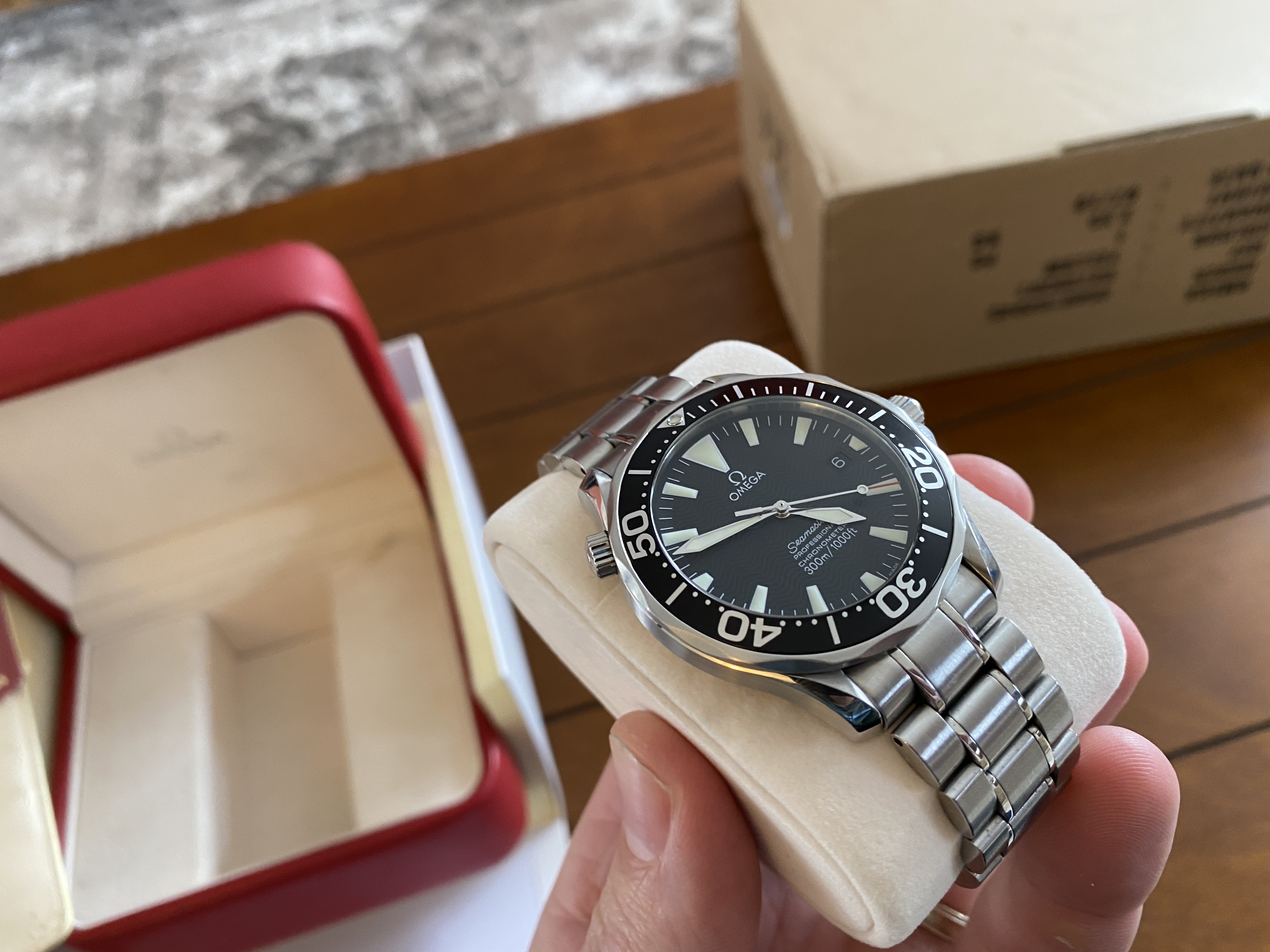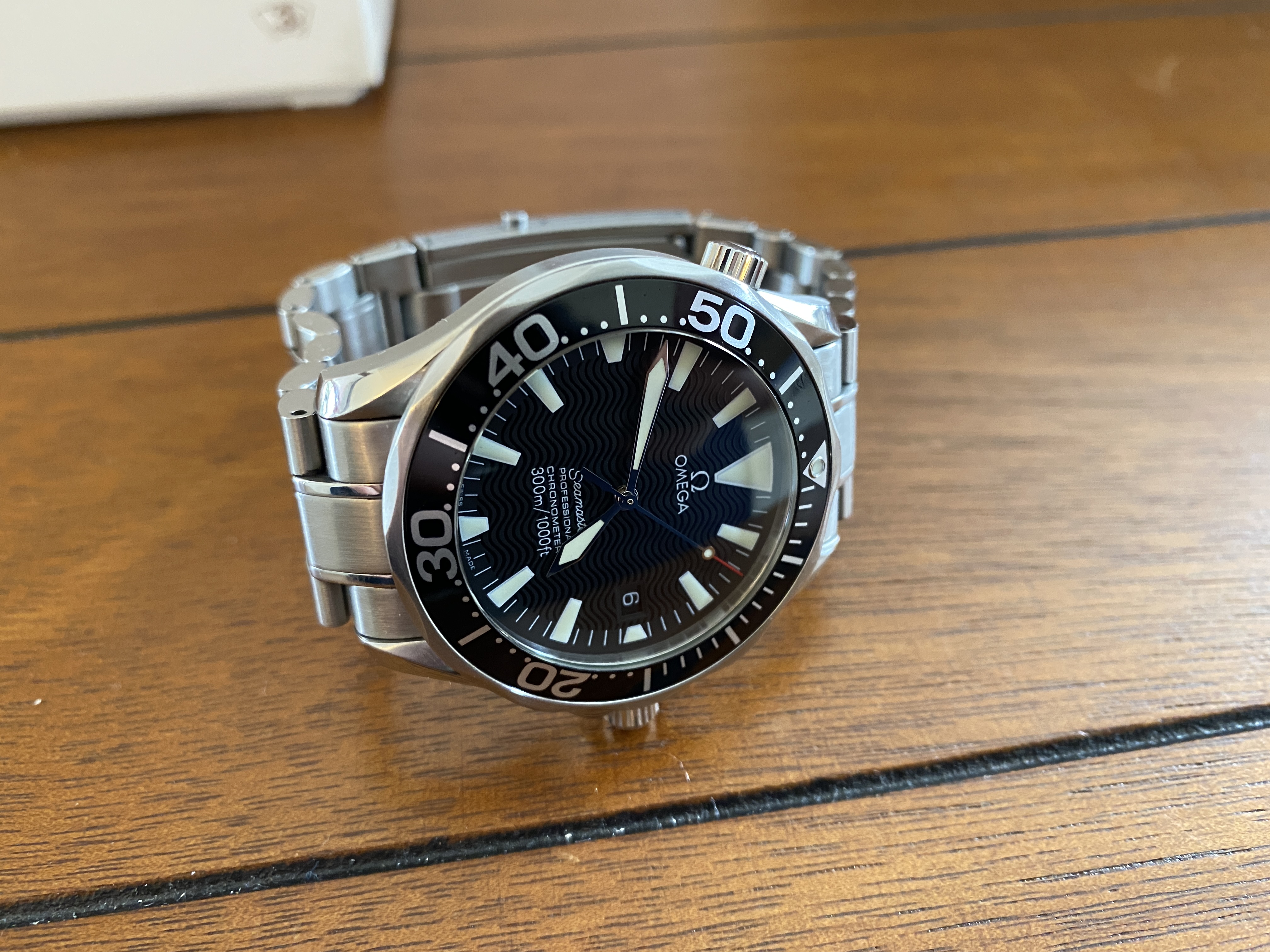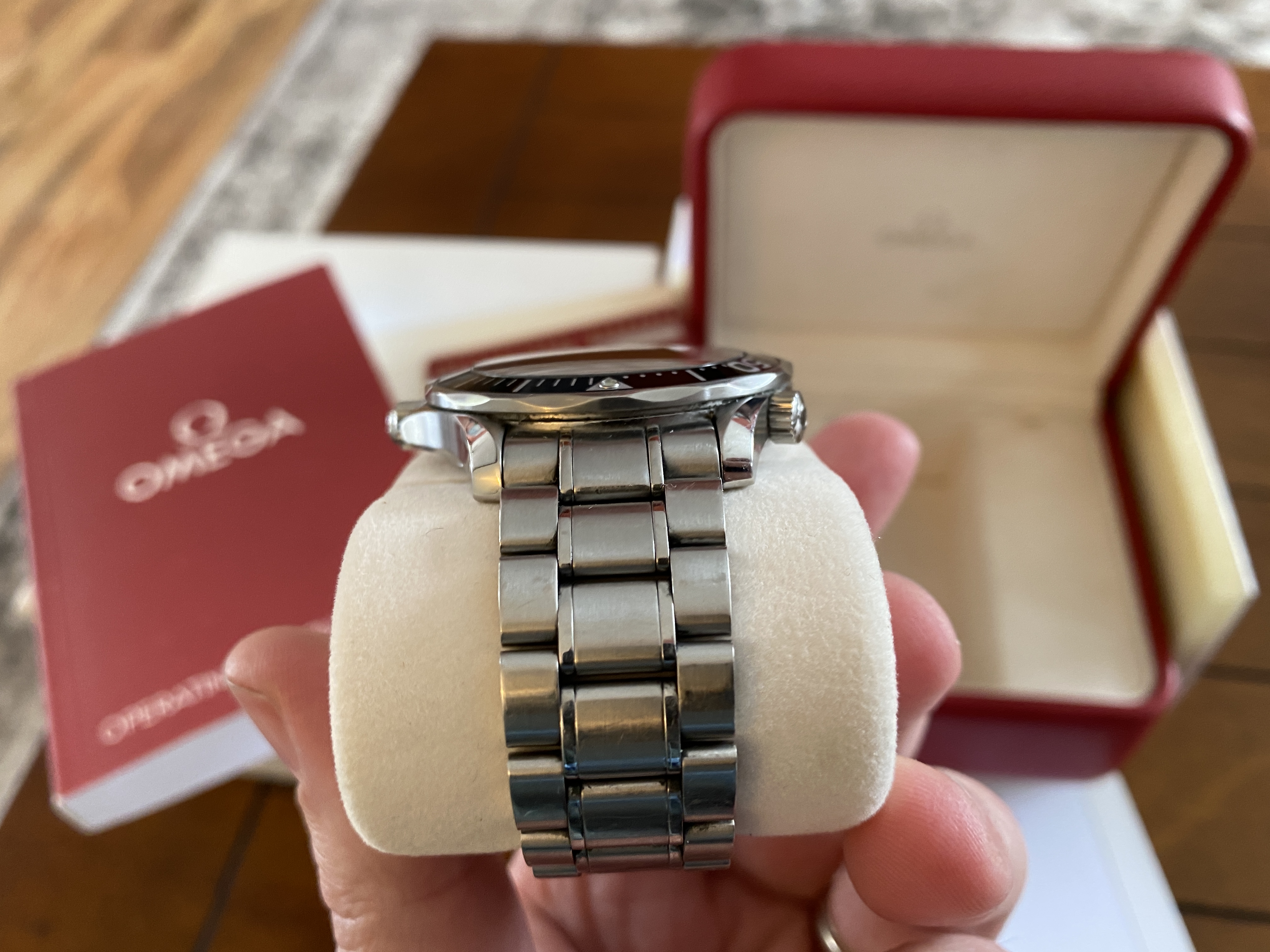 Purchased two years ago and has signs of usual wear. There are no dents. There are no cracks on the sapphire. It is in fantastic condition! Keeps great time at around +8 sec/day. Simple a beautiful piece, well taken care of. OEM White box and red box show signs of age.