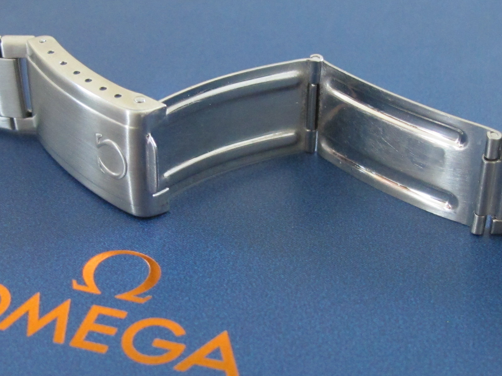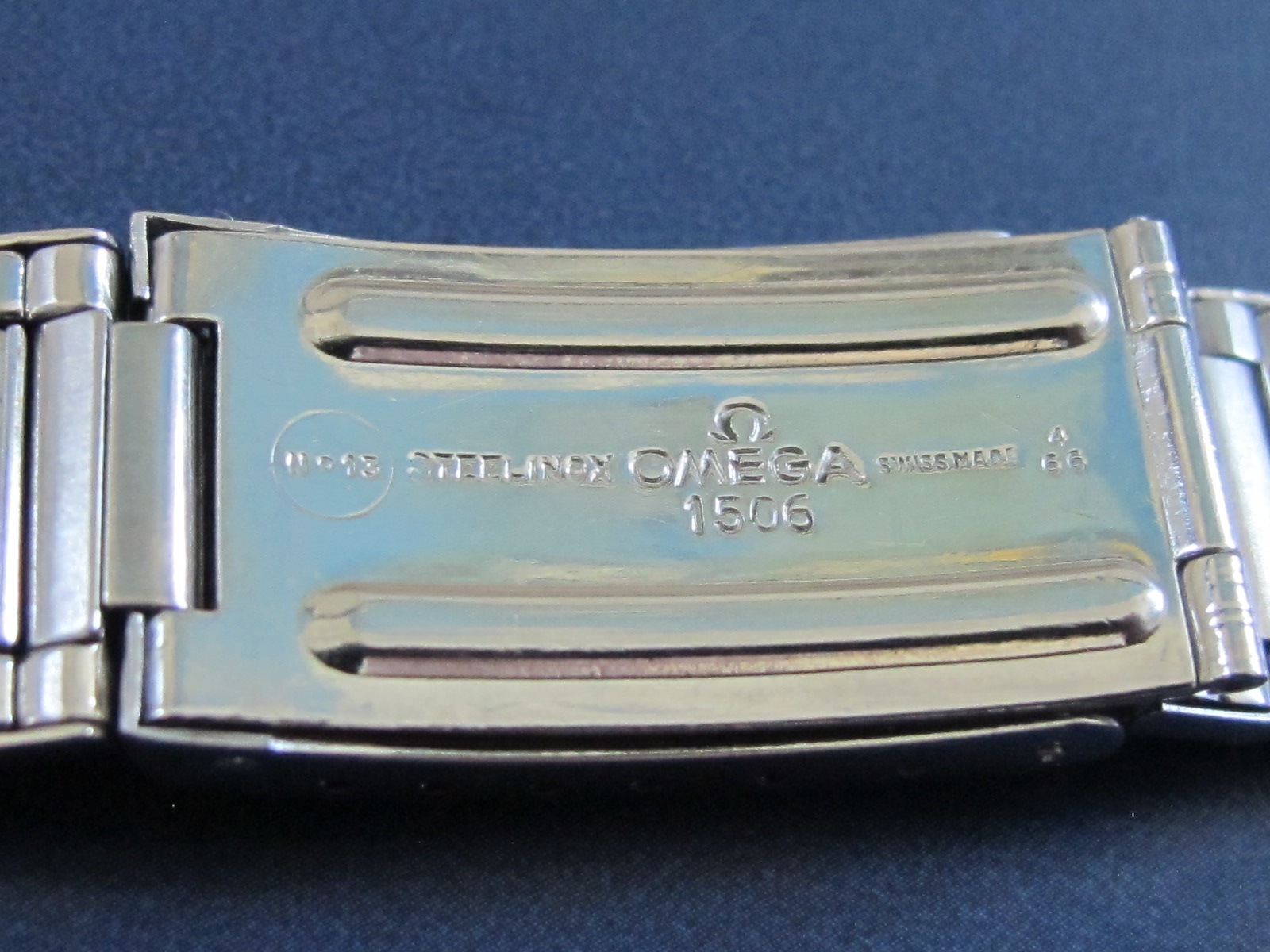 - Bracelet is the very comfortable 1506 flat-link with 16 end-links dated 4/66. It’s in excellent overall condition with little stretch and 22 links total - 9 links/13 links - to fit up to an 7.5 inch wrist. It’s signed with the Omega logo on the clasp and "No. 13, Steelinox, Omega 1506, Swiss Made, 4-66" on the inner hinge. NOTE: The buckle was replaced at some point so the current buckle came from a 1039 bracelet.