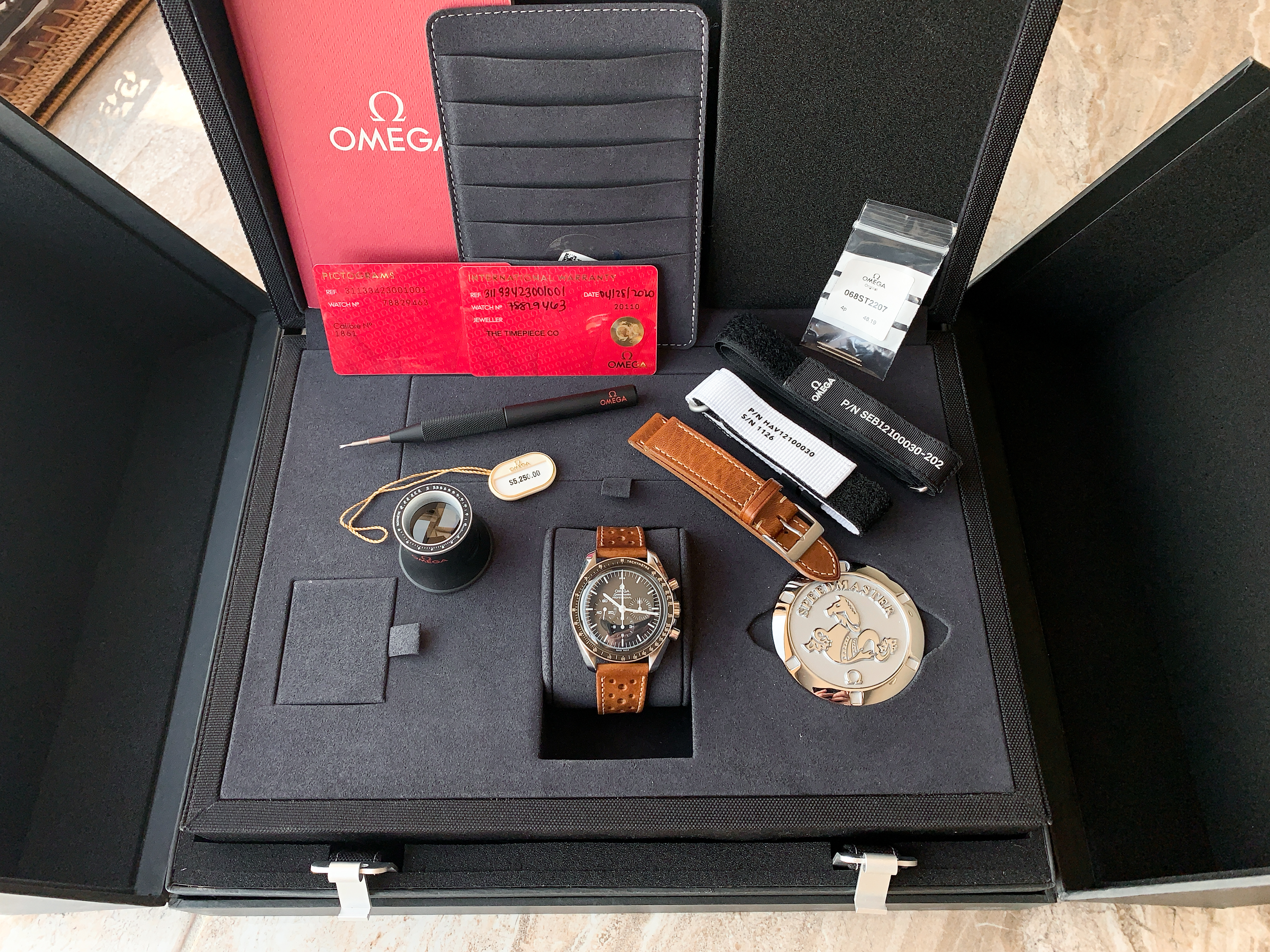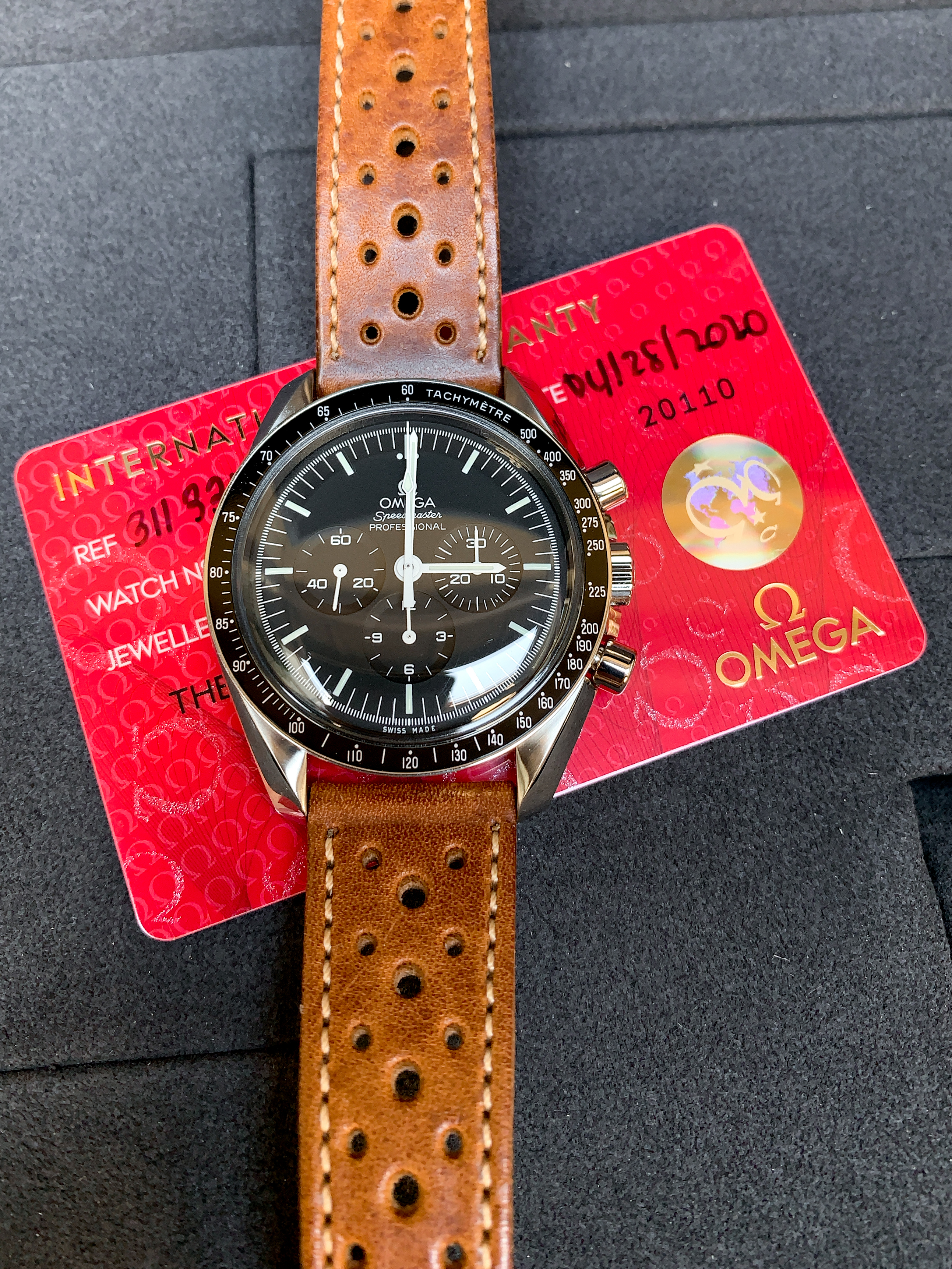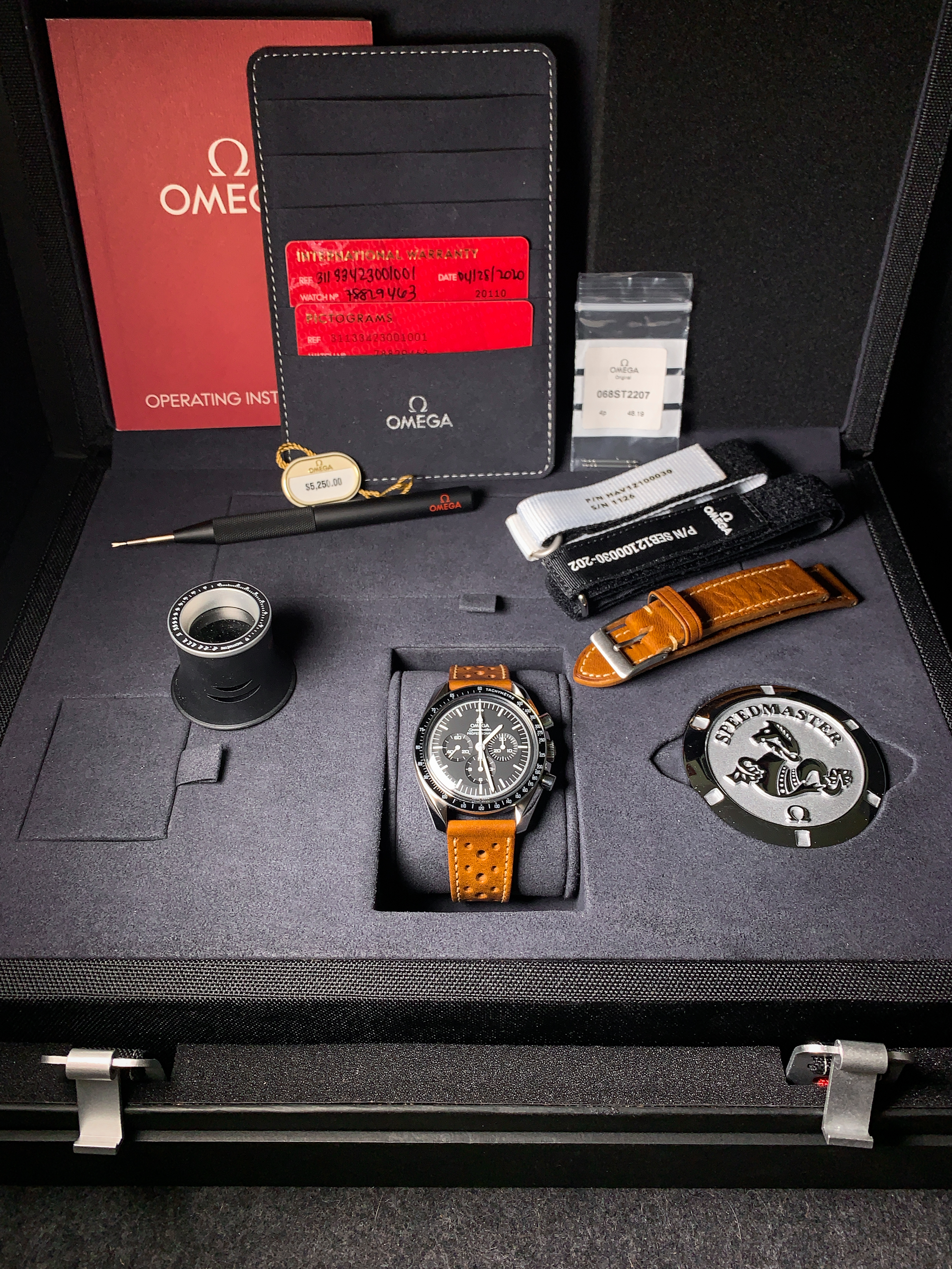 For sale is a modern 2020 Omega Speedmaster Professional 311.33.42.30.01.001 with box and papers. I bought this watch brand new but to be honest didn’t connect with it. The warranty card is dated 04/28/2020. Soon after I bought the watch I sold the OEM alligator leather strap and OEM Nato but those are the only two original items not included. Everything that is shown in the listing is for sale. What’s included is the watch, full grain leather racing strap, new unused full grain leather strap, OEM Nasa nato, new unused Haveston white Nasa nato, OEM loupe, OEM spring bar tool, OEM spring bars (one set holding the leather strap on and one set in the bag), price tag, manual, card holder, pictogram, international warranty, brown exterior box, exterior box, and suitcase box. The box is in excellent condition as, as soon as I took the watch out, the box was stored away in a closet.