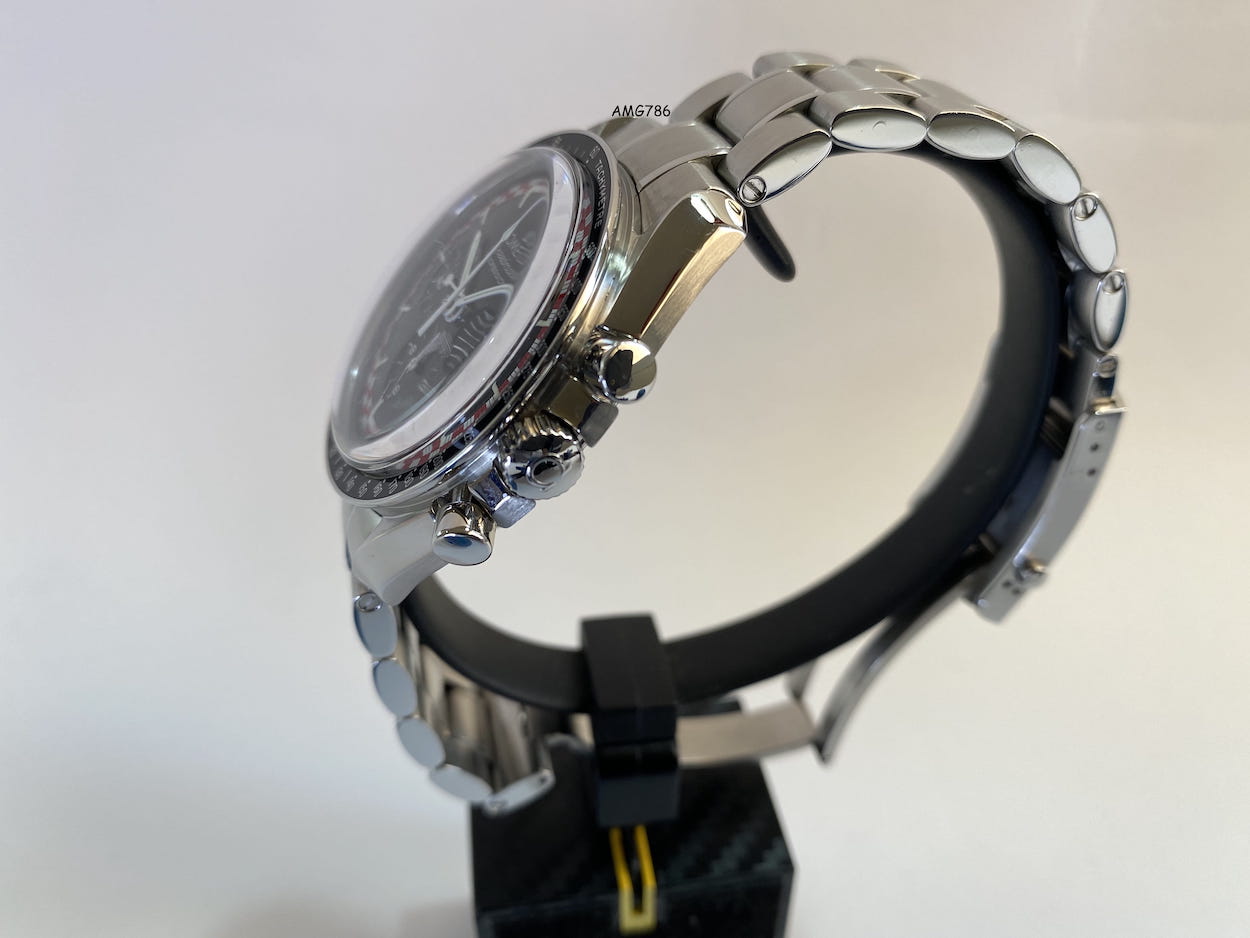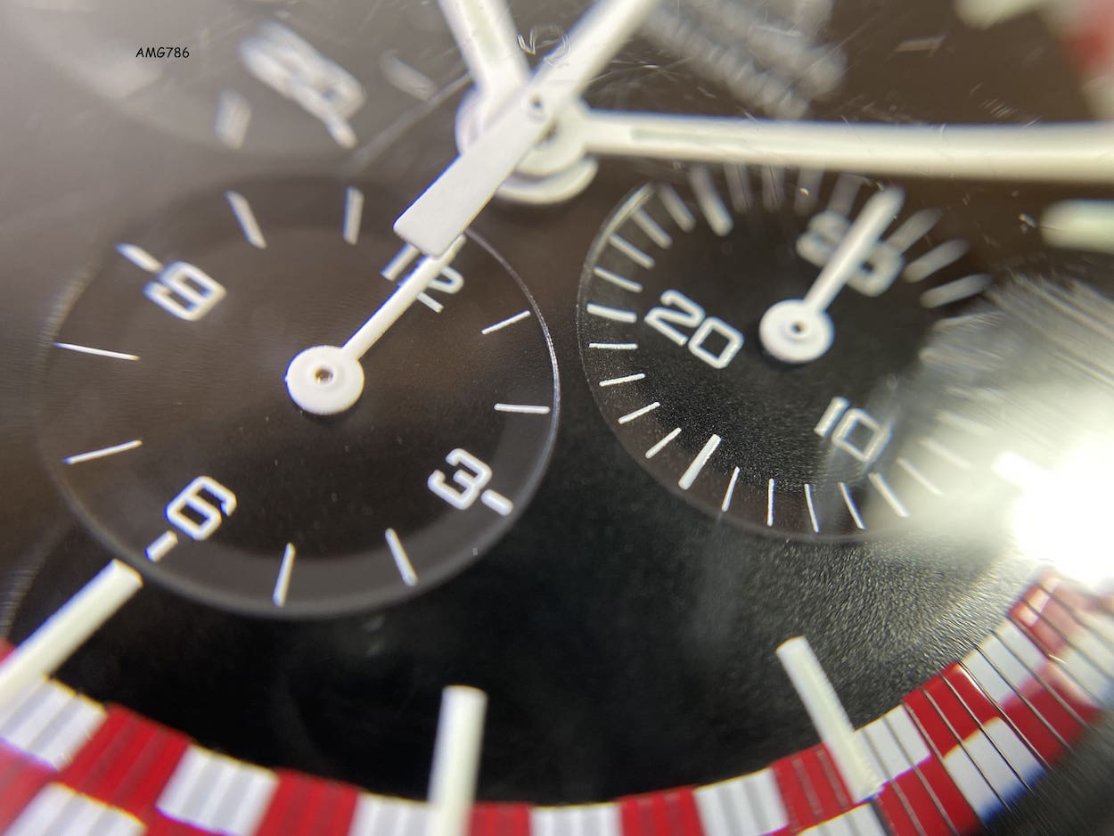 Famous manual-winding chronograph movement. A descendent of the calibre that was worn on the Moon. Rhodium-plated finish.