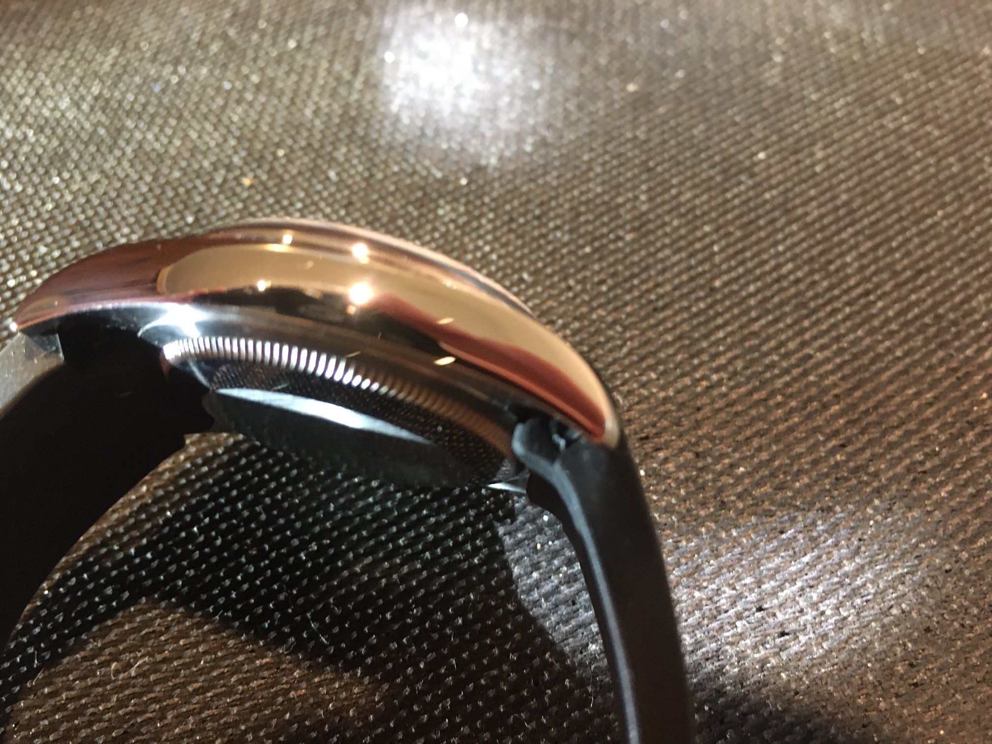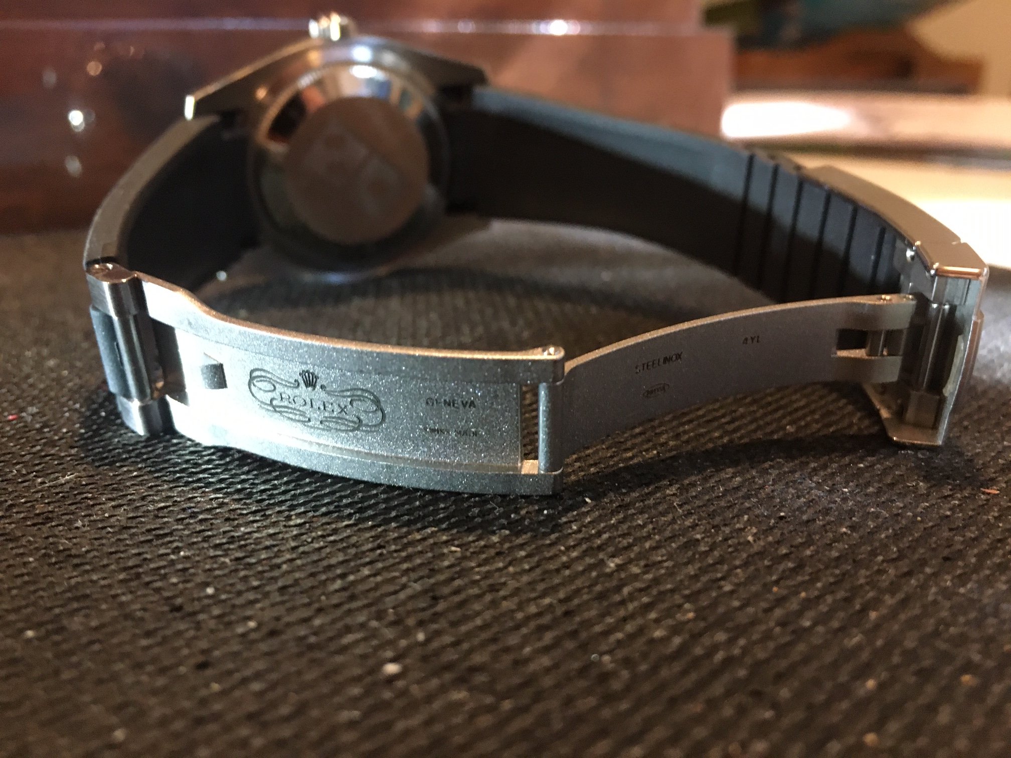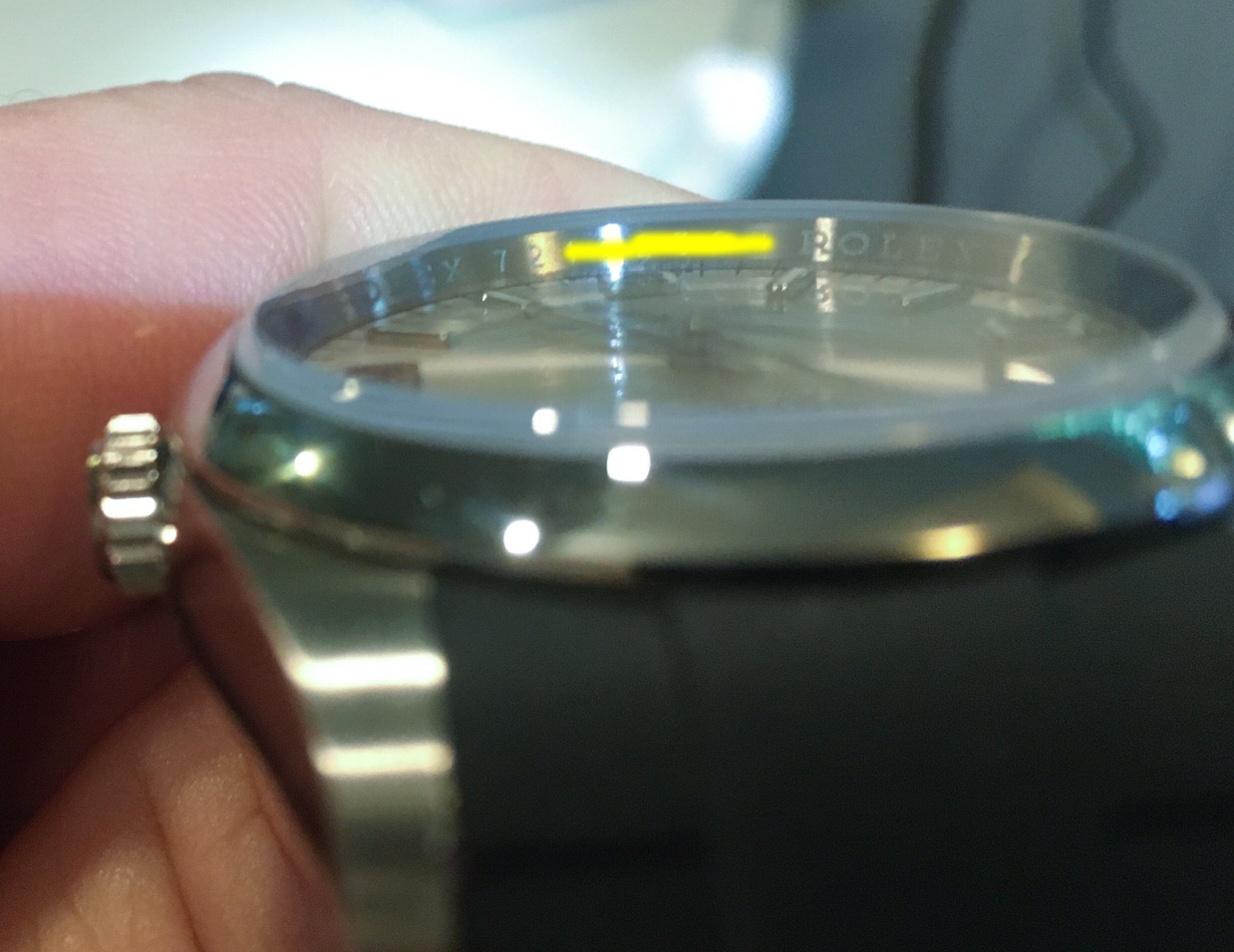 What else to say?--it's a Rolex: in-house-produced white gold hands and dial indices, crisp lume, engraved rehaut (with the serial at 12), very smooth crown action, screws down to seal with the crown precisely pointed up. It feels a bit obnoxious to mention 904L steel, but there you go. Very hard-to-see multilayer etched Rolex logo within the sapphire crystal at 6 o'clock: that's certainly one of the most ingenious authenticating features on any watch. (It took me a few minutes to see it in the loop with a flashlight!) The watch keeps impeccable time--presumably within COSC standards: it gains only a few seconds a day.