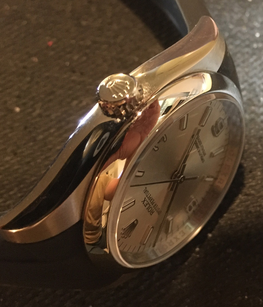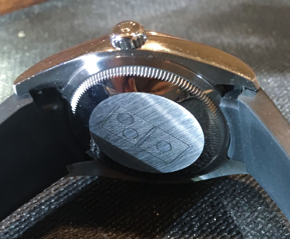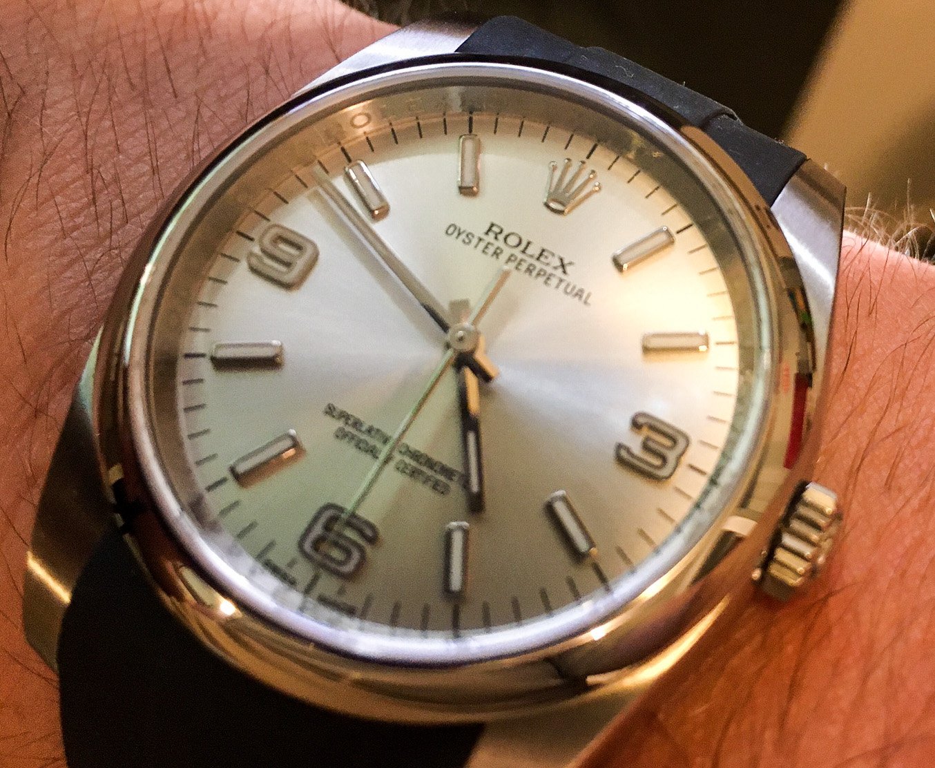 The case measures 36mm (not including crown). The watch was a corporate gift from Domino's Pizza Inc to a franchisee (easy enough to Google about if you're interested), and so the original Oyster bracelet (included) and caseback are branded. However, the watch is mounted to a fitted/curved-end rubber strap (outfitted with the OEM Rolex clasp), so there's no visible branding when it is worn, and my AD informs me that Rolex can very likely replace the caseback upon request with a plain one whenever the watch gets serviced (---it doesn't need a service anytime soon, so I haven't bothered). It can also be refinished (again, according to the AD) by a competent watchmaker as a way to remove the very shallow laser engraving. And if you want to use the bracelet but don't like the branding, it's of course possible to replace links for far less than the cost of a whole new bracelet. Point is, unlike earlier versions of the Domino's watch with the logo painted on the dial, this one flies under the radar and need not be branded forever. (If I end up keeping this watch, I will likely leave the bracelet in storage, since I prefer straps, and eventually have the caseback replaced by Rolex.)