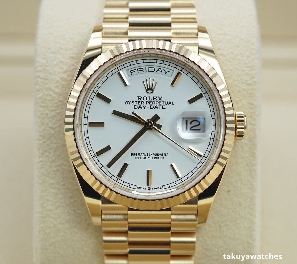 ·Rolex 128238 DAY DATE 36 YELLOW GOLD WHITE INDEX DIAL 2023 WARRANTY FULL SET