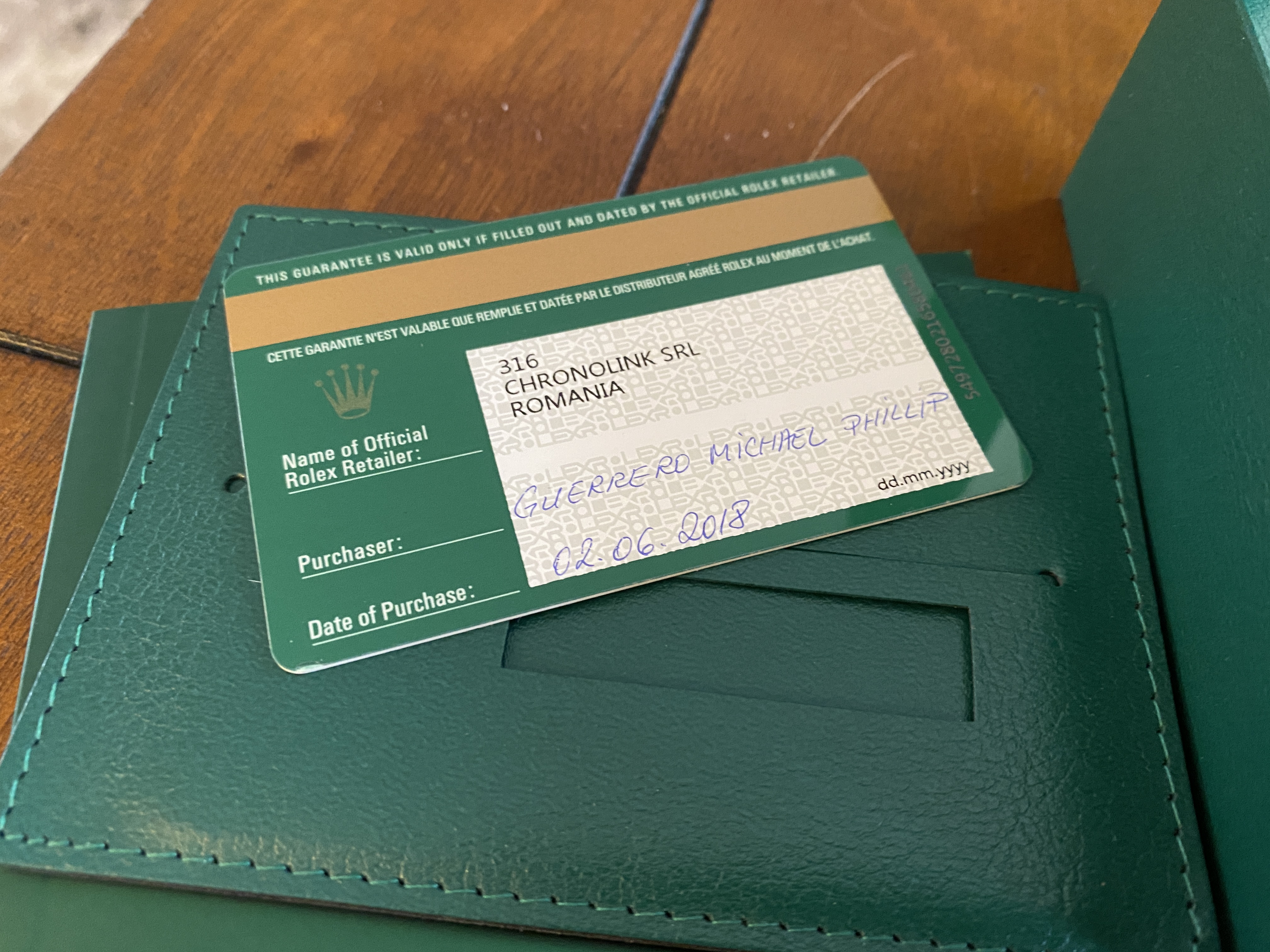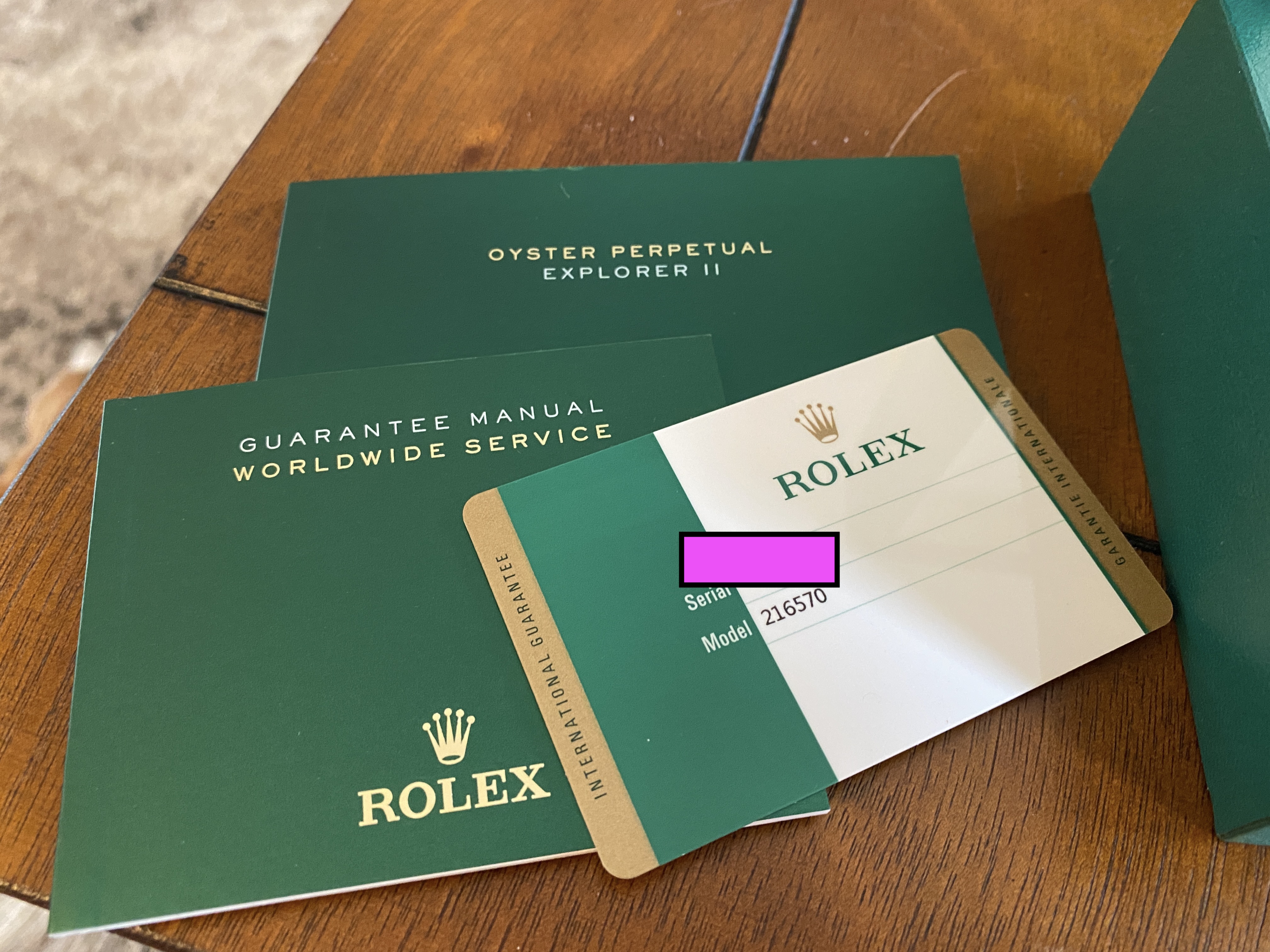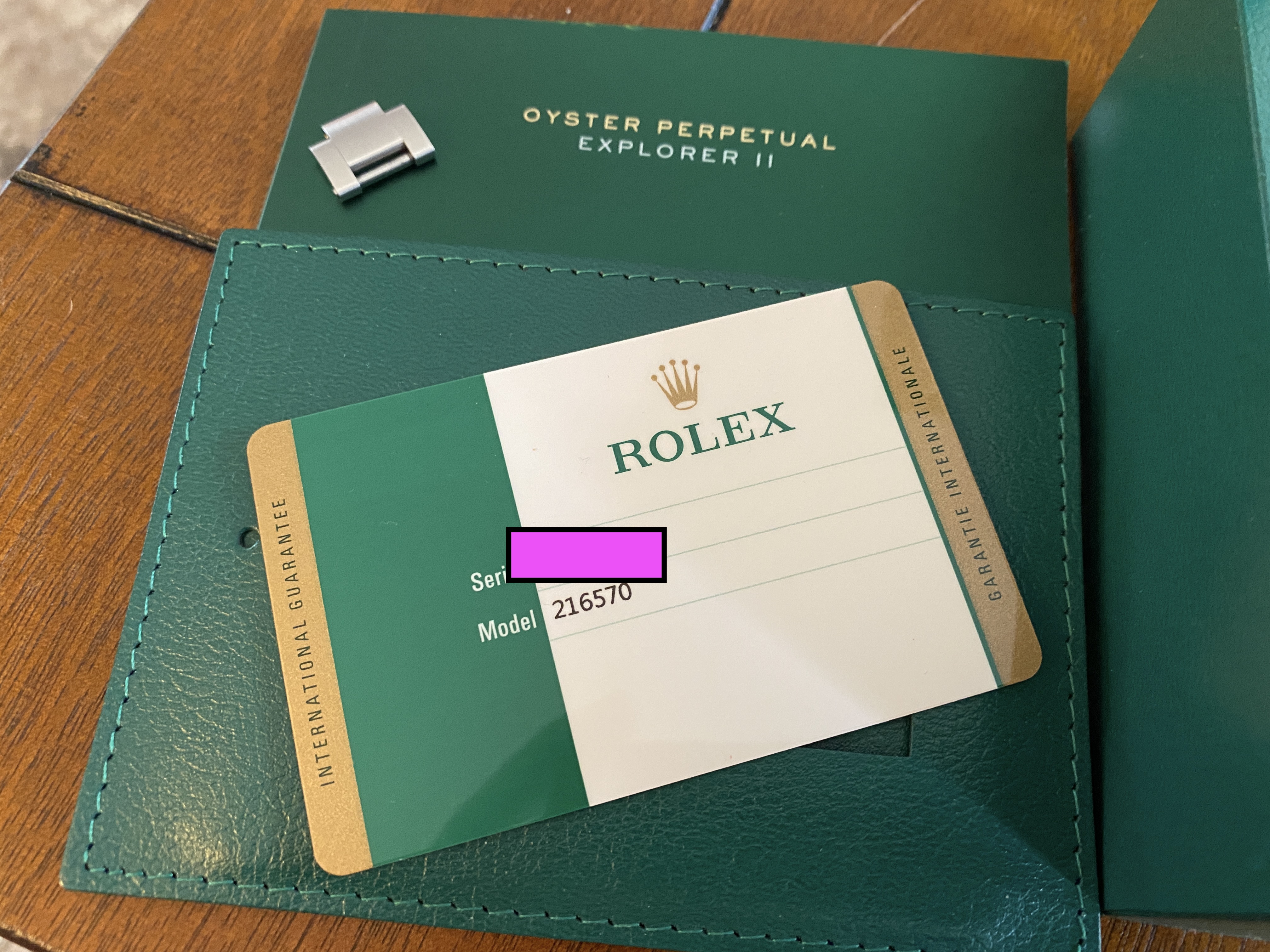 The watch comes with everything you see in the photos below. The serial number on the warranty card has been blocked for security but it matches the watch. This is a full set with white outer box, green OEM box, hang tag, both manuals, warranty/coa card. The extra lug is also included that was removed when I was sizing the watch to my wrist.