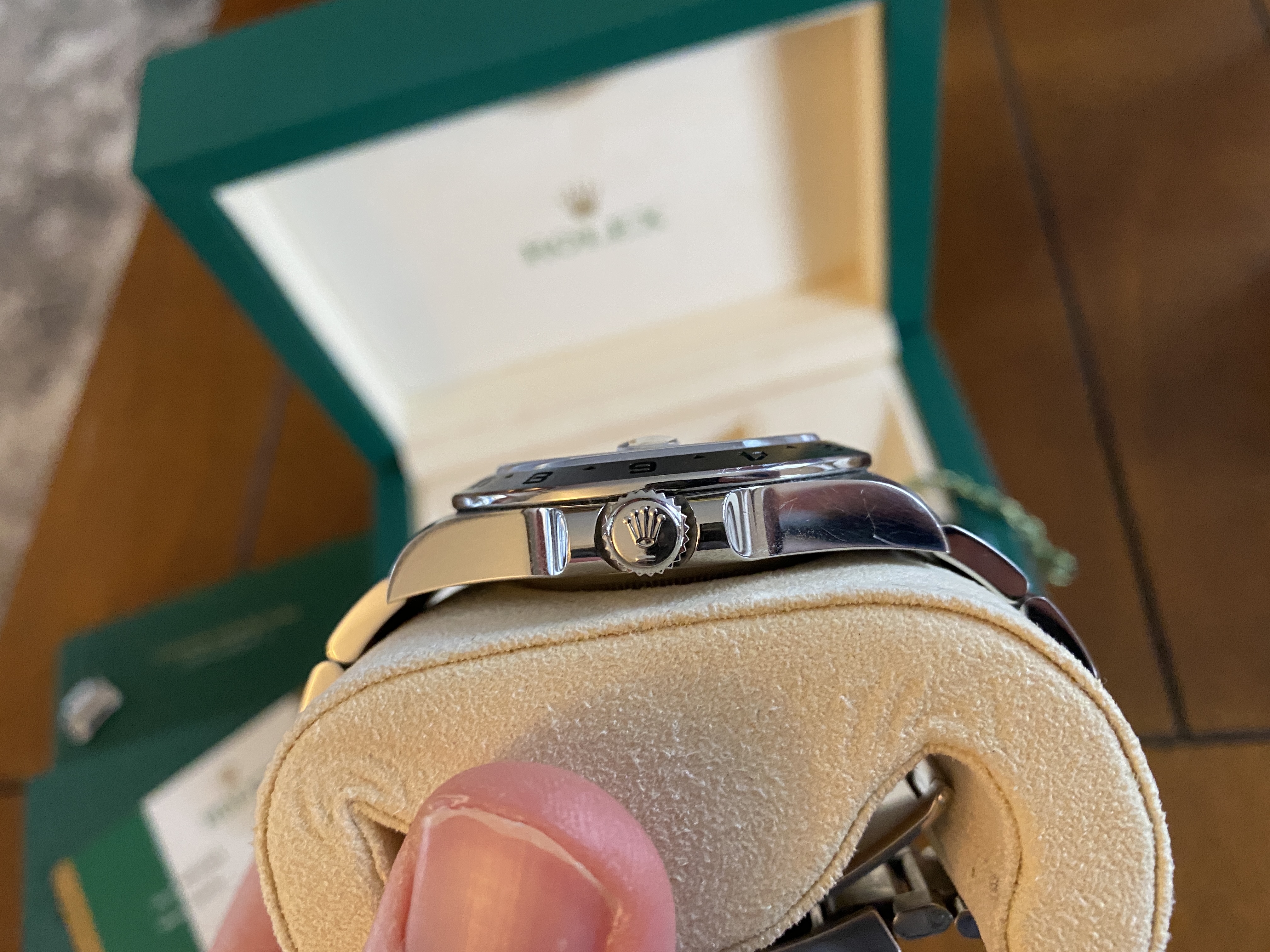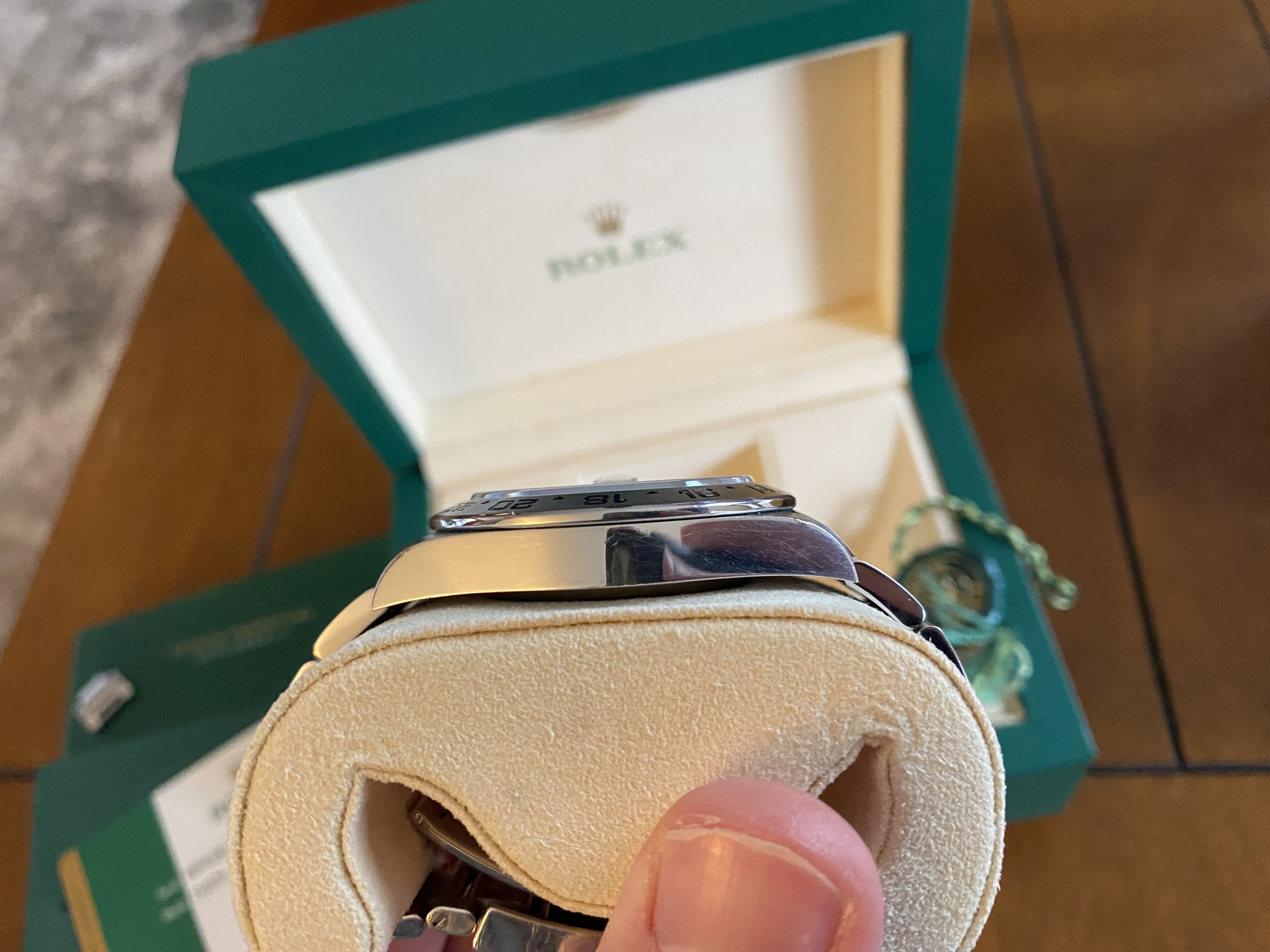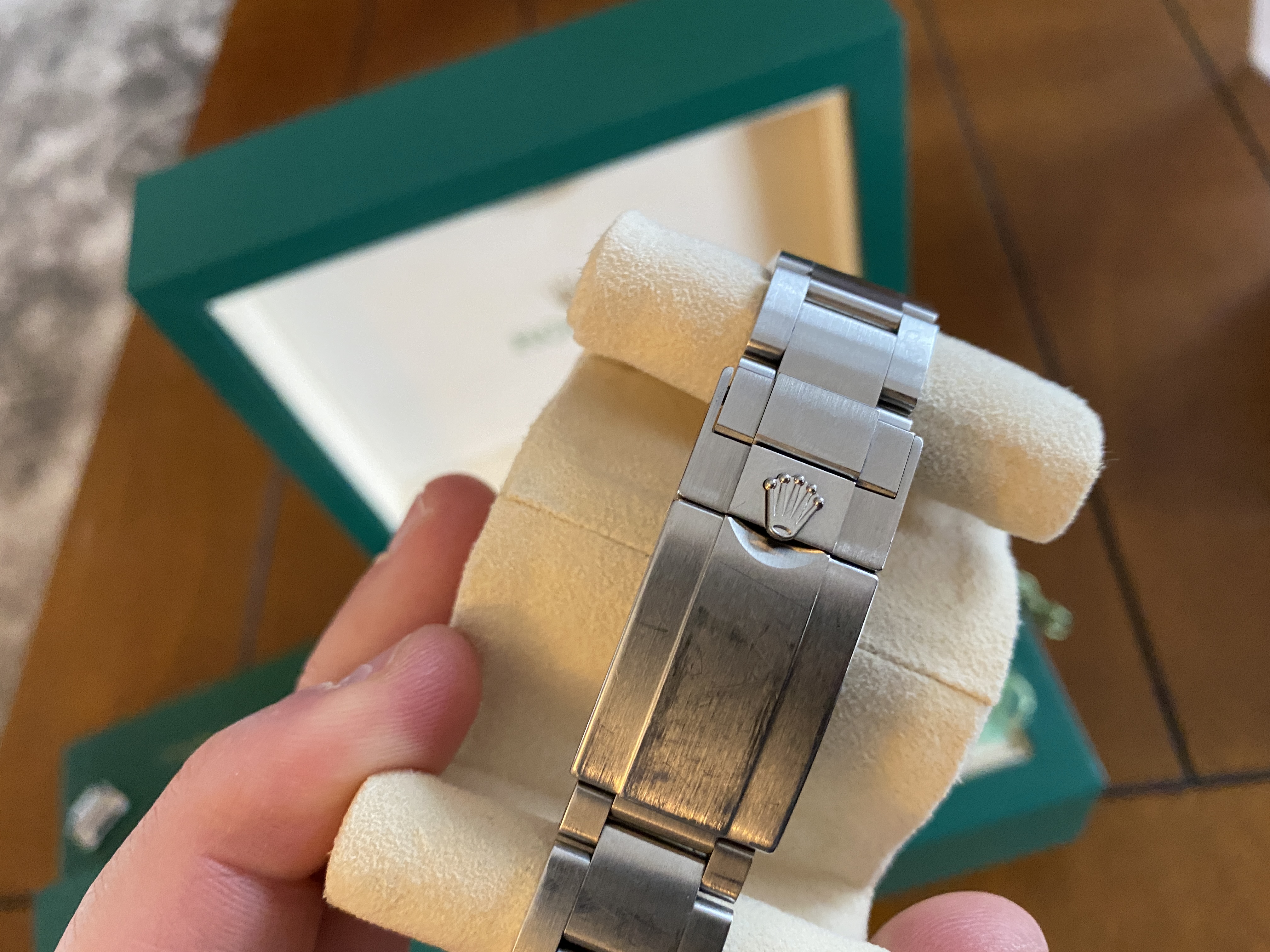 The watch is running phenomenally! There are absolutely no cracks in the sapphire glass. On the left bottom lug, on the front there is a very very tiny nick that is barely noticeable unless you look for it. I did my best to show it to you in the photos but again, it's very difficult to see. There are signs of regular use on the clasp from desk diving, etc. I've worn the watch daily for three months now.