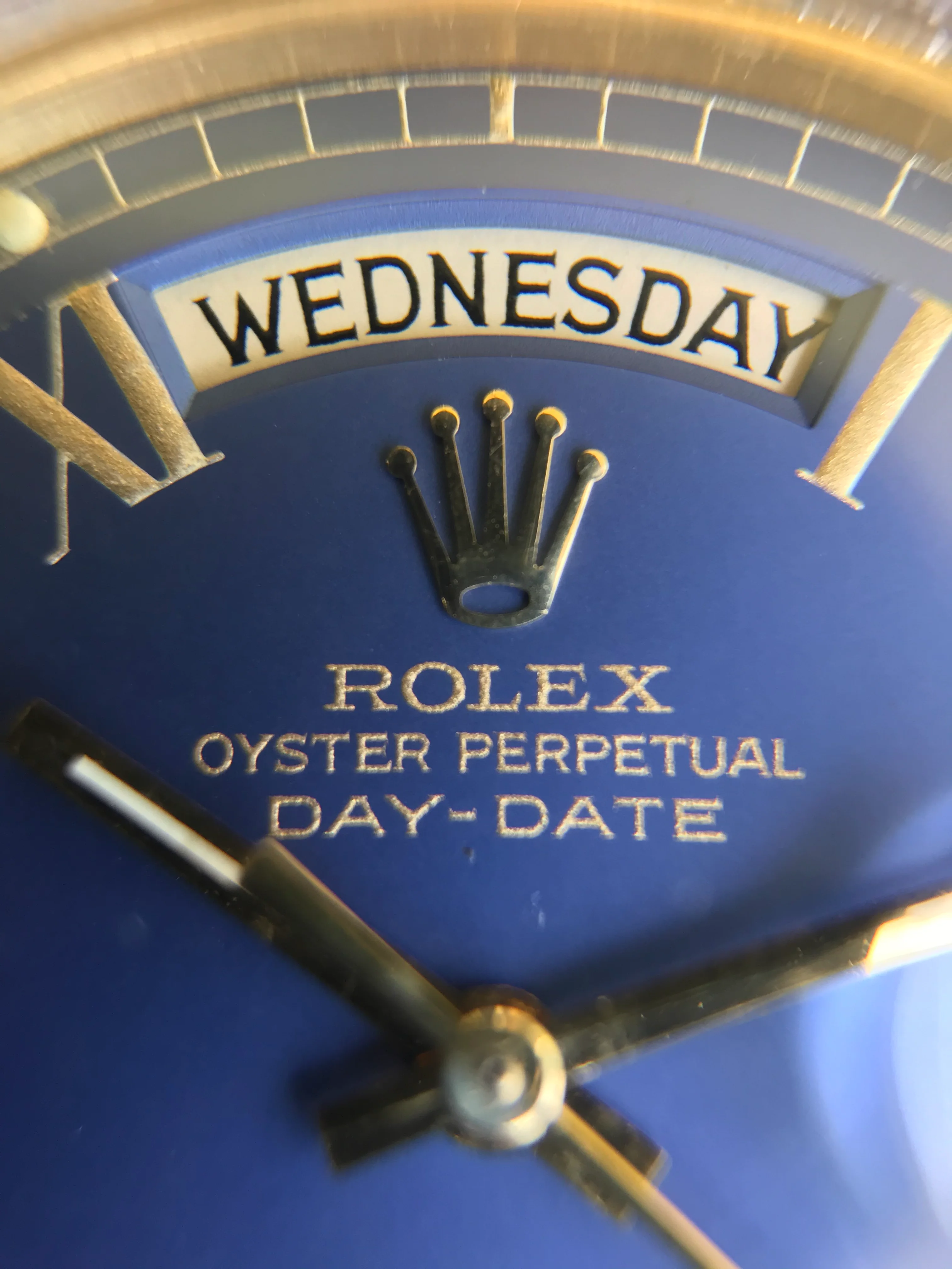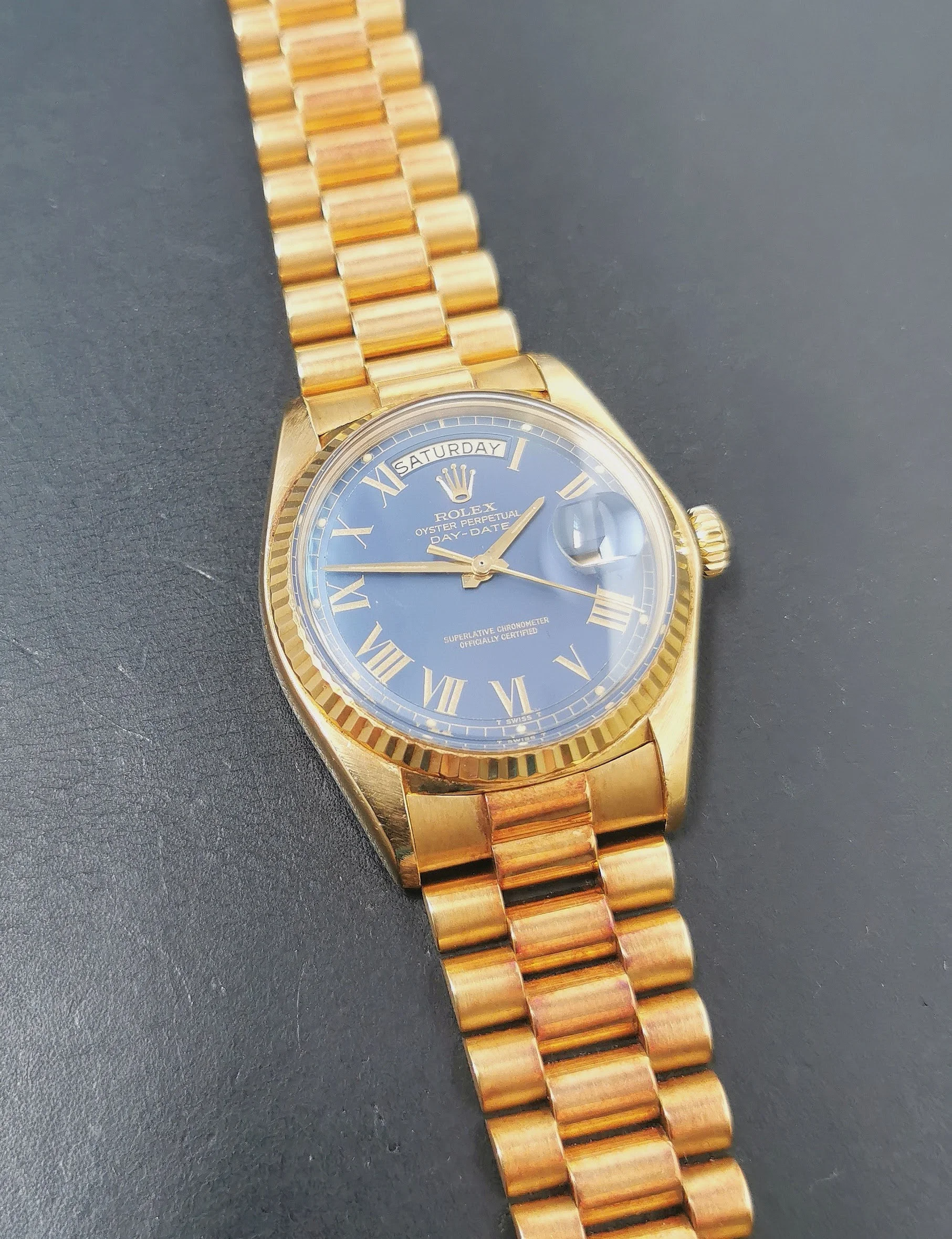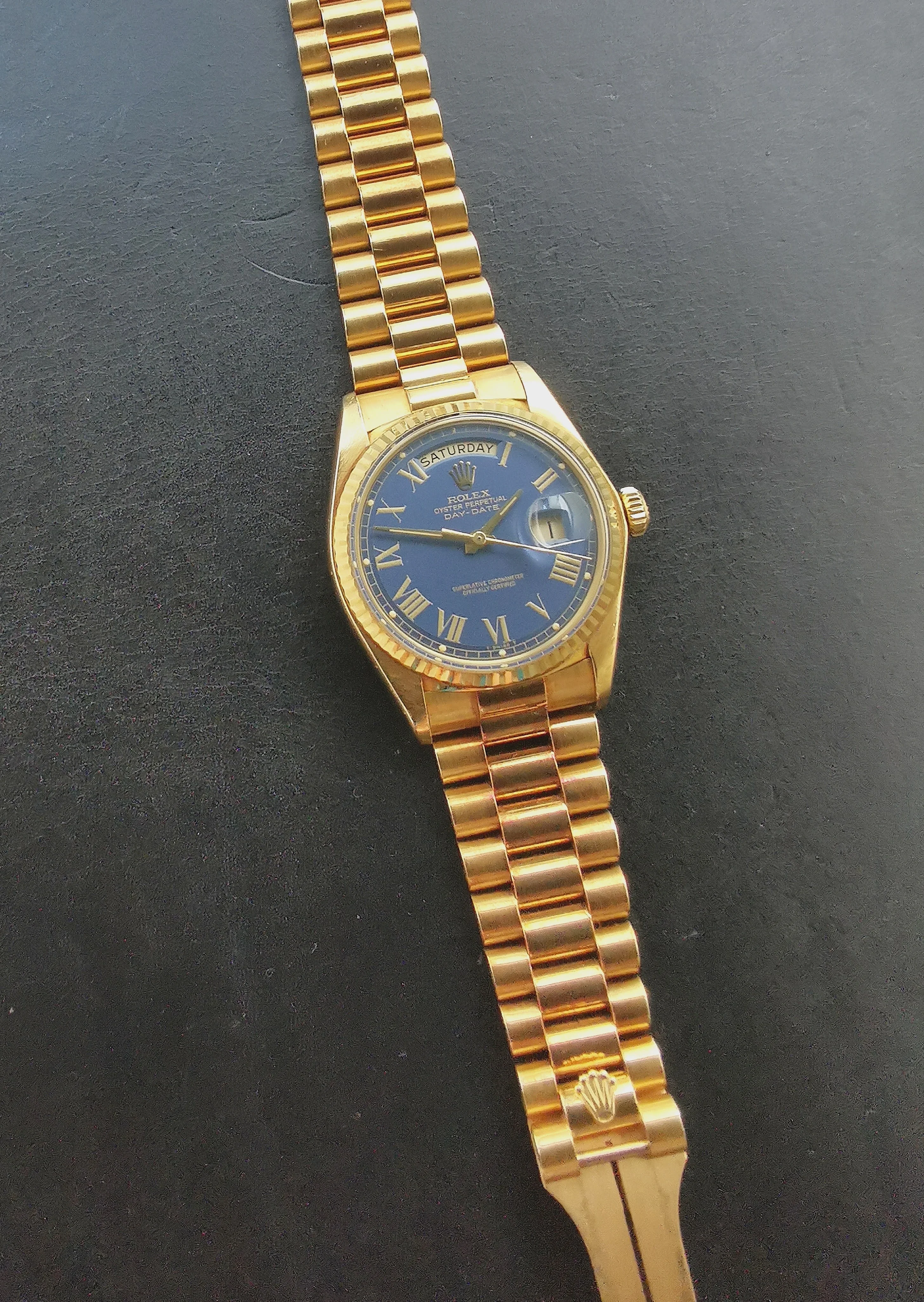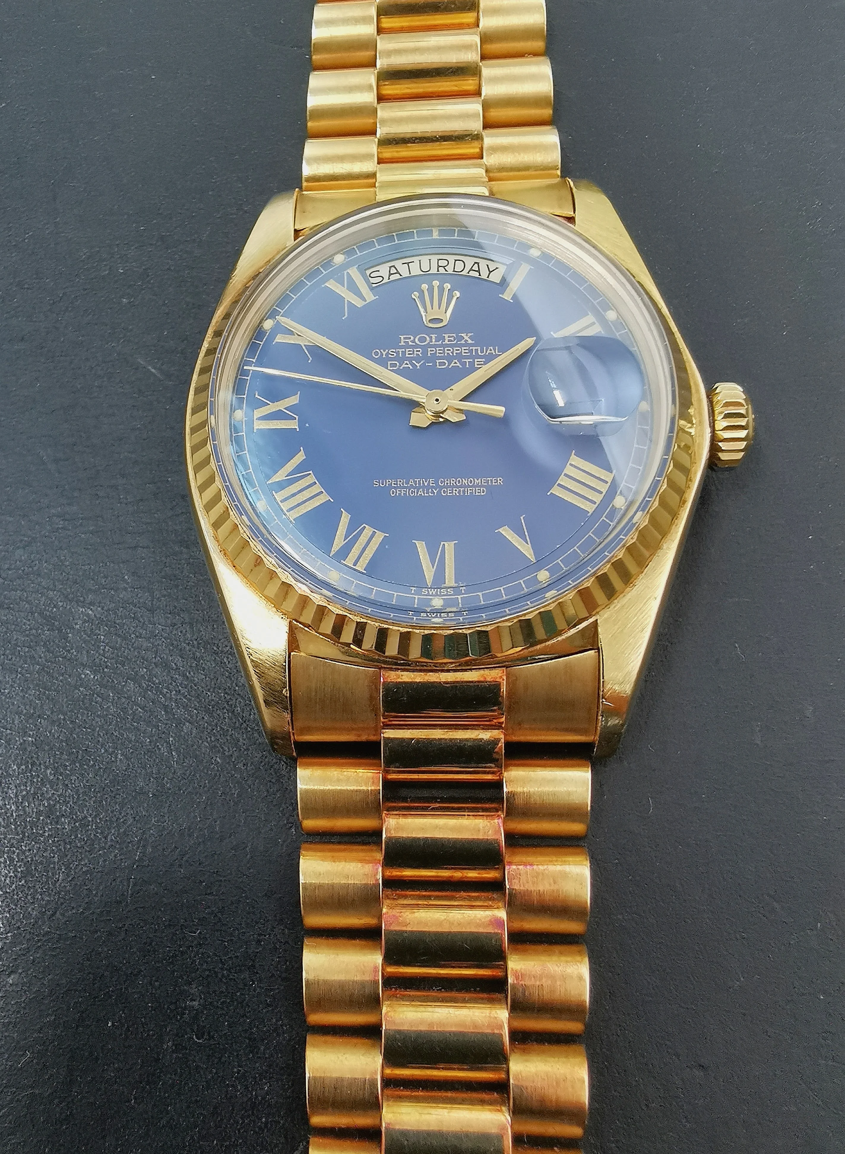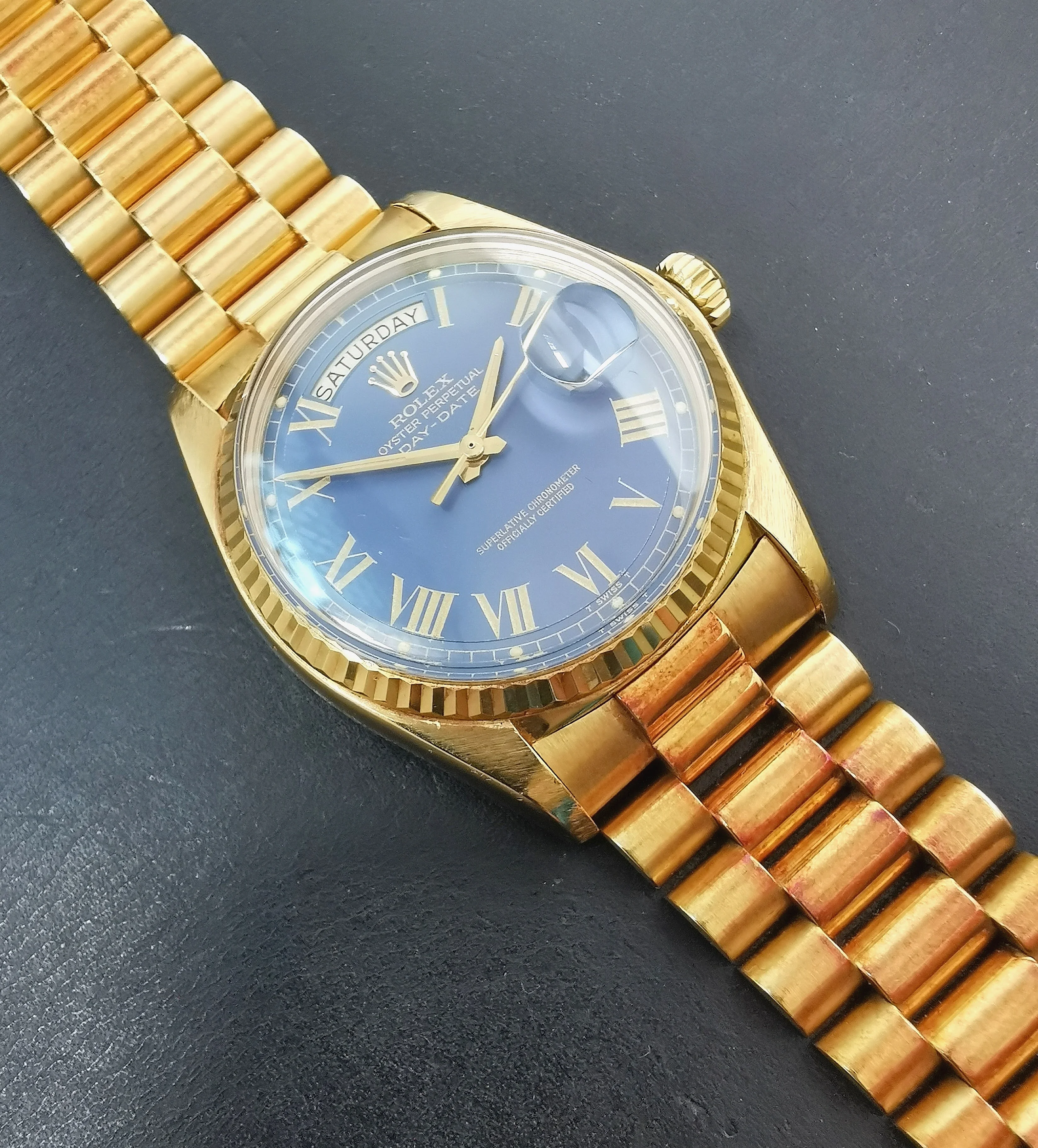 ·Originally released in 1956, the Day-Date is one of the most iconic watches ever produced. For sale is my yellow gold 1803 with an uncommon buckley blue roman numeral pie pan dial with the rarely seen cigarette boat hands. Automatic movement 1556 calibre non-quickset. After rocking this beauty as a semi daily beater for the past 5 yrs, I would like to fund for a new purchase and pass this on to another collector. Case measures at 36m, appears to have been previously polished and exhibits light wear from use. Retains good proportions and remains thick. Caseback hallmark engravings behind lugs are visible via a loupe.
