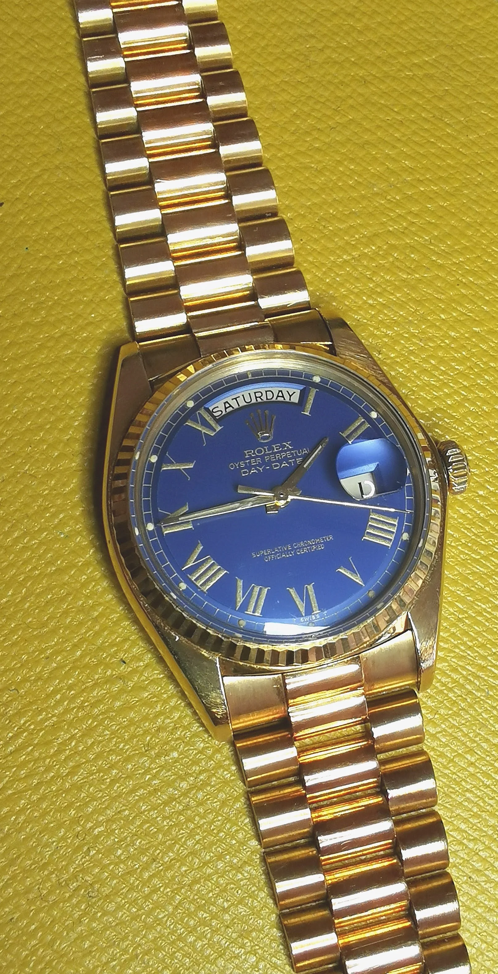 Watch only, does not come with box & papers. 18k YG concealed clasp yellow gold president bracelet is in very good condition with no stretch and 55 end links. Non period-correct. Now for the pictures to do the talking.