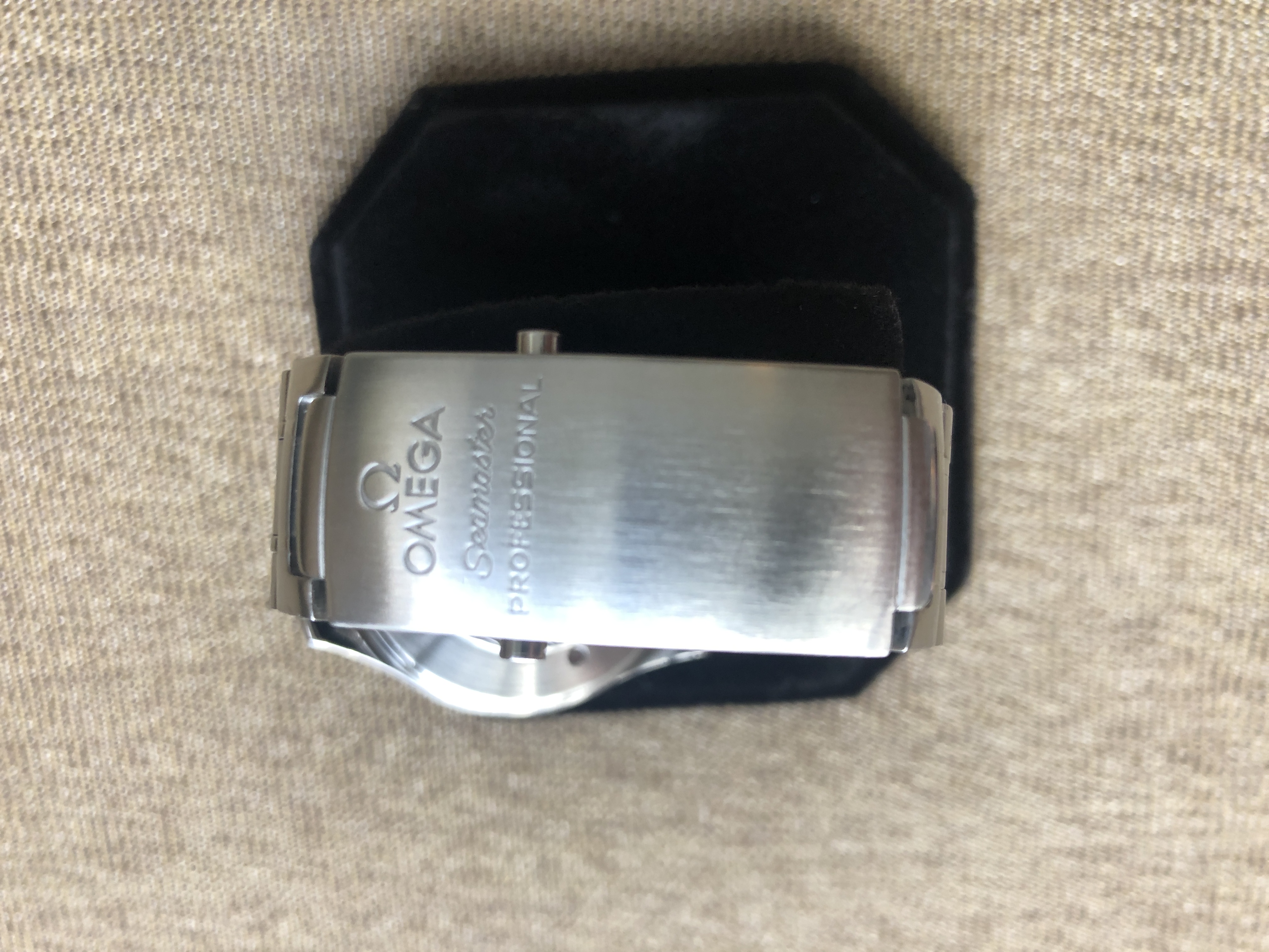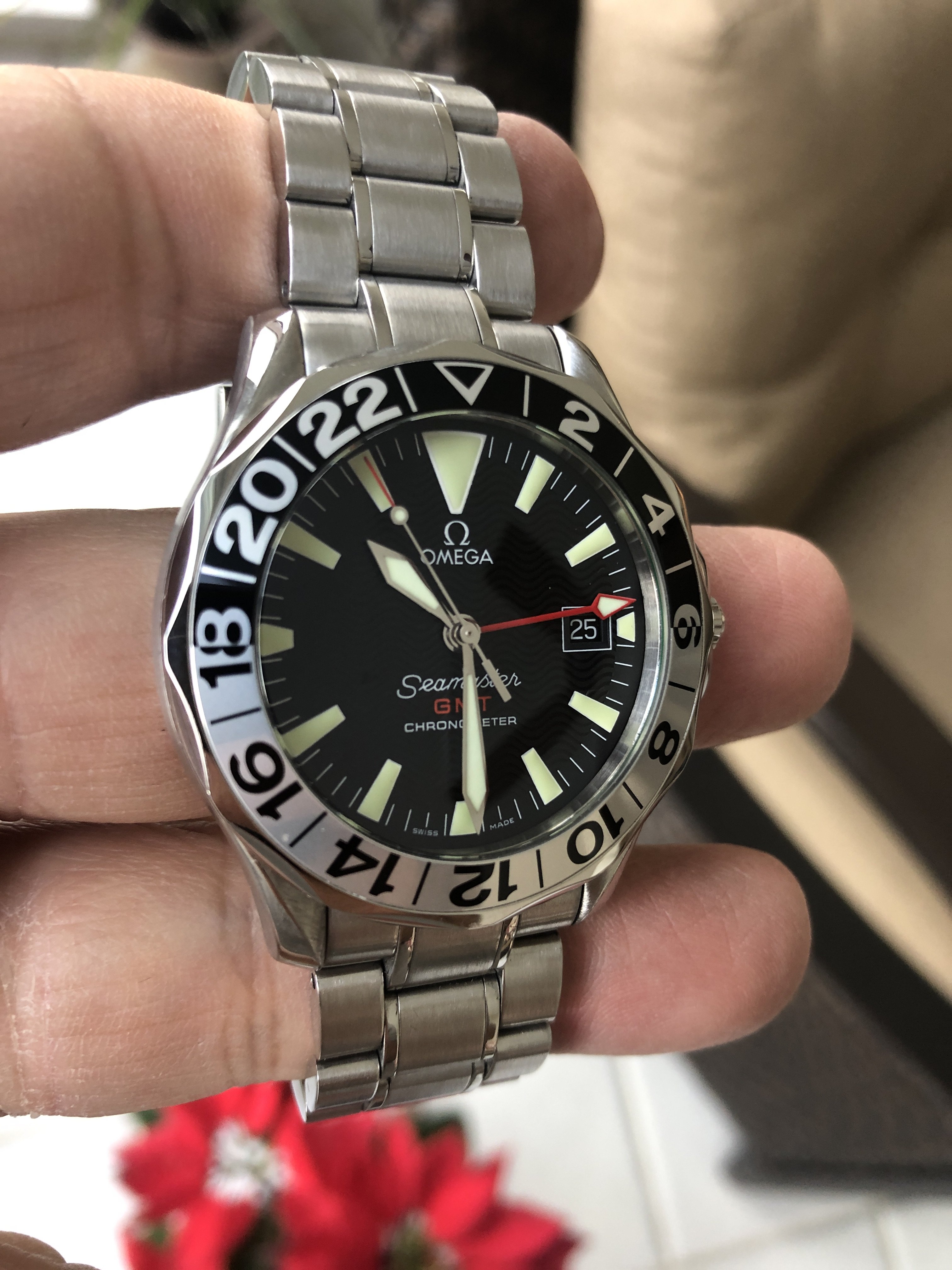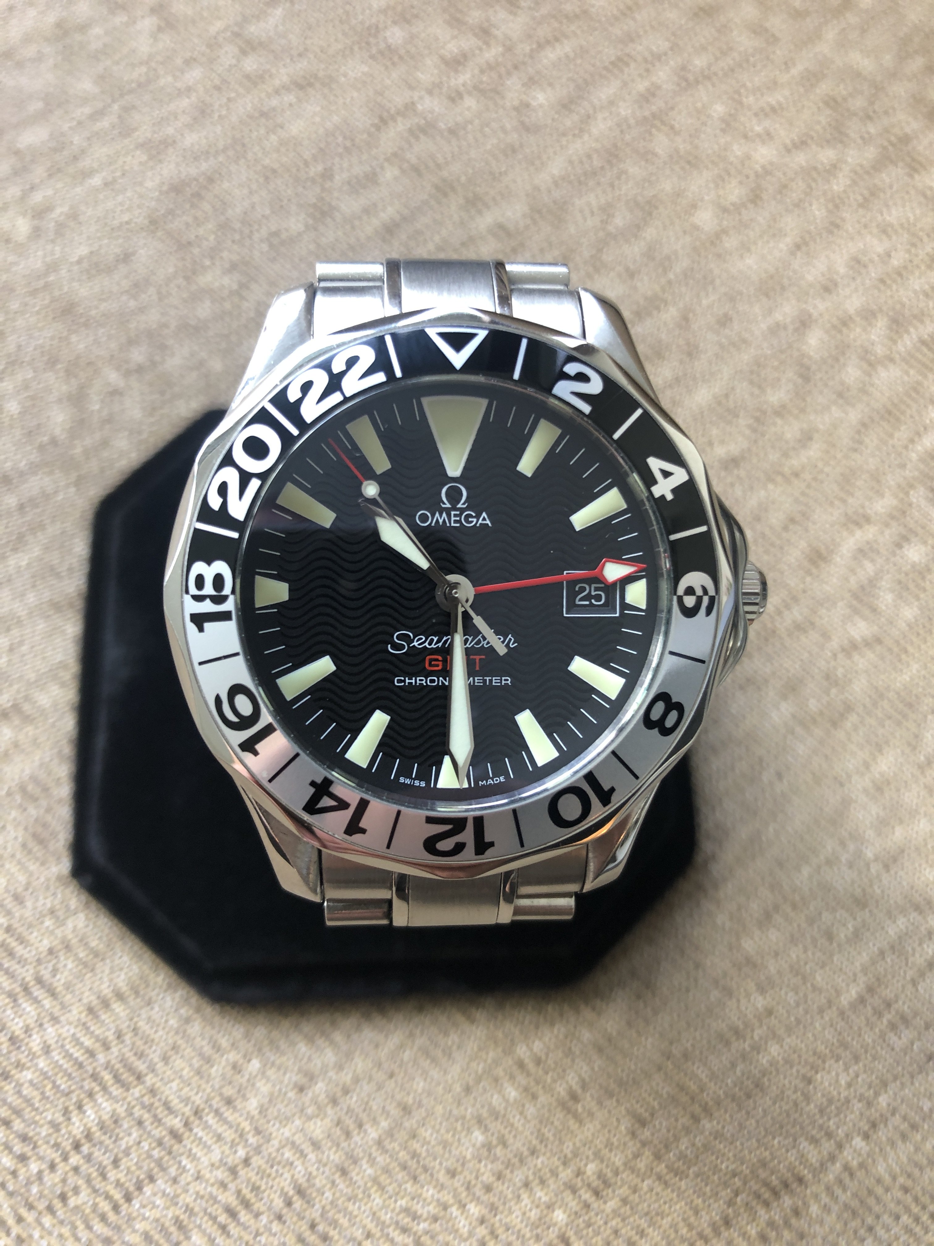 For sale is my Omega Seamaster 300 GMT 50th Anniversary watch. This watch is in excellent condition all around. Perfect glass. No scratches or marks. Wore sparingly. Comes with it's original Speedy-style bracelet. Easily fits a 7.5" wrist. The only down side is that there is no box or papers. $1850 shipped and insured anywhere in the US.