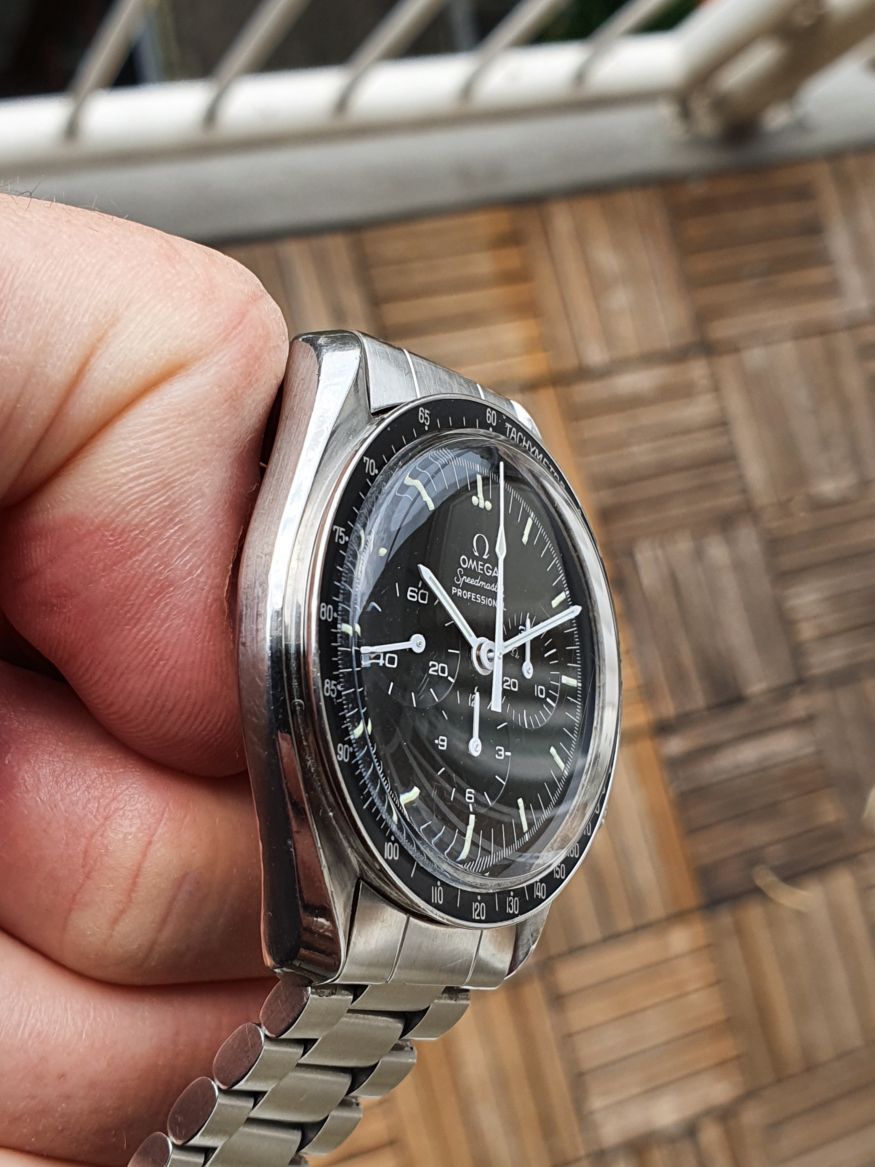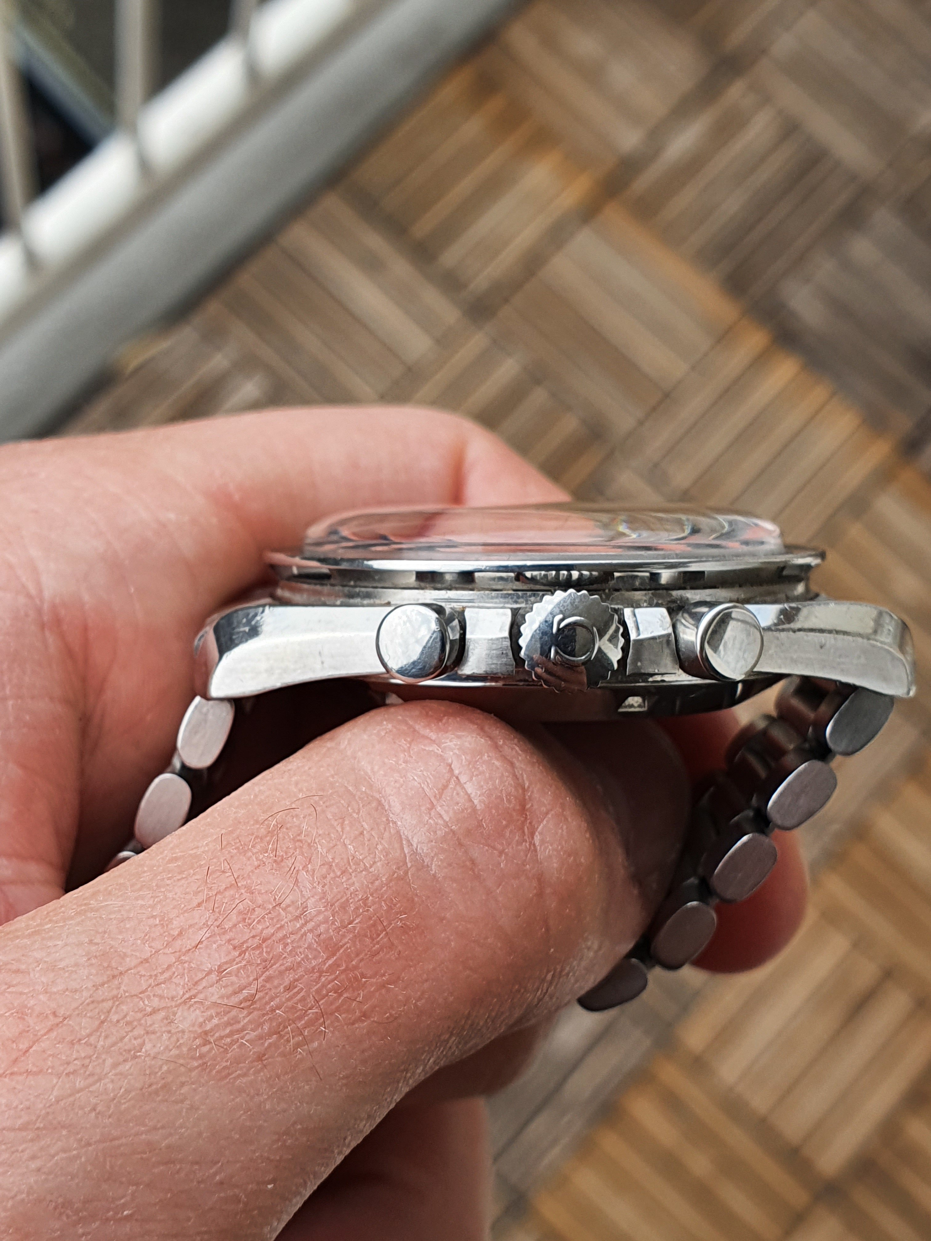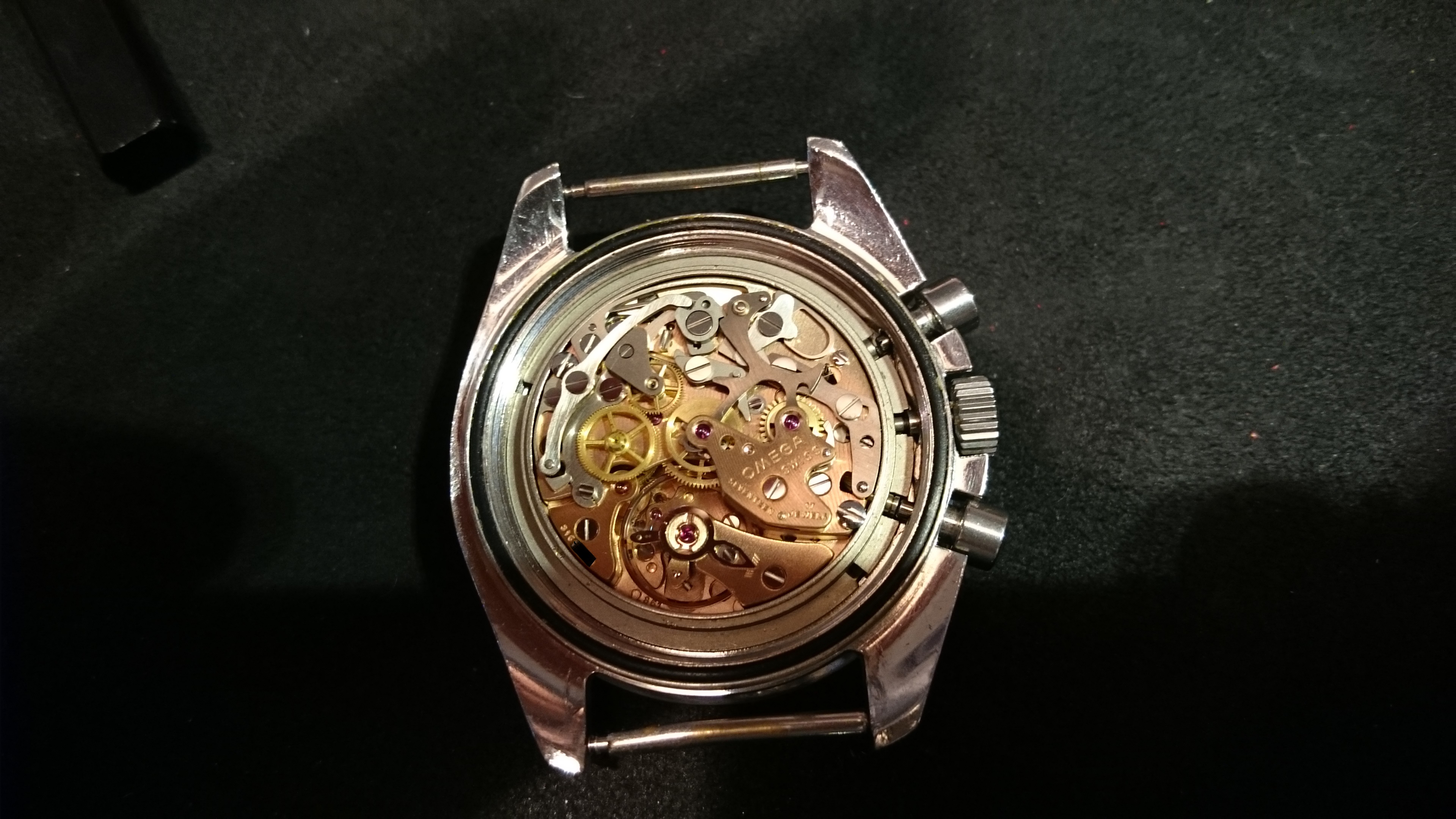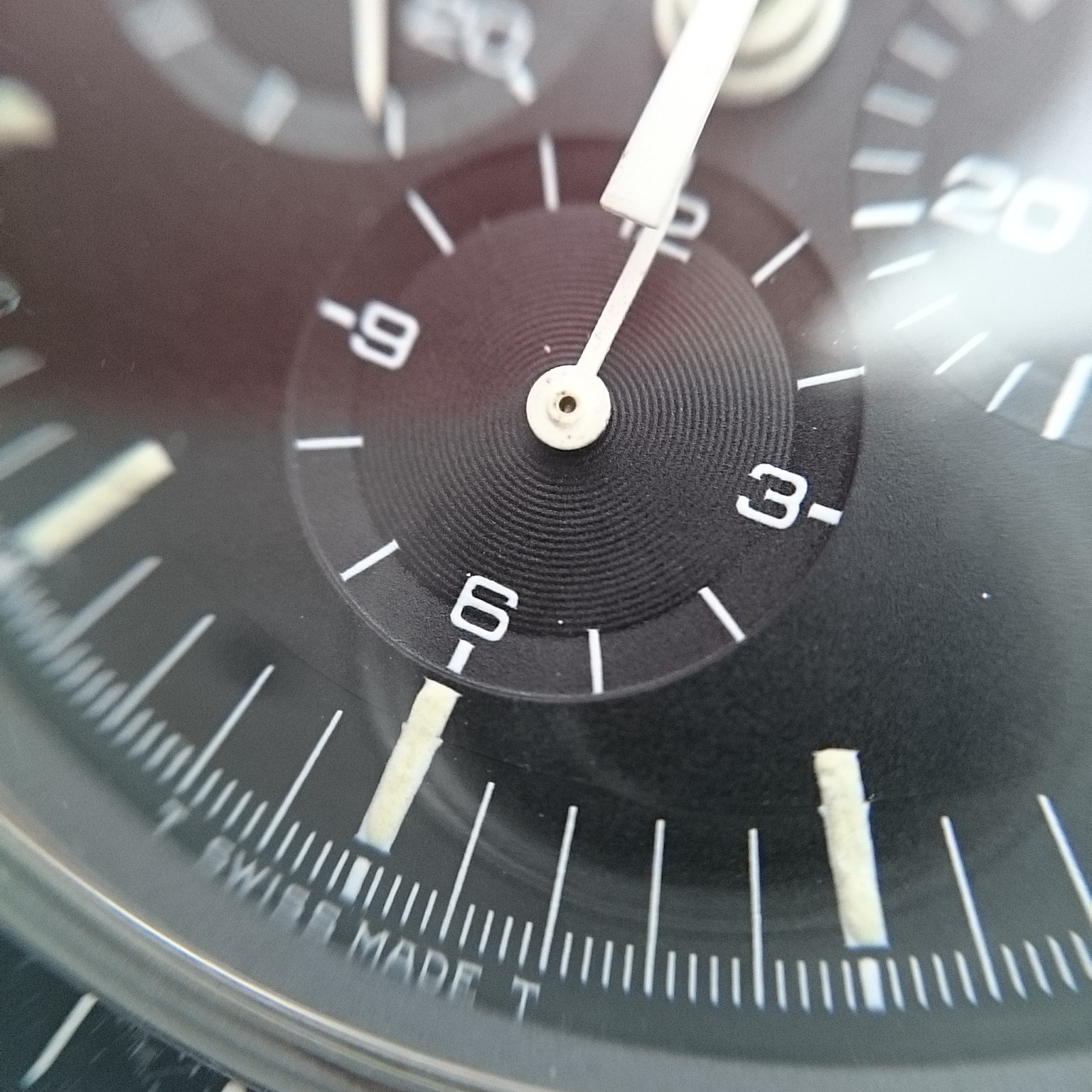 With the service last year my watchmaker 'damaged' the minute hand (at the center where you attach the hand a very small chip of the white paint of the second hand was damaged), new period correct hands were put on. Original hands are included. Photo's outside are with the new hands (made them today, May 10th), other pictures are with old hands.
