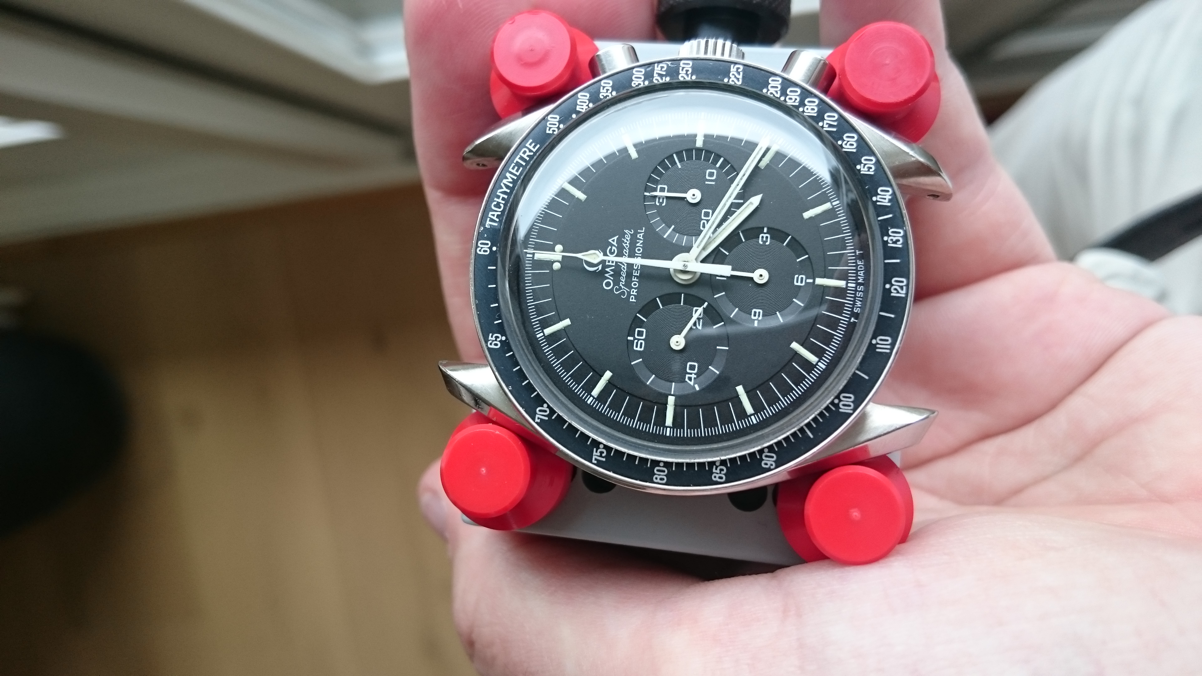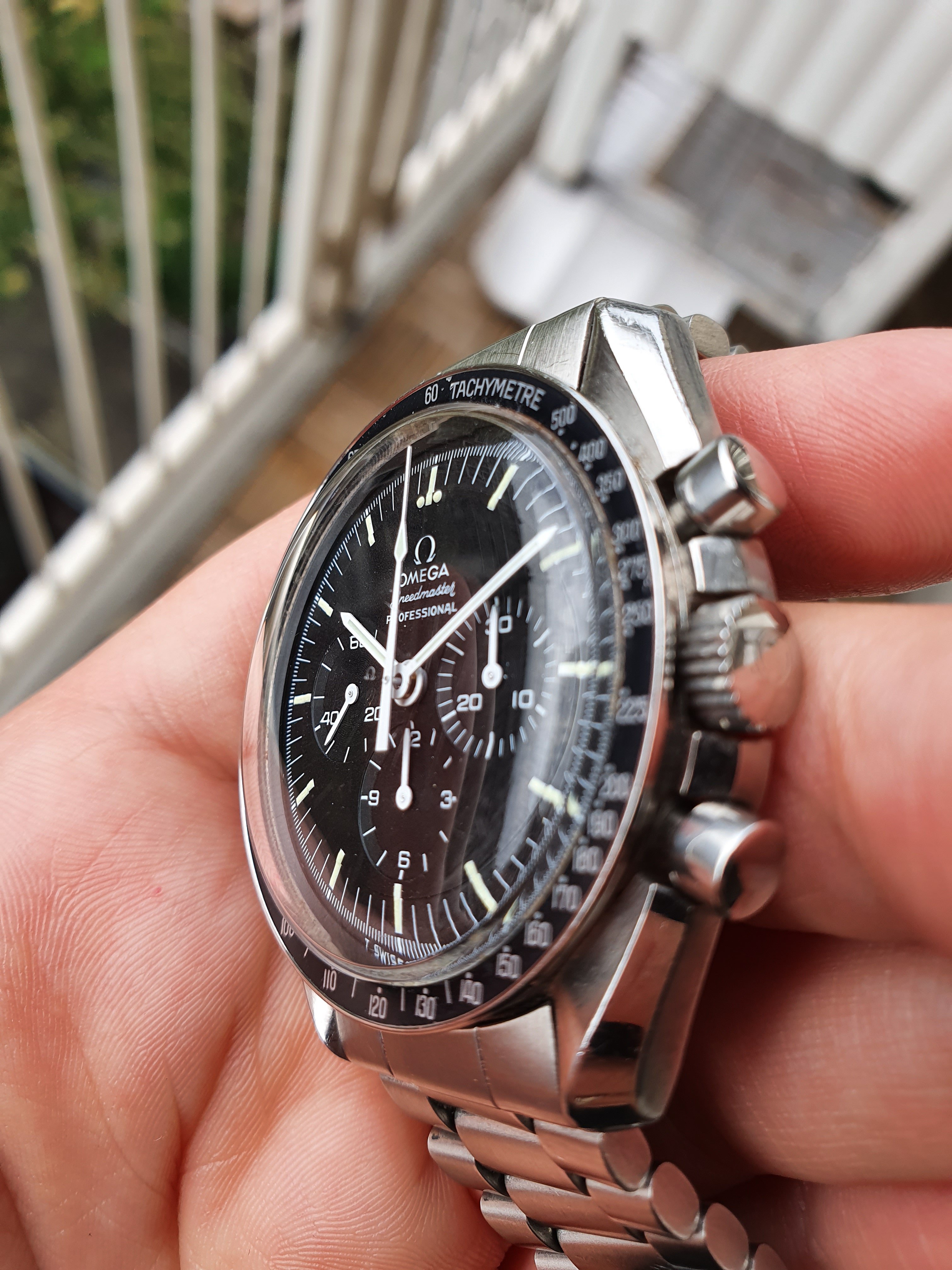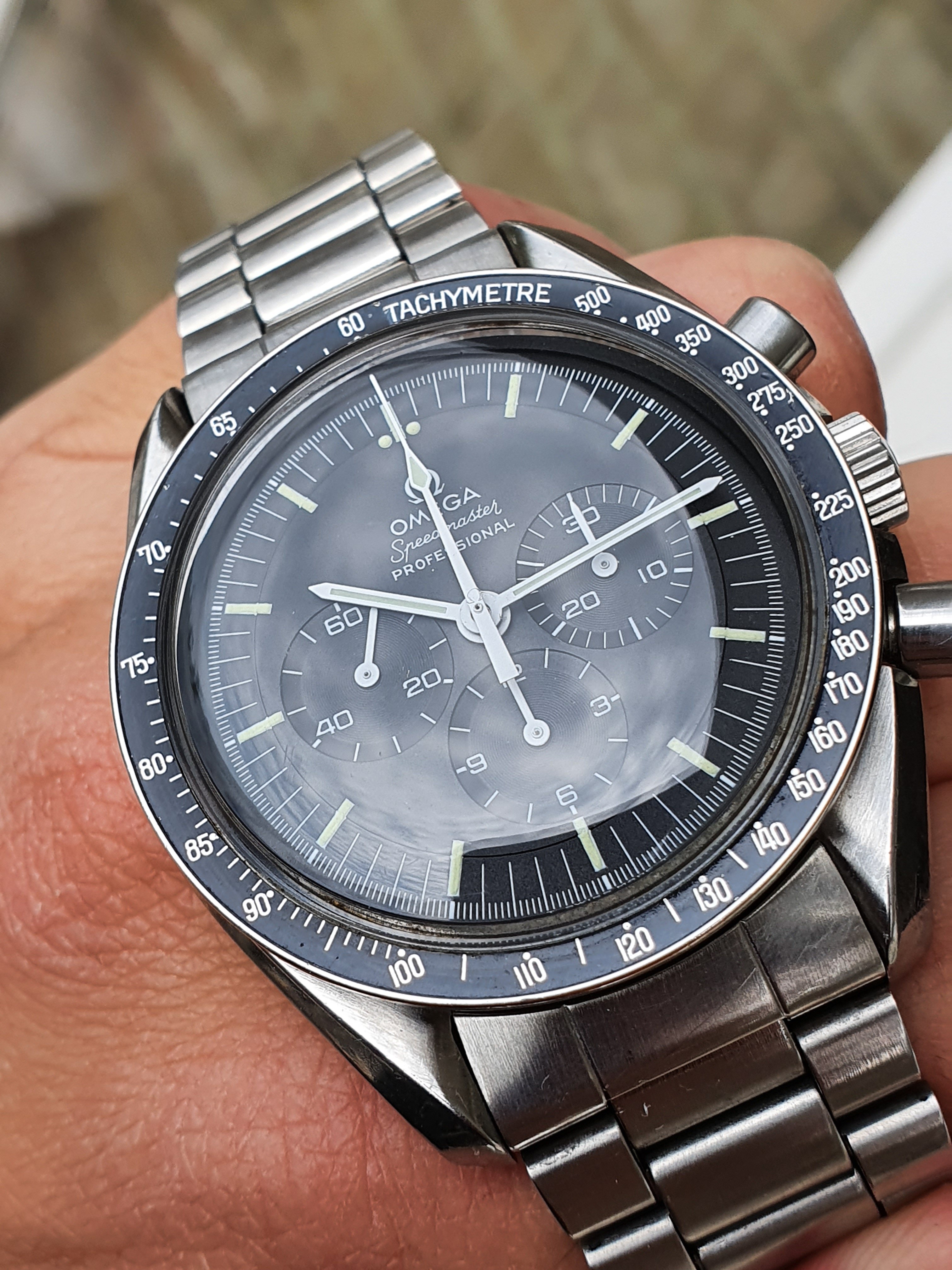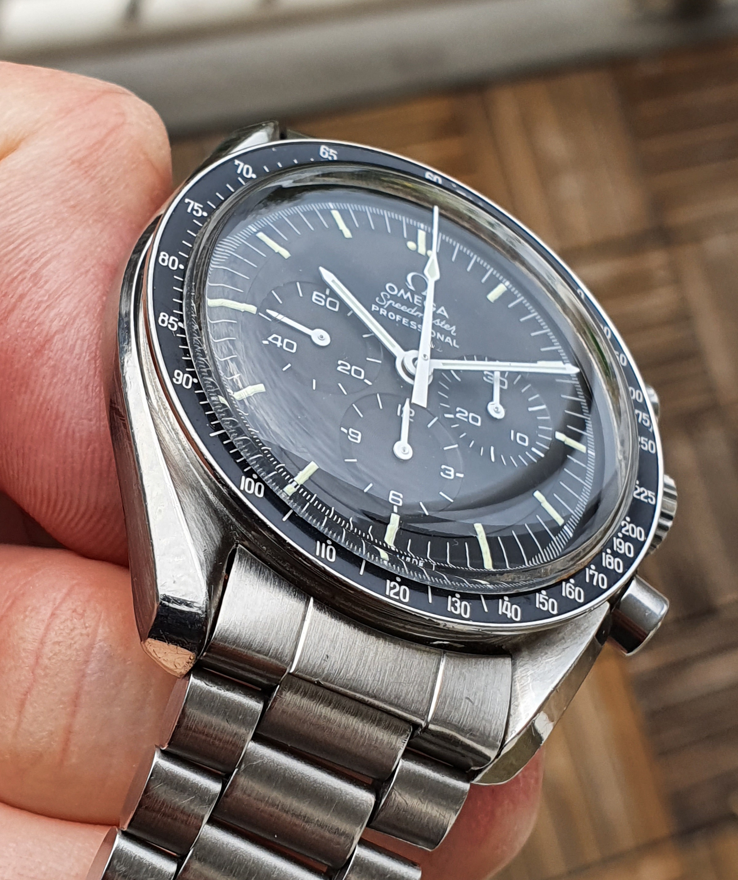 With the service last year my watchmaker 'damaged' the minute hand (at the center where you attach the hand a very small chip of the white paint of the second hand was damaged), new period correct hands were put on. Original hands are included. Photo's outside are with the new hands (made them today, May 10th), other pictures are with old hands.