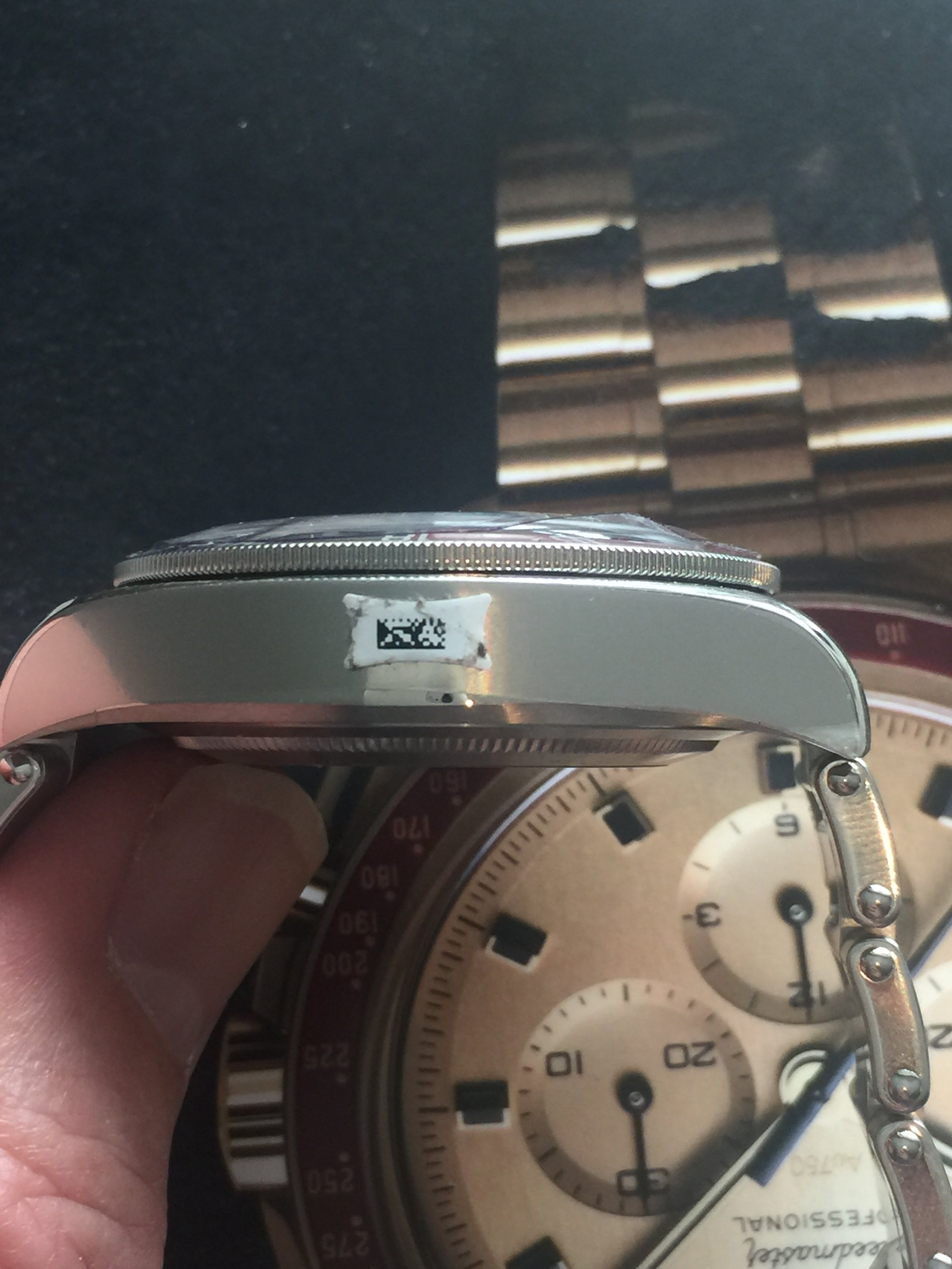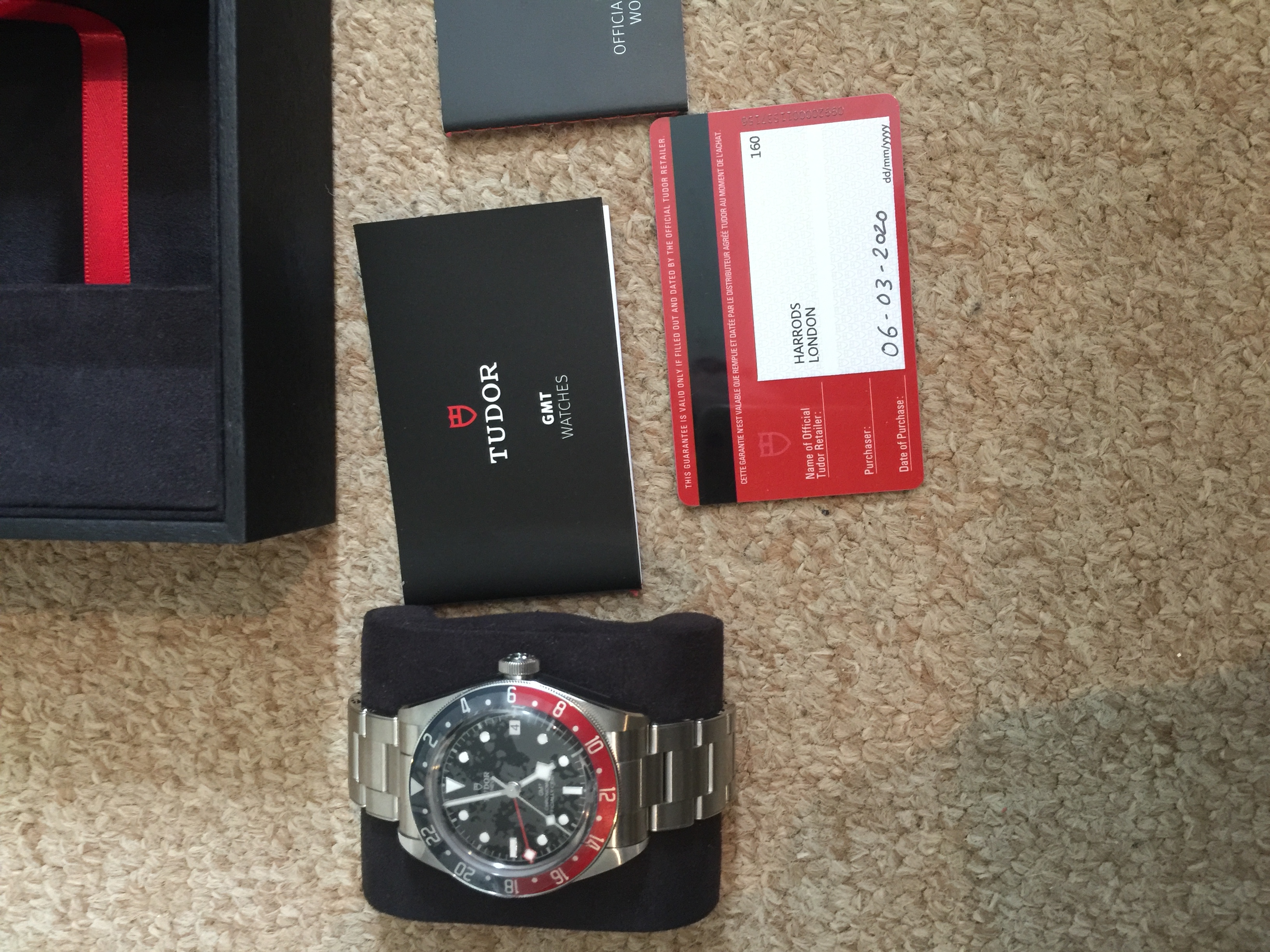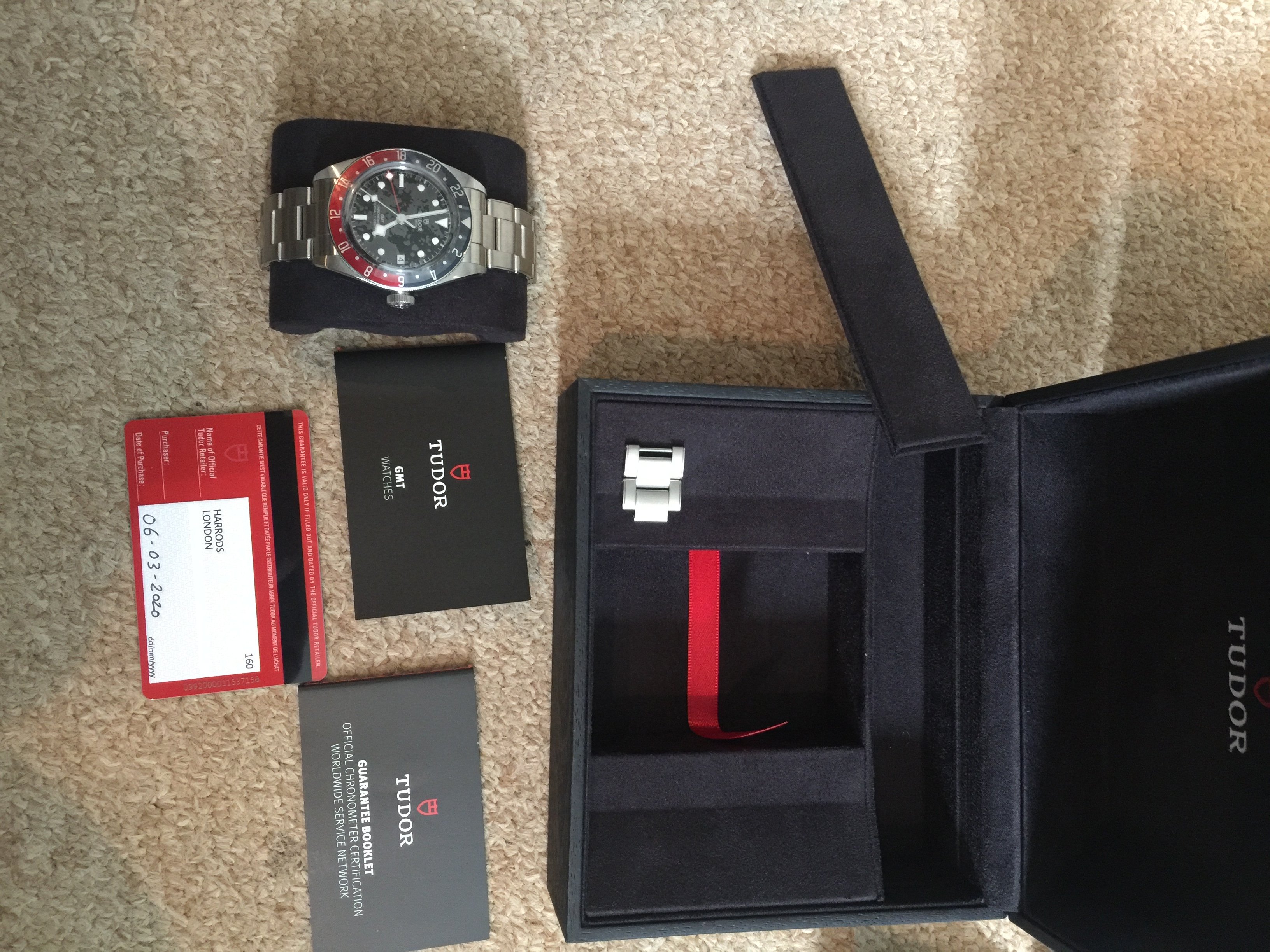 Bought by me from Harrods on the 6th of March this year. So balance of five year warranty. The bracelet has been sized in store. All stickers are present and it has been tried on once. Not been worn for more than five minutes. Naturally is a full set with spare links, box, manual and cards etc. and is unmarked, so as new.