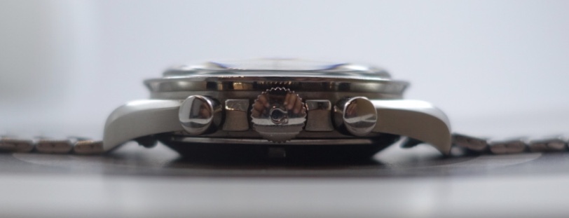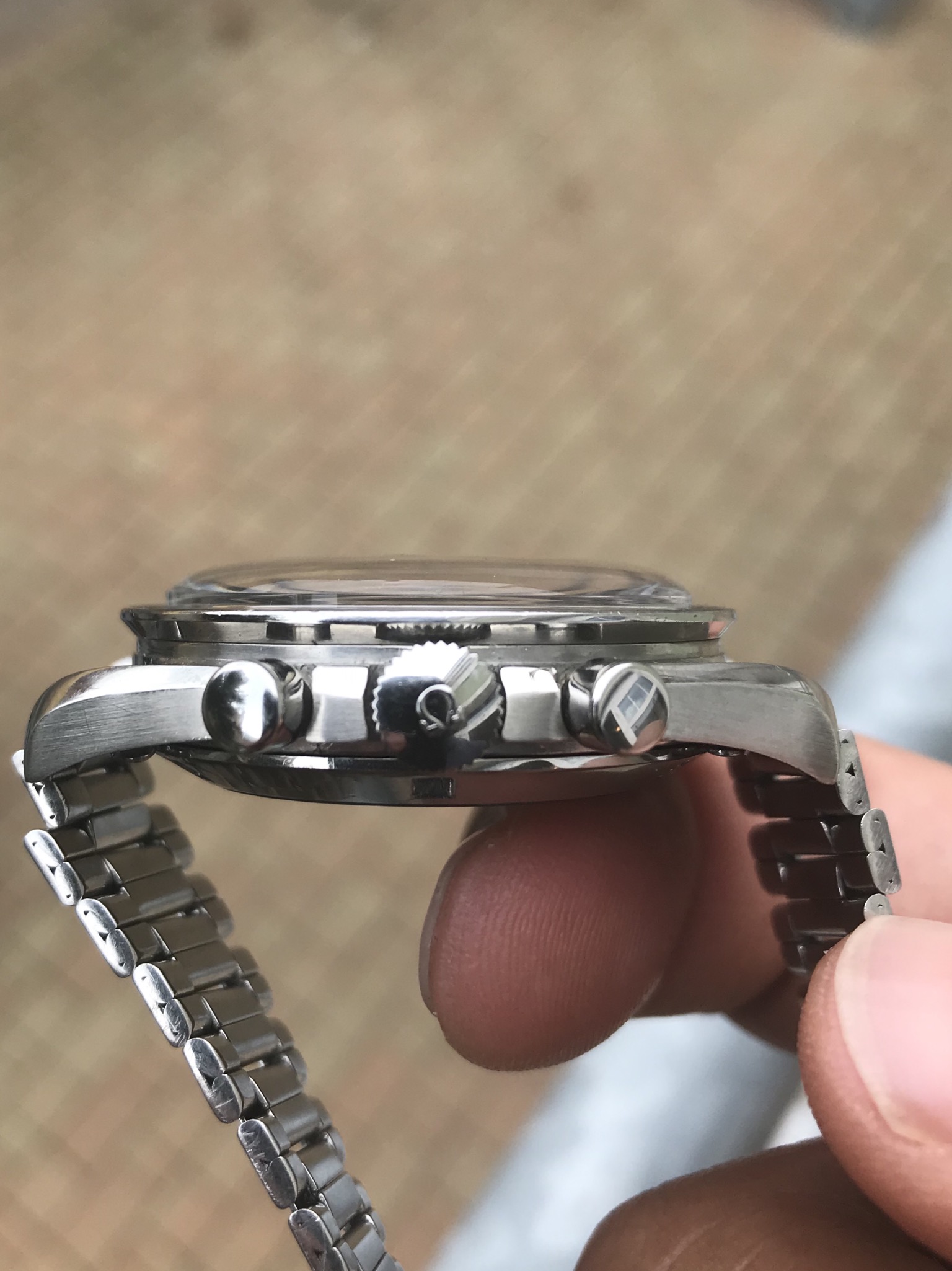 Crown & Pushers: Crown has the smaller Omega logo, which according to MWO is a configuration that came on -67. Both crown & pushers are period correct and in excellent shape.
