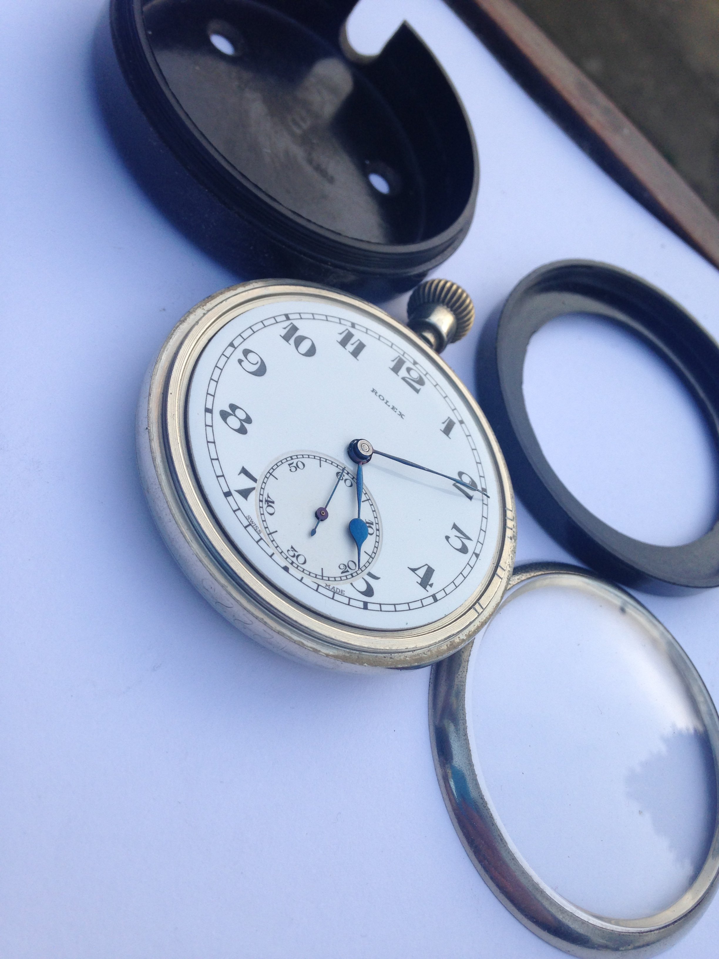 This is a less common Rolex pocket style watch with original bakelite case. The watch has sat, unused, for some decades until it received a full service this month. The mainspring and hairspring have both been replaced while everything else is original. There are no cracks or hairlines in the dial, though there are a few age related marks. Hands are original. It goes without saying that nothing has been polished. The watch is perfectly straight on the timeograph and is currently running just a few seconds a day slow.