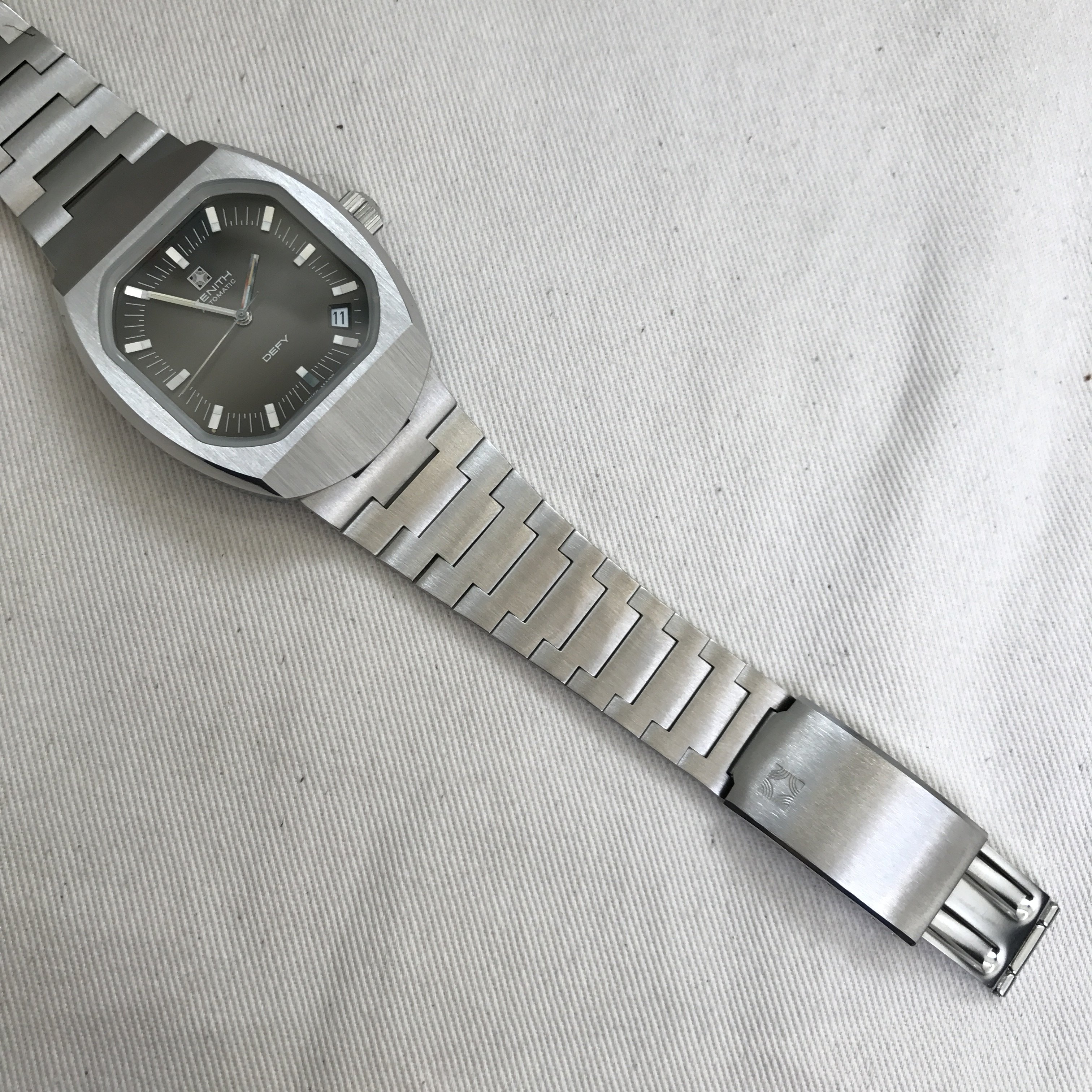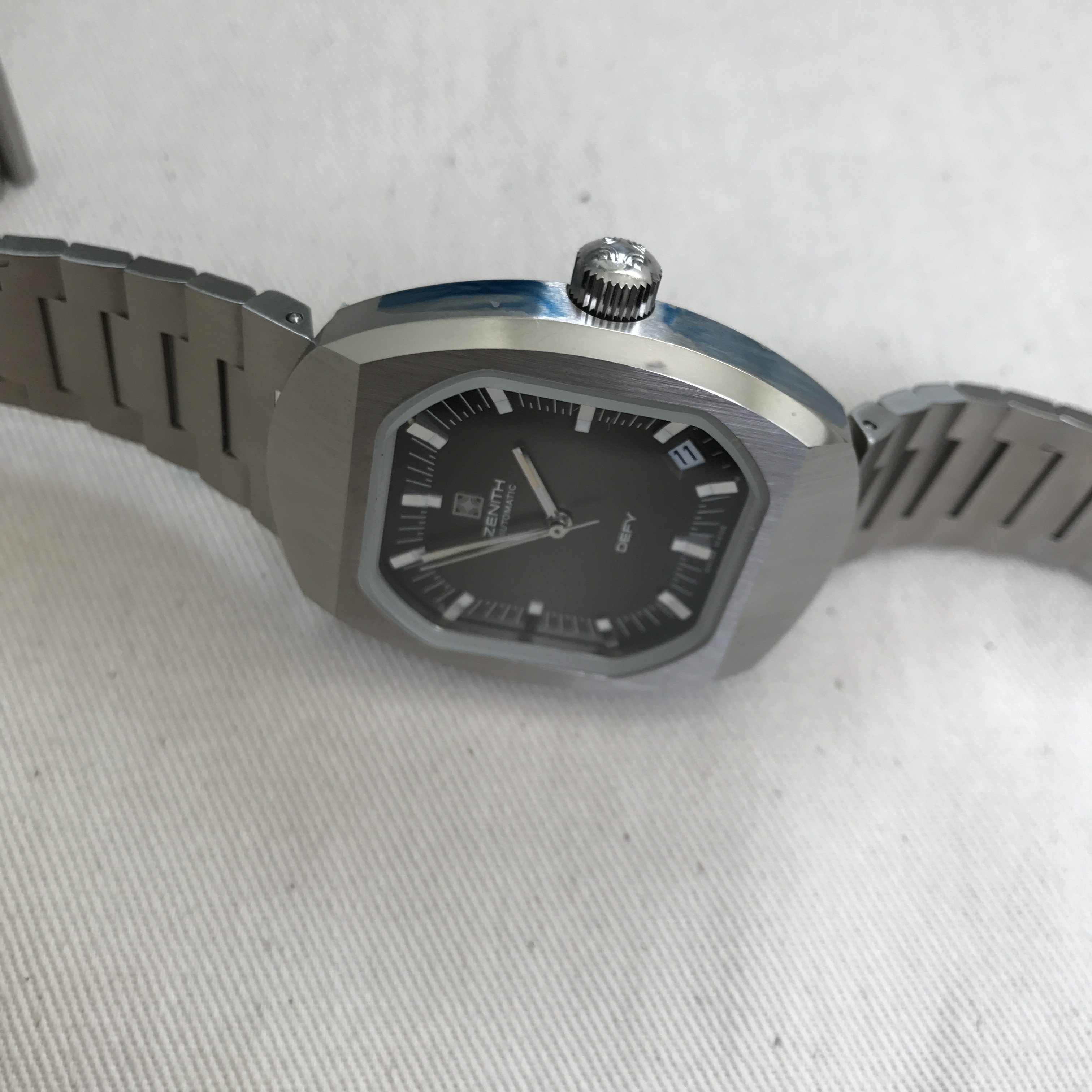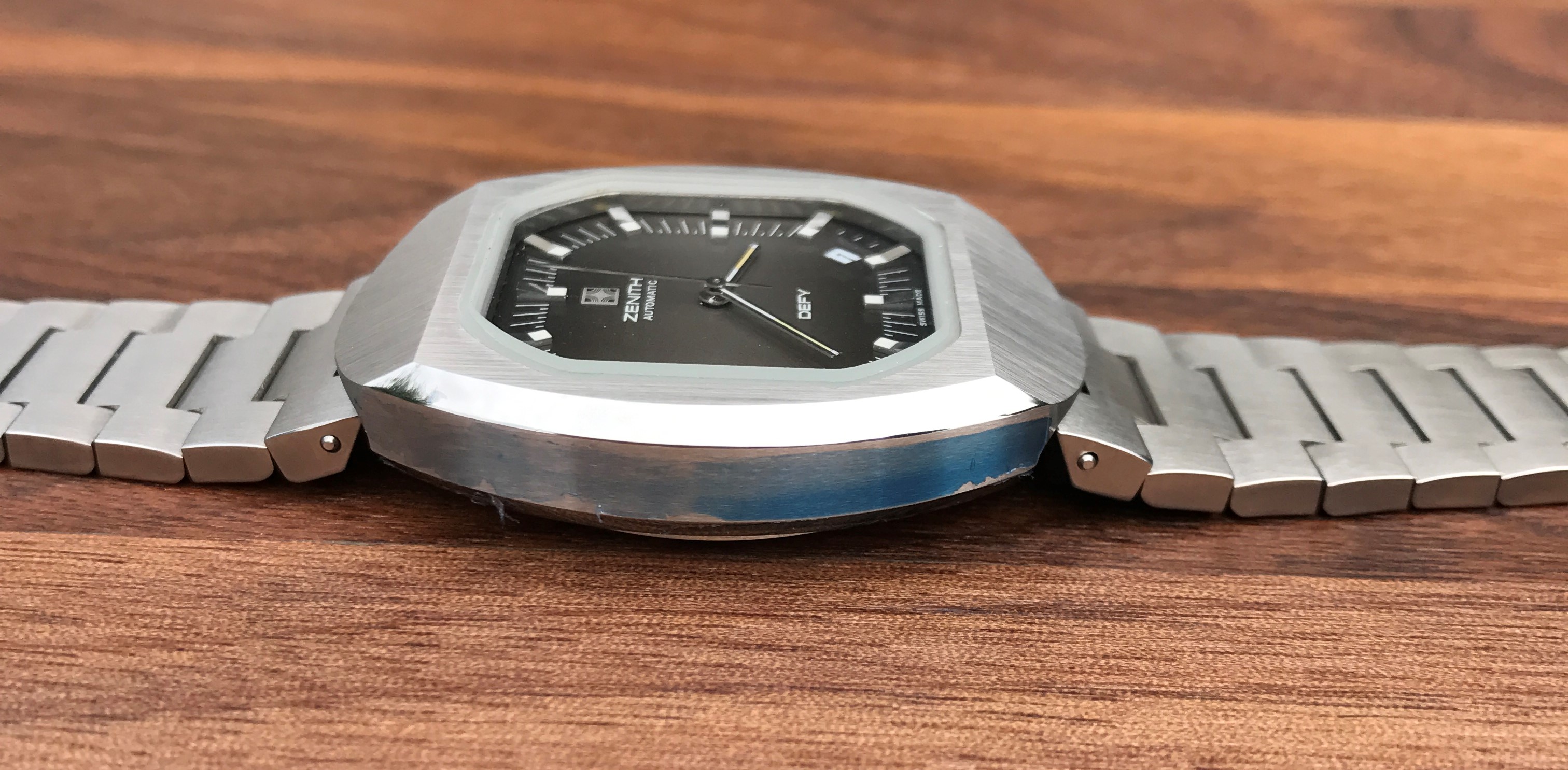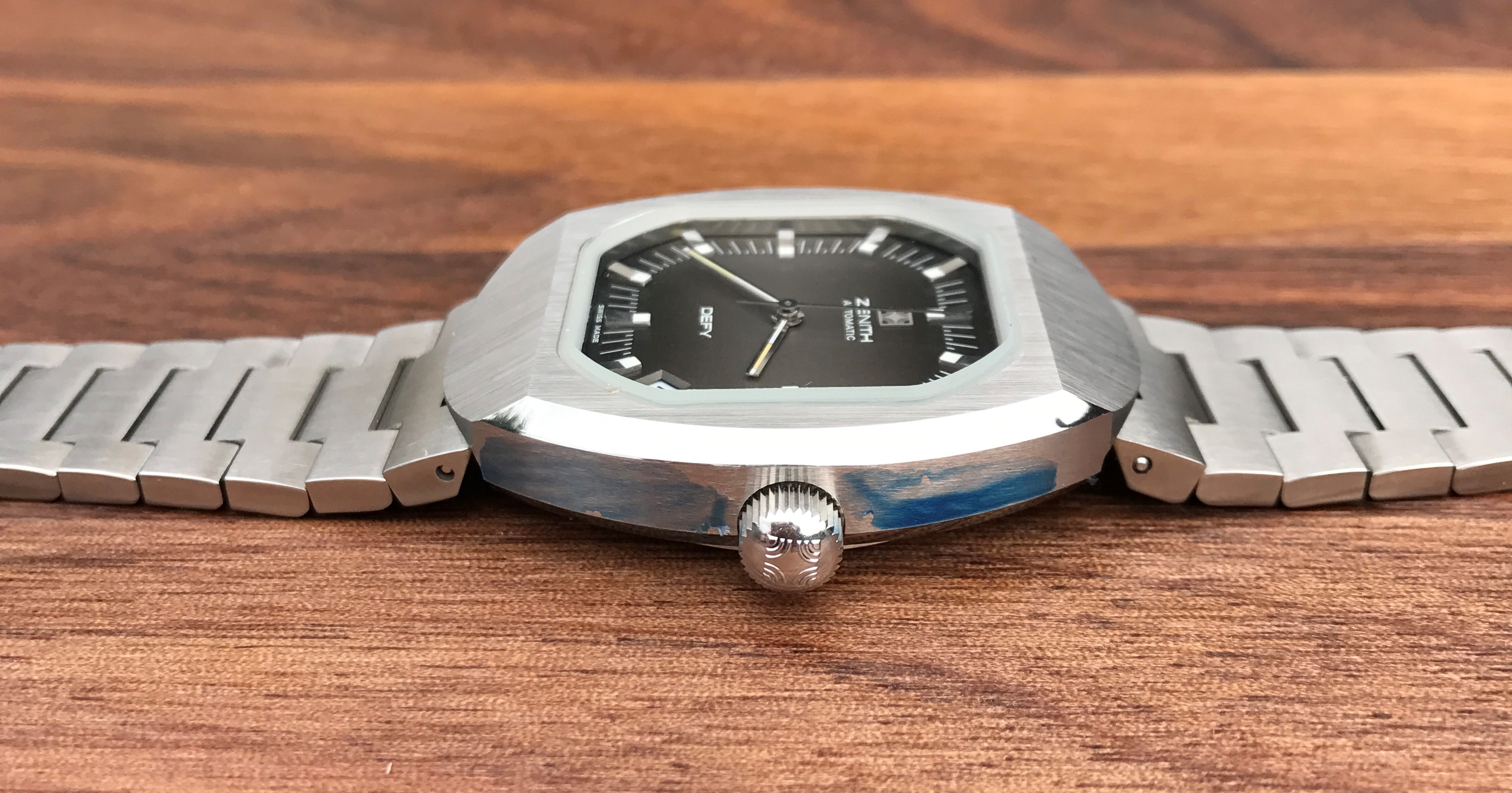 Bracelet: Incorrect bracelet for this model. It is an original Zenith branded from the same era but was not shipped on this particular Defy model. Due to being incorrect the bars are loose, it catches on the top lug and requires a little fiddling to release it, this has caused a couple of tiny nicks on either side of the top lug(see photos). The bottom lug is unaffected.