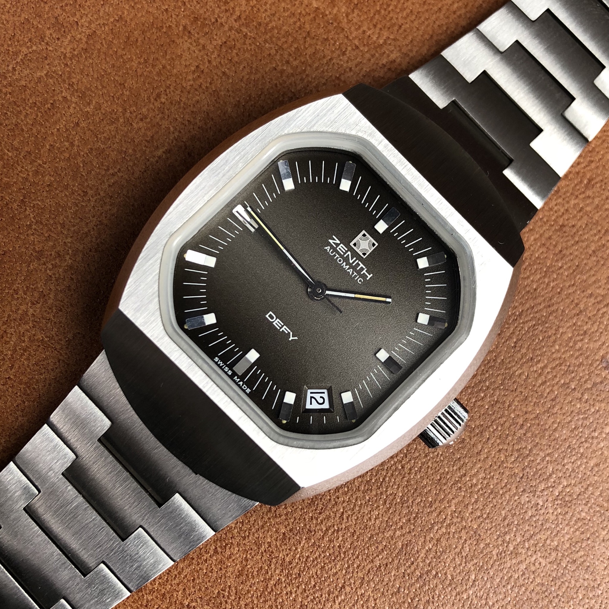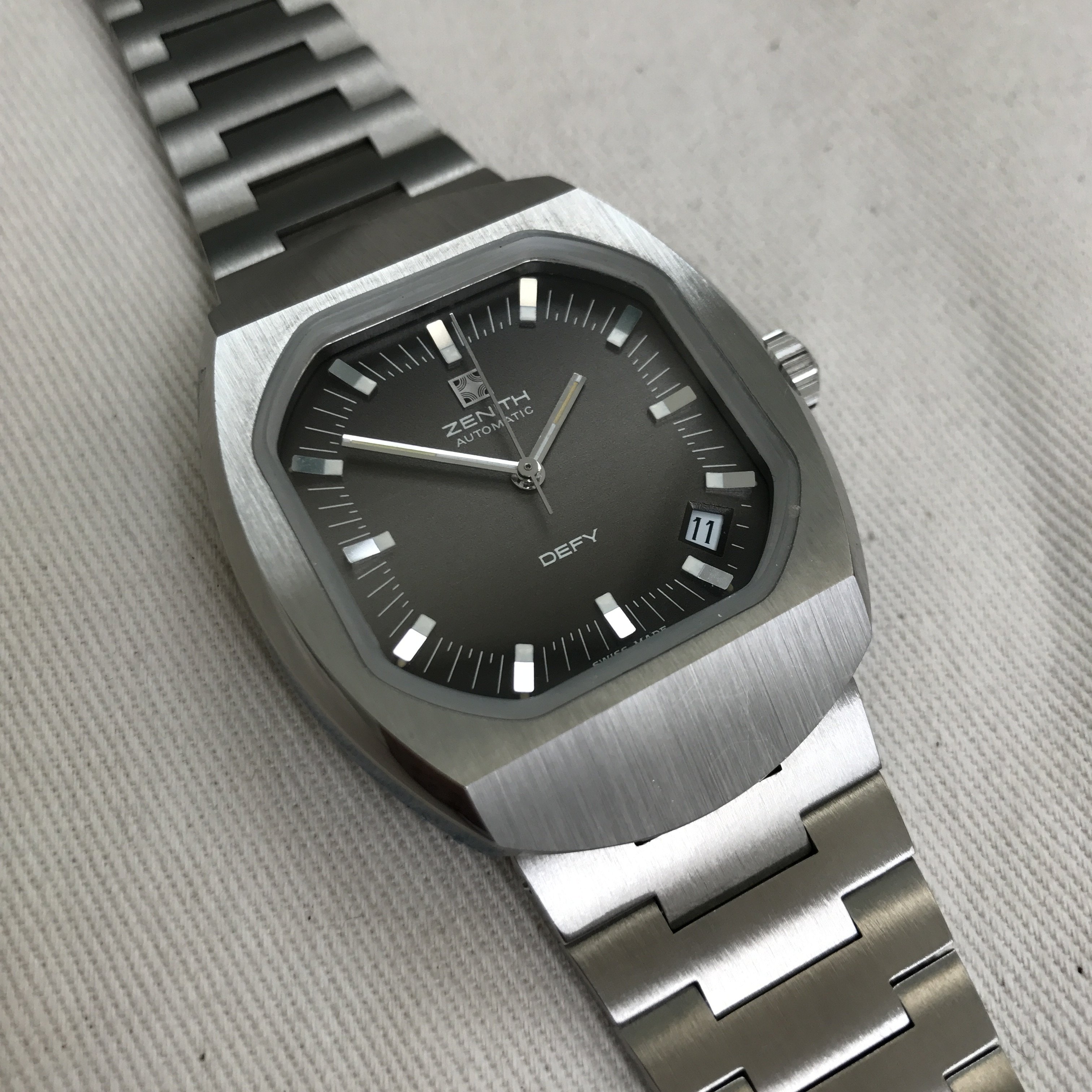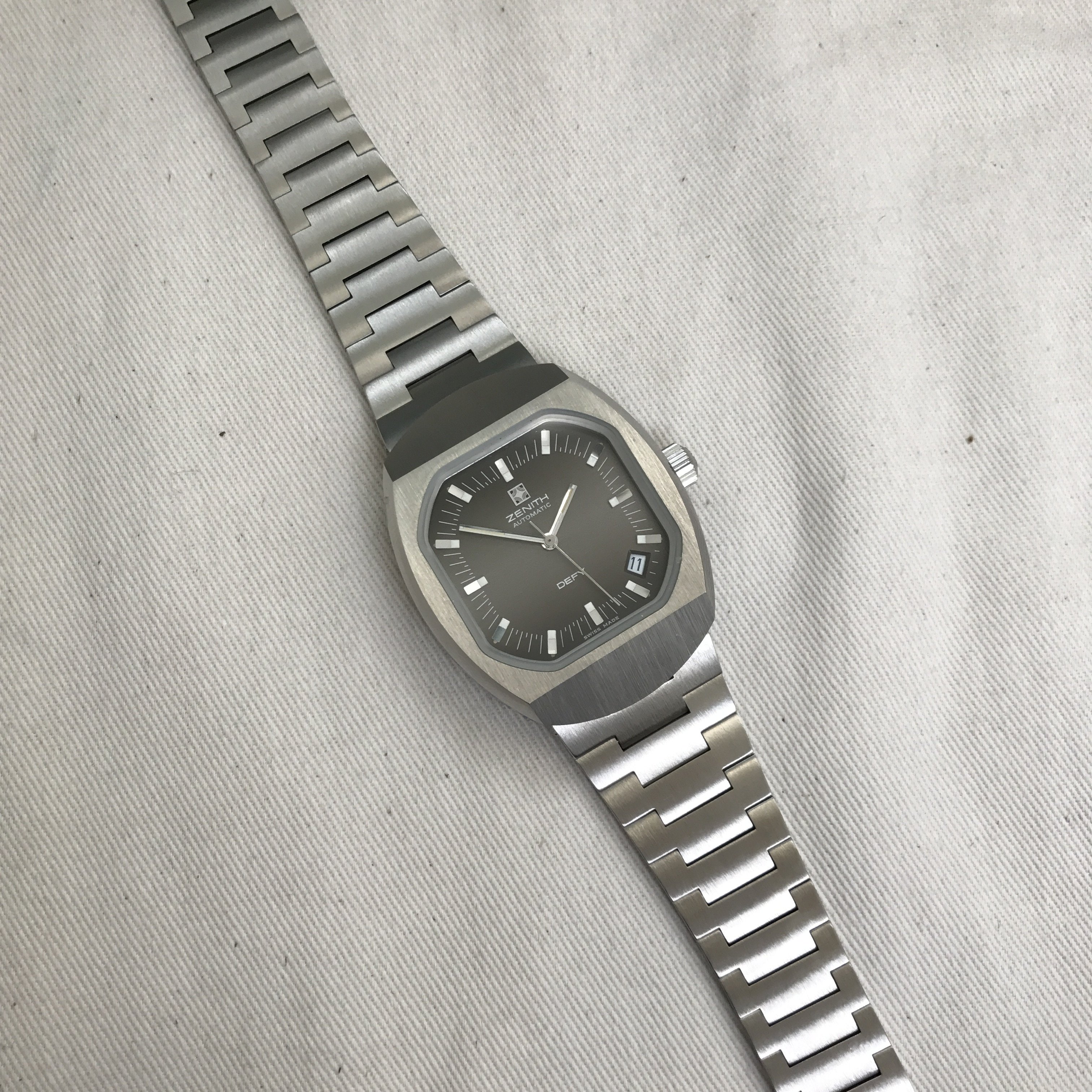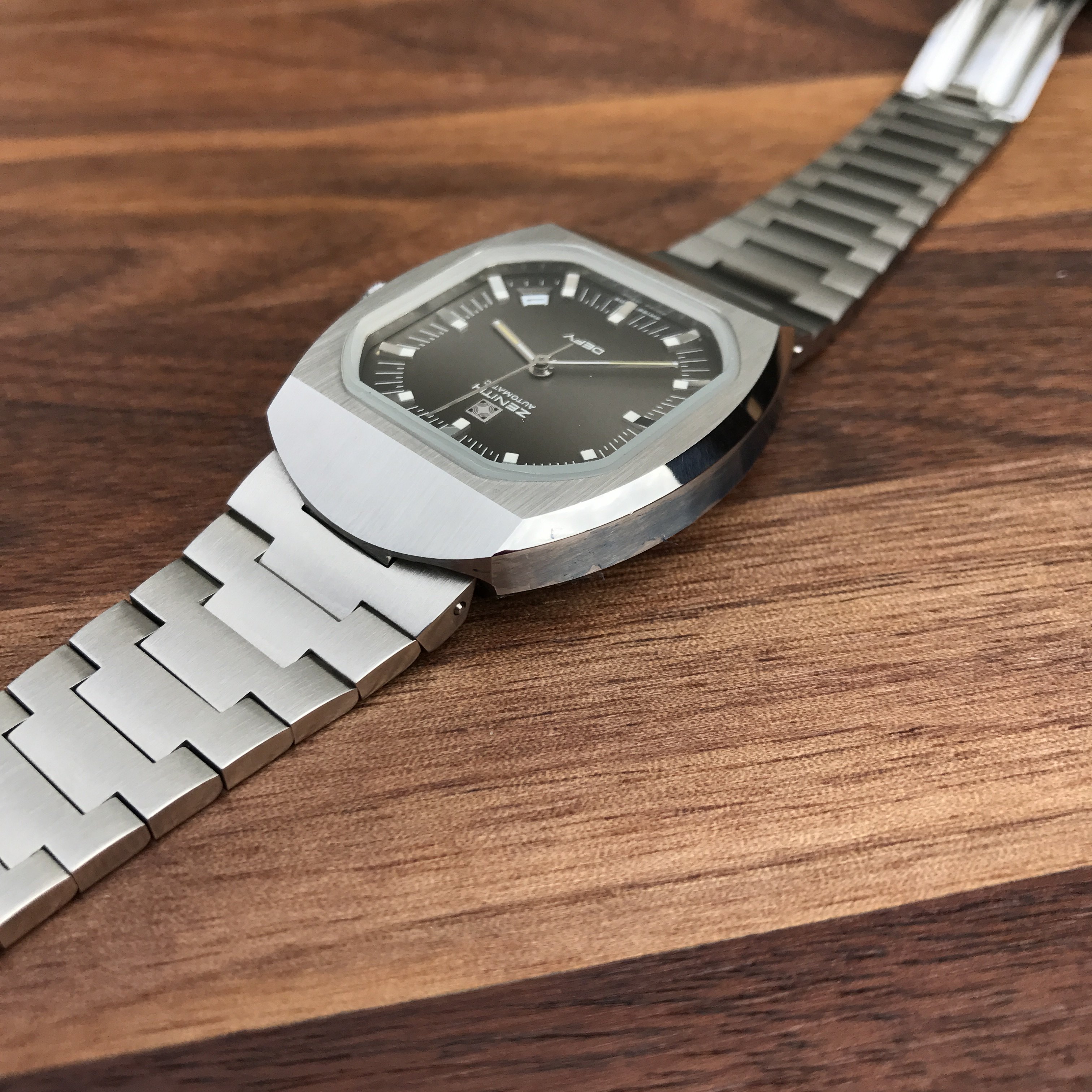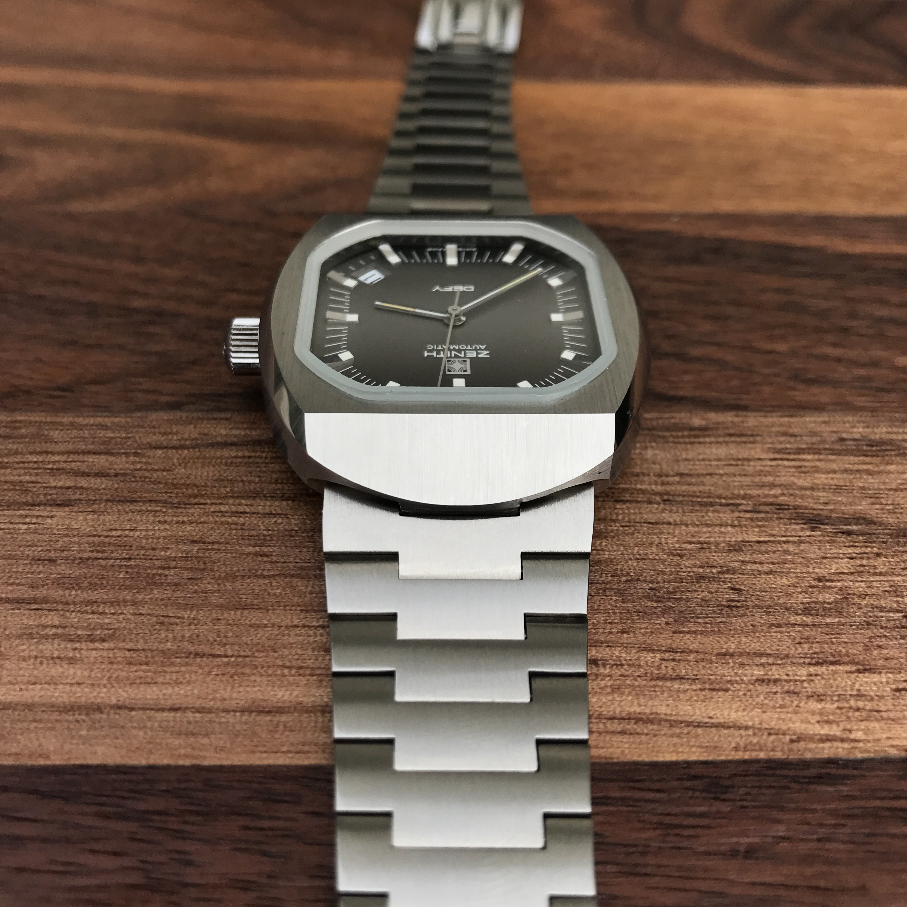 Bracelet: Incorrect bracelet for this model. It is an original Zenith branded from the same era but was not shipped on this particular Defy model. Due to being incorrect the bars are loose, it catches on the top lug and requires a little fiddling to release it, this has caused a couple of tiny nicks on either side of the top lug(see photos). The bottom lug is unaffected.