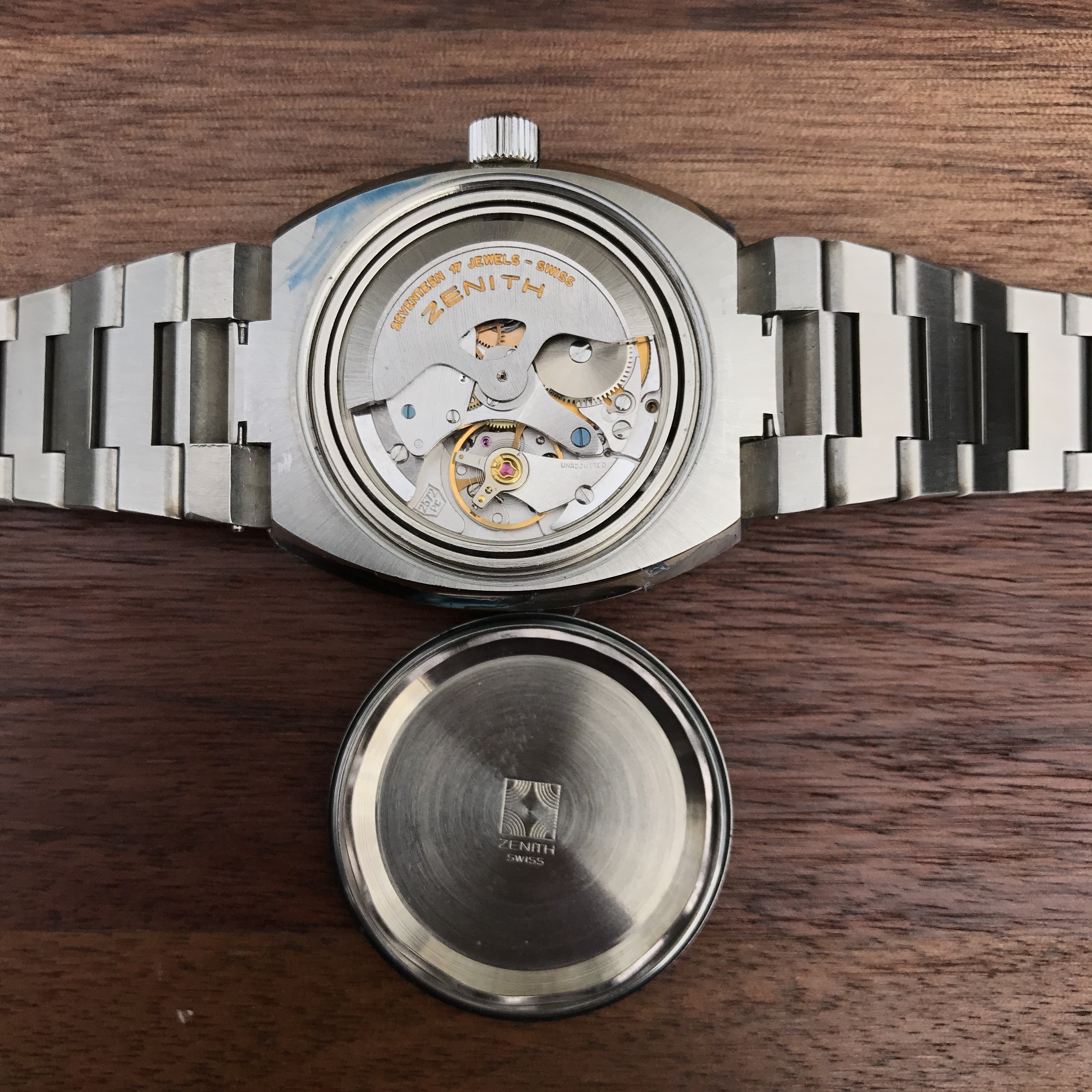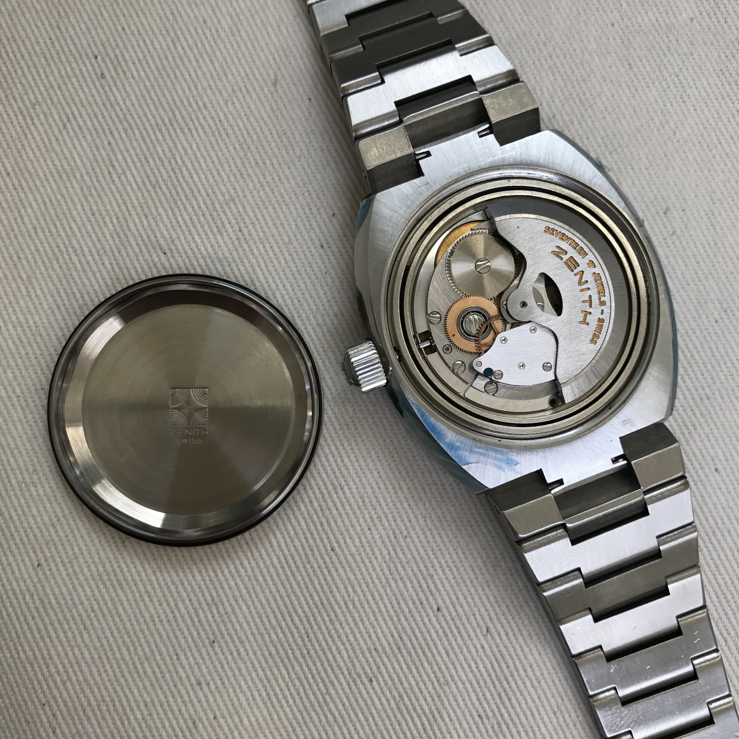 Case: 37mm stainless steel excluding crown. Lugs and edges are sharp, unpolished NOS. Zenith branded caseback with model reference number. Original signed Zenith screw down crown. The original protective coating jewellers wax is still on the sides and caseback. There is a small nick on both sides of the top lug where the bracelet meets the case (see photos).